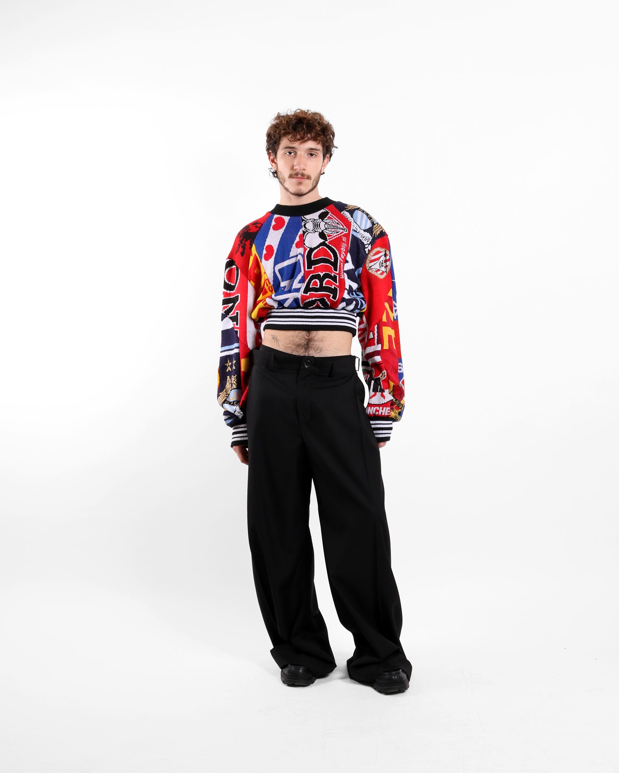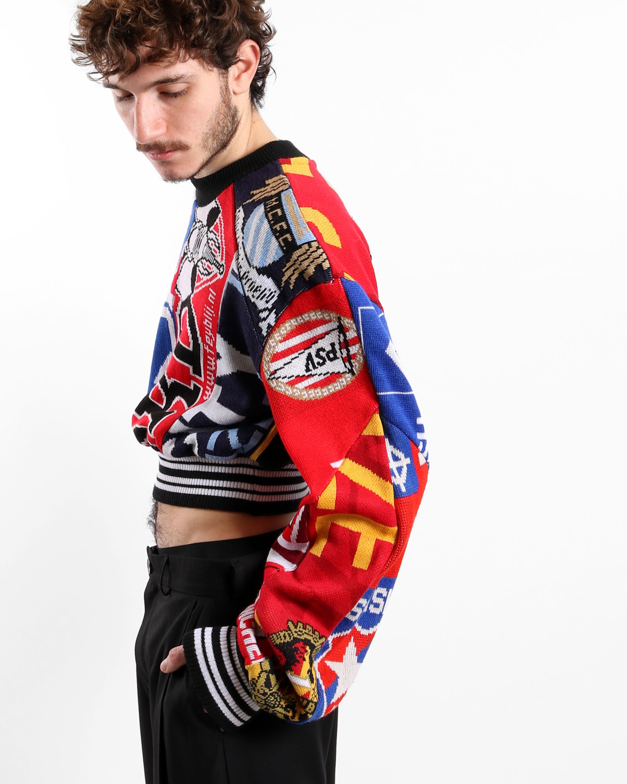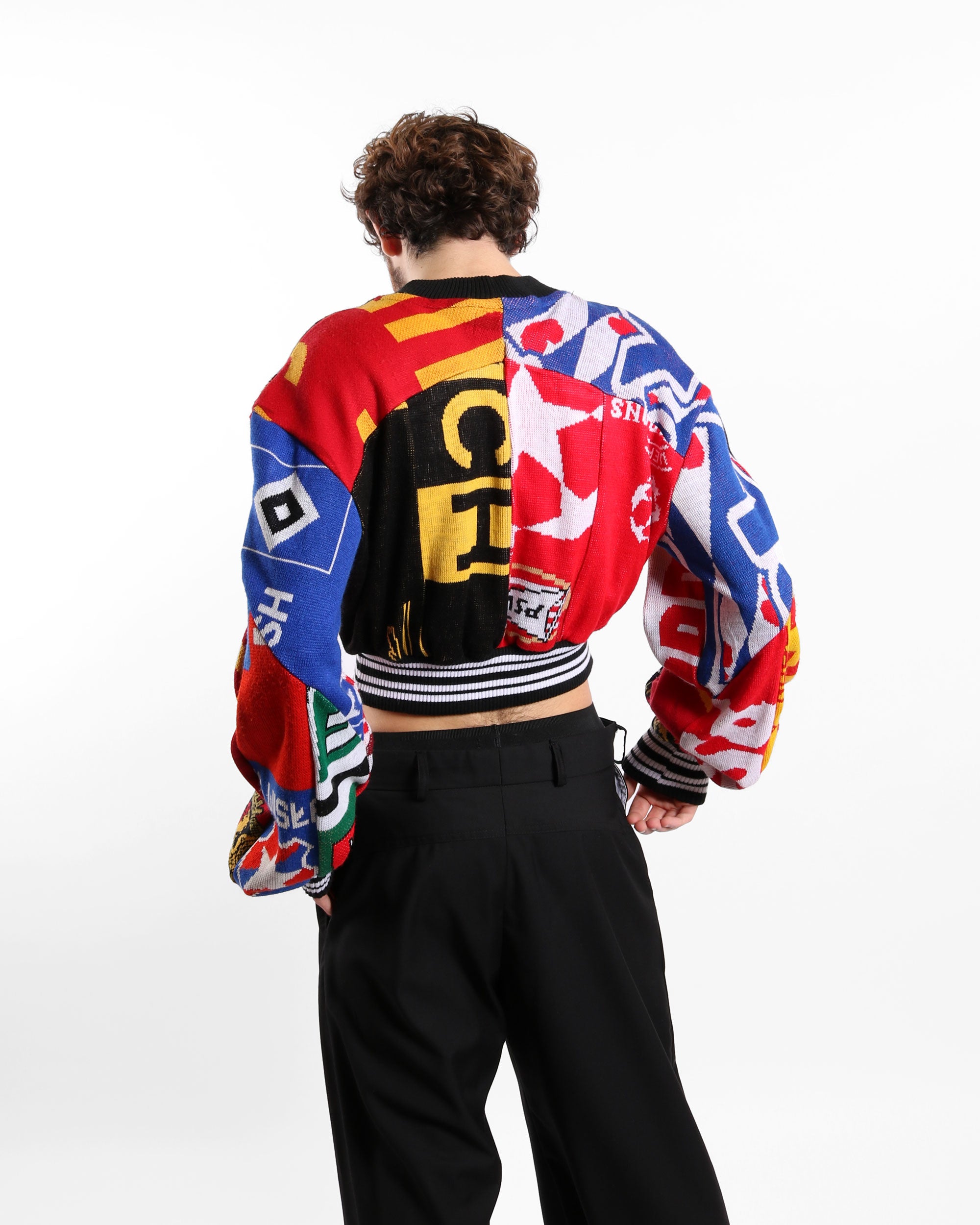 A cropped sweater crafted from up-cycled sports scarves, blending bold colors and patterns into a playful, one-of-a-kind design. Cozy yet statement-making, this sweater adds unique character to any outfit.