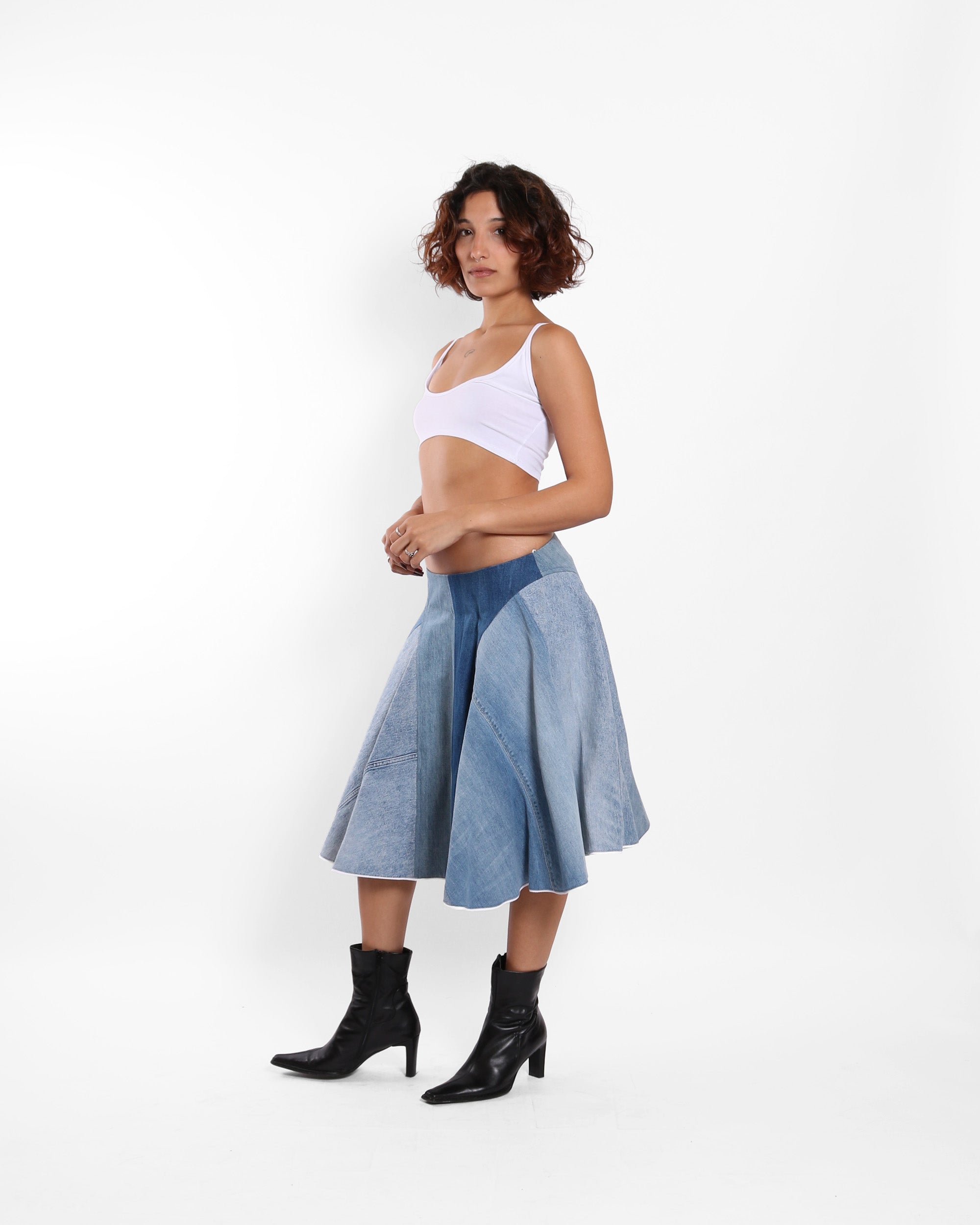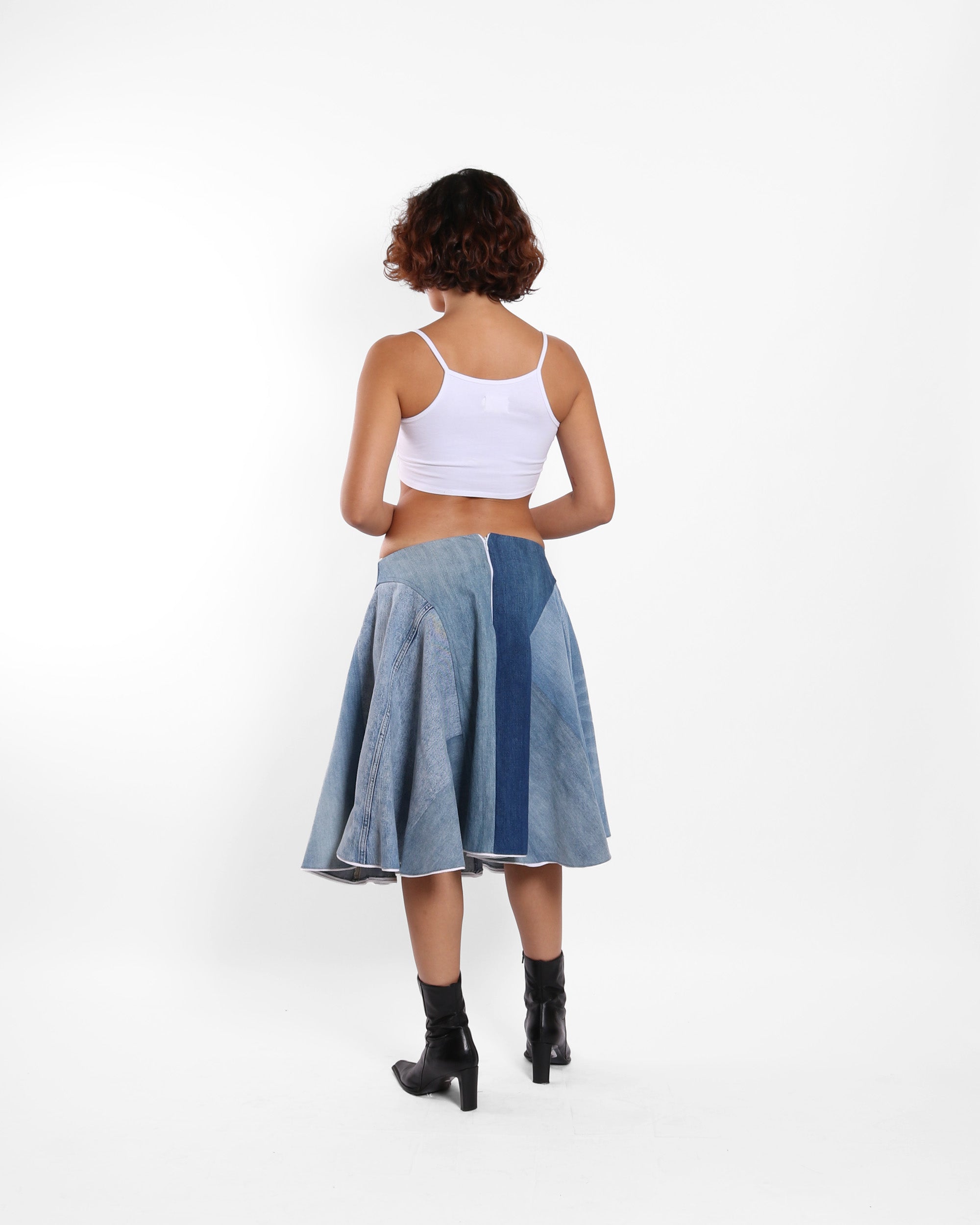 A flared midi skirt featuring rounded side cuts made from up-cycled denim  , sourced from souks across Lebanon and reimagined into a soft silhouette with a mid-rise fit.