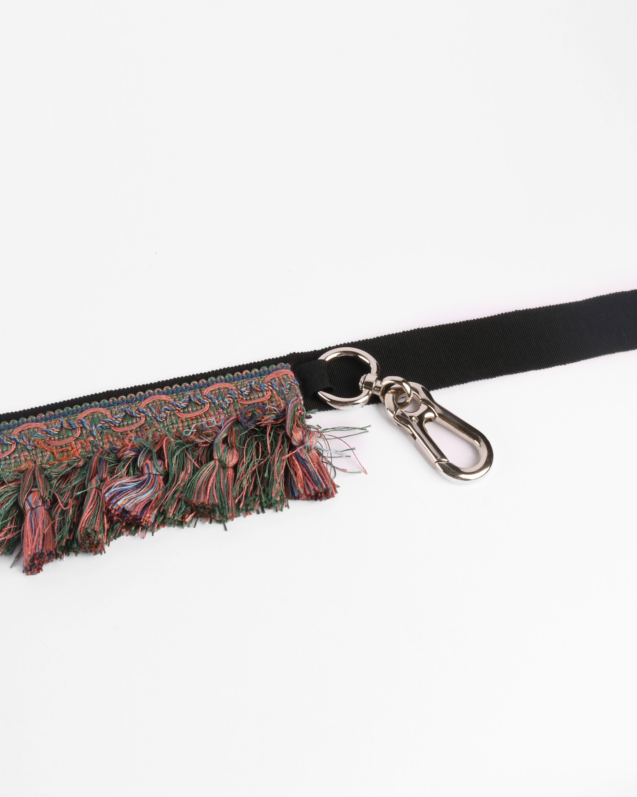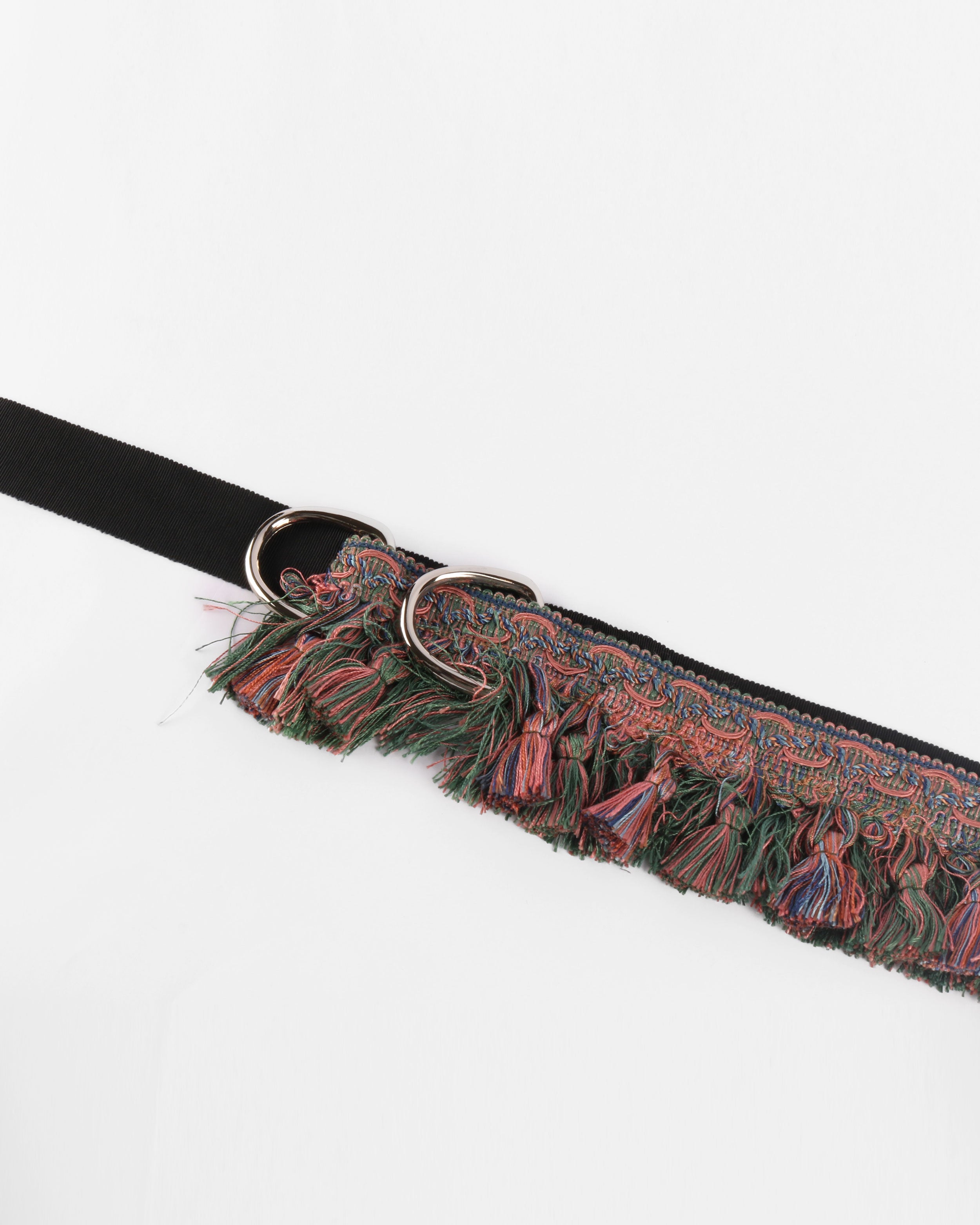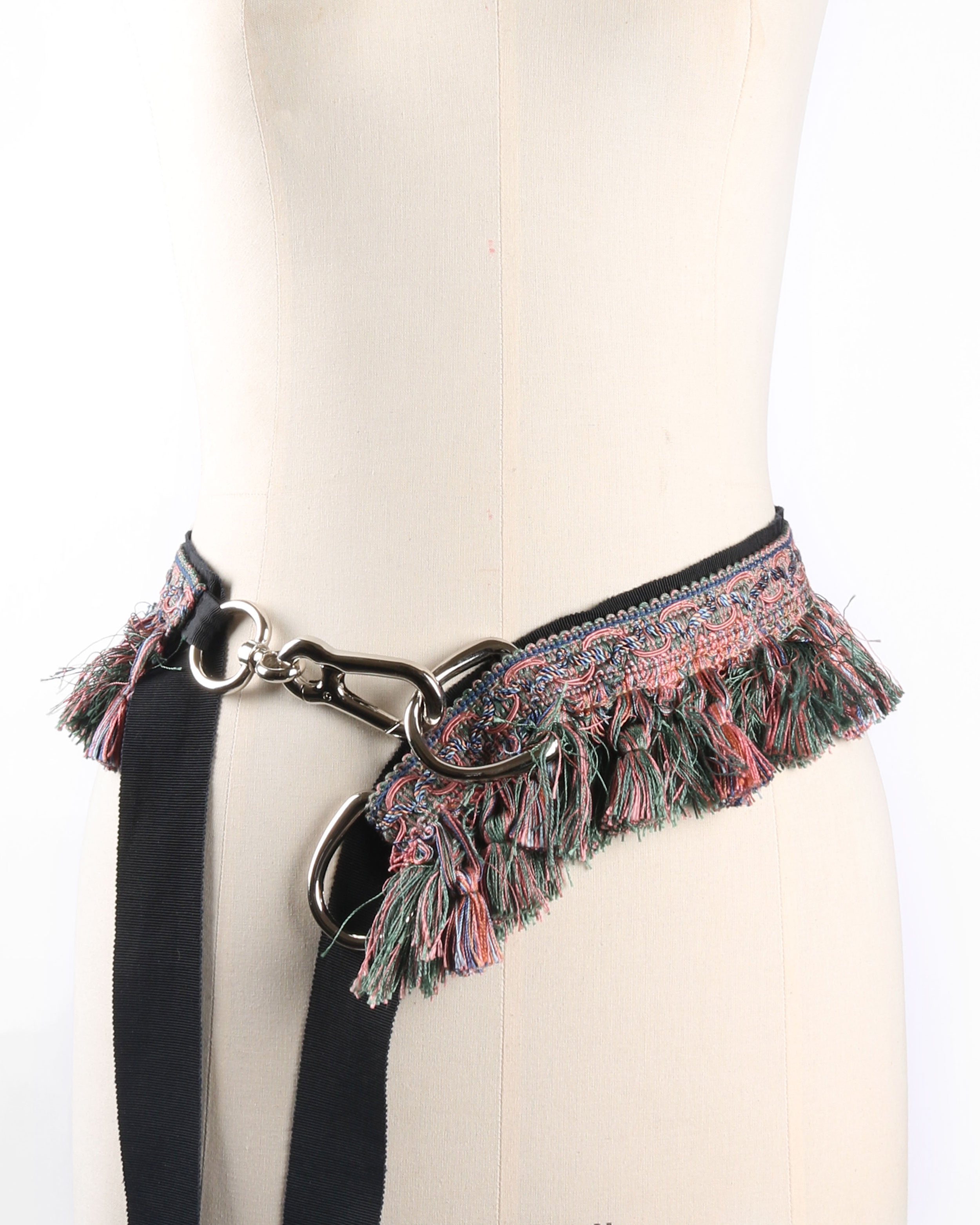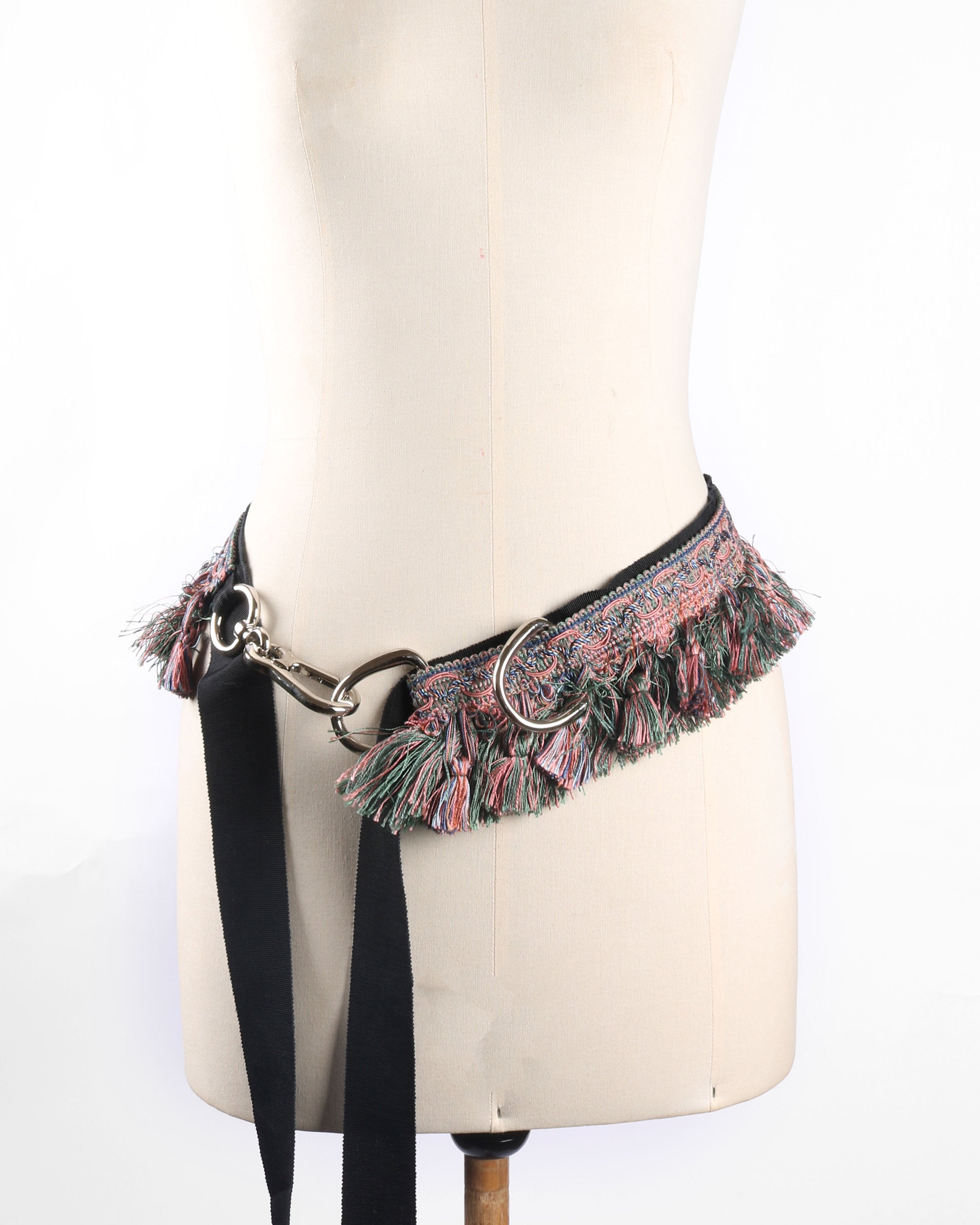 A wrap-style belt crafted from layering trims, finished with soft fringed detailing and metal hardware closures.