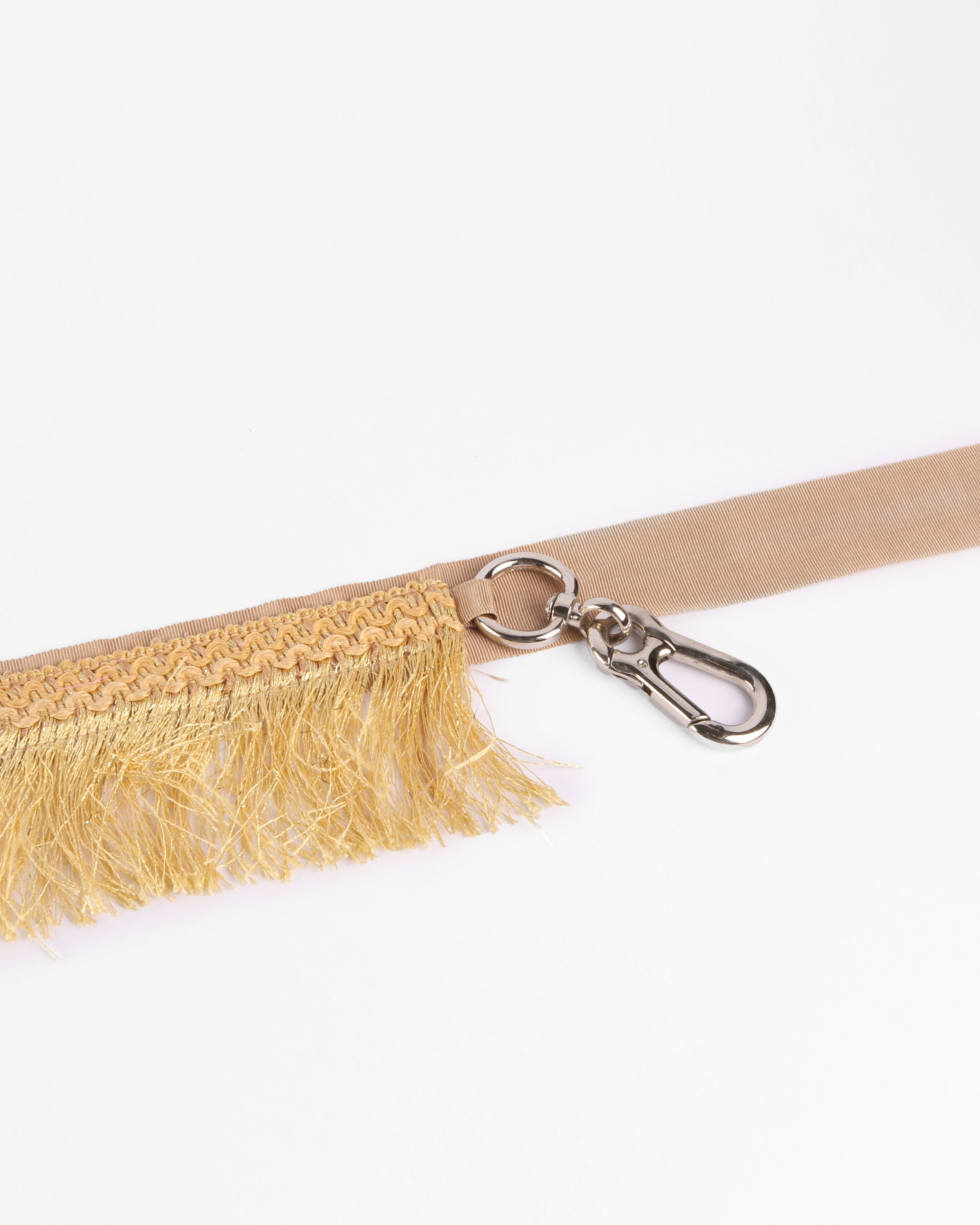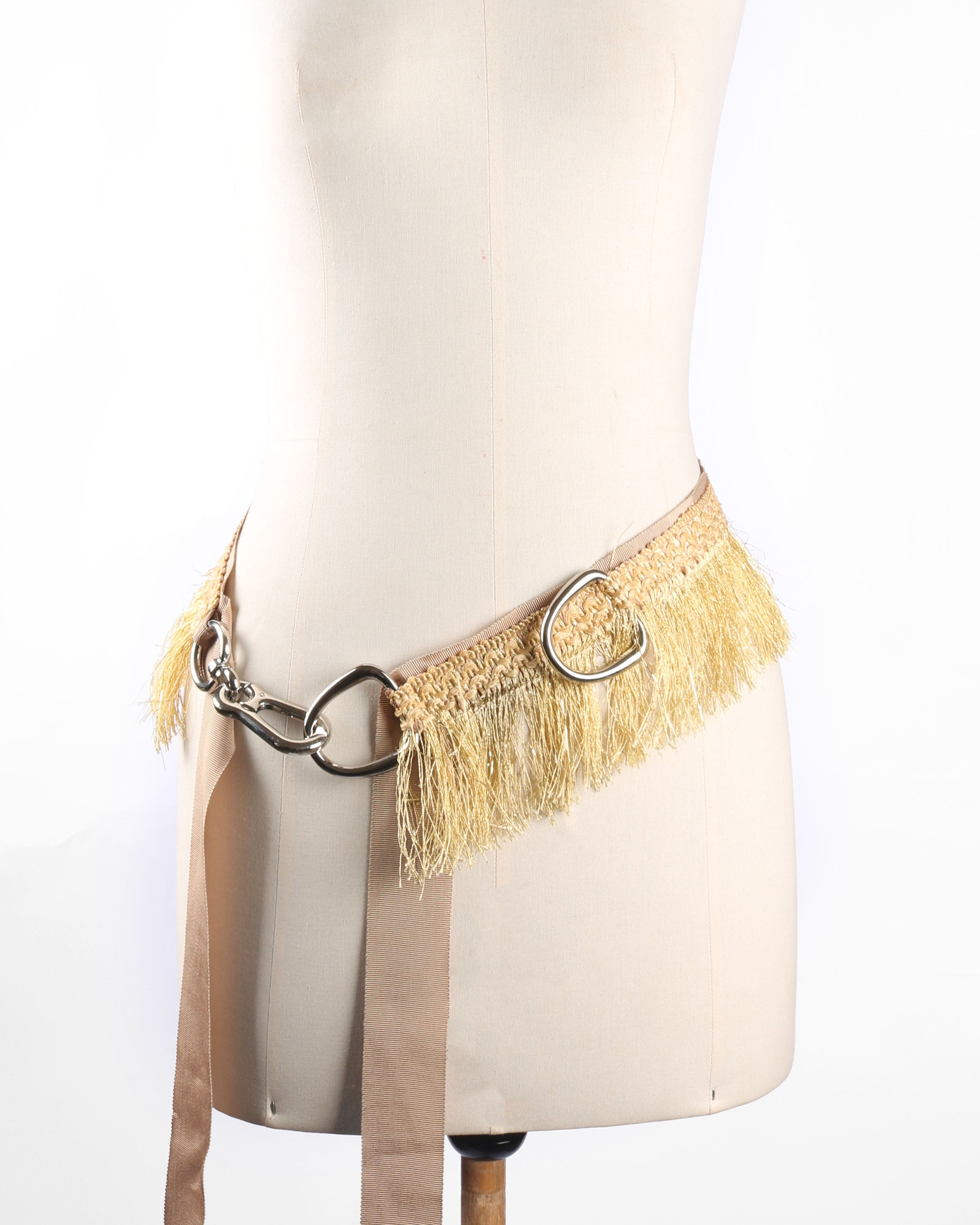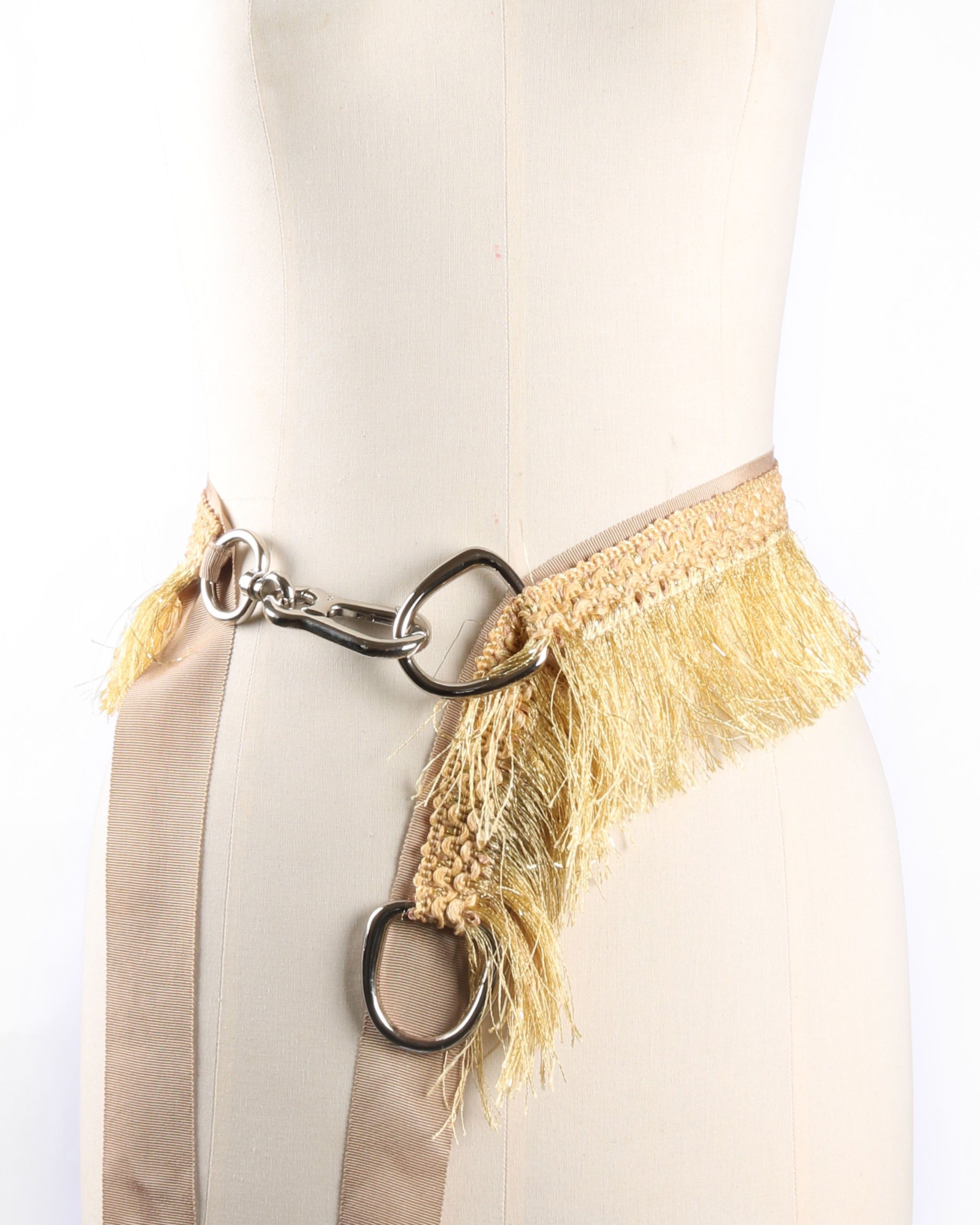 A wrap-style belt crafted from layering trims, finished with soft fringed detailing and metal hardware closures.