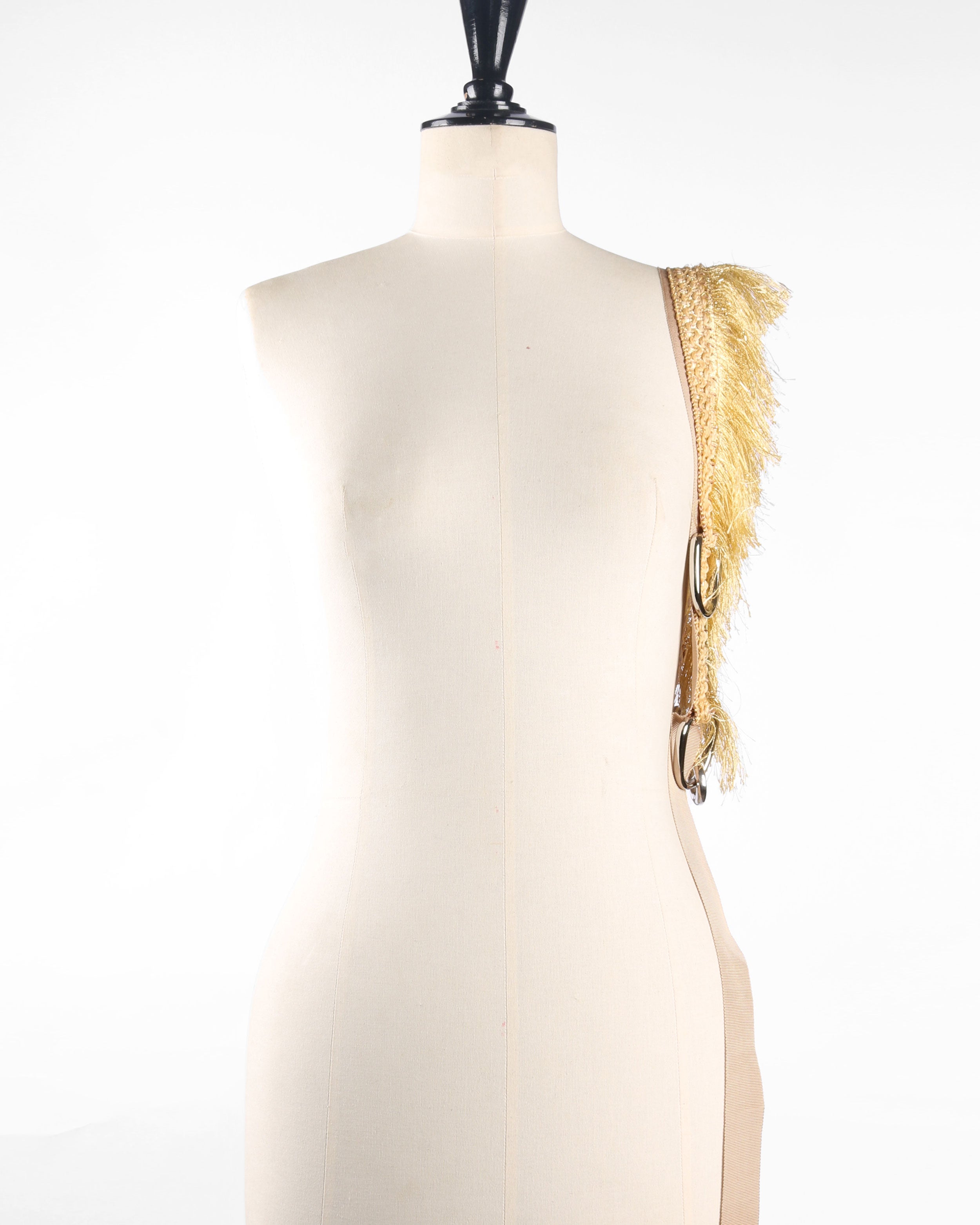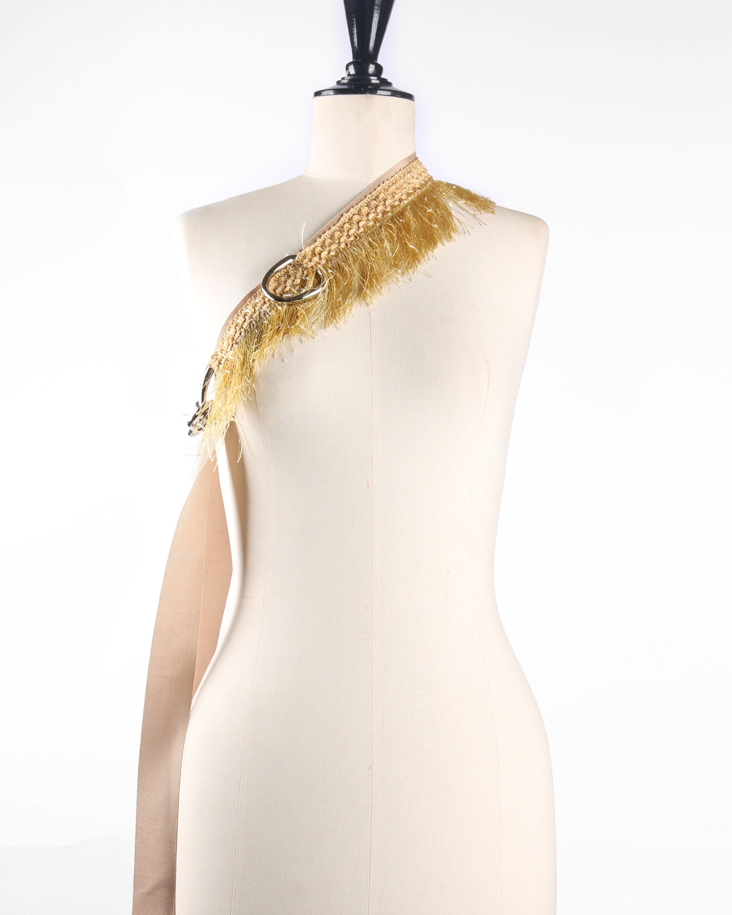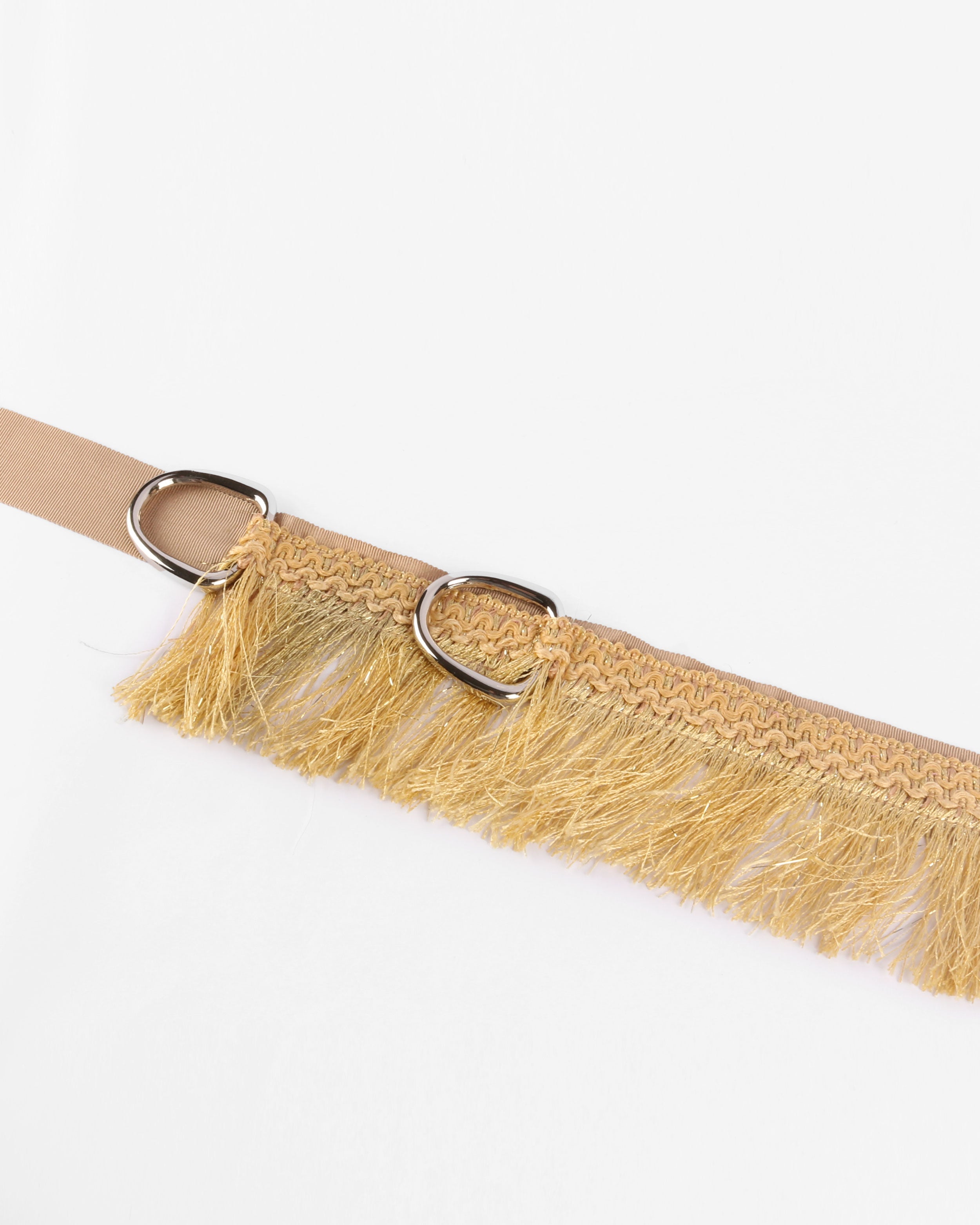 A wrap-style belt crafted from layering trims, finished with soft fringed detailing and metal hardware closures.