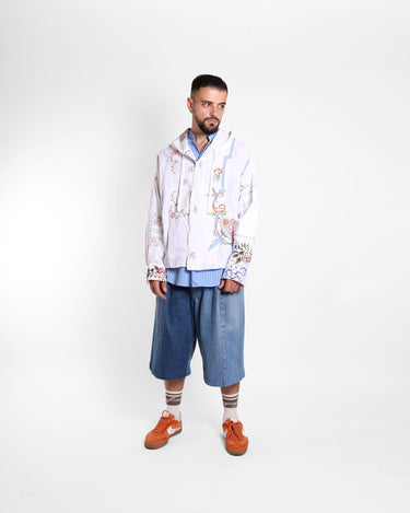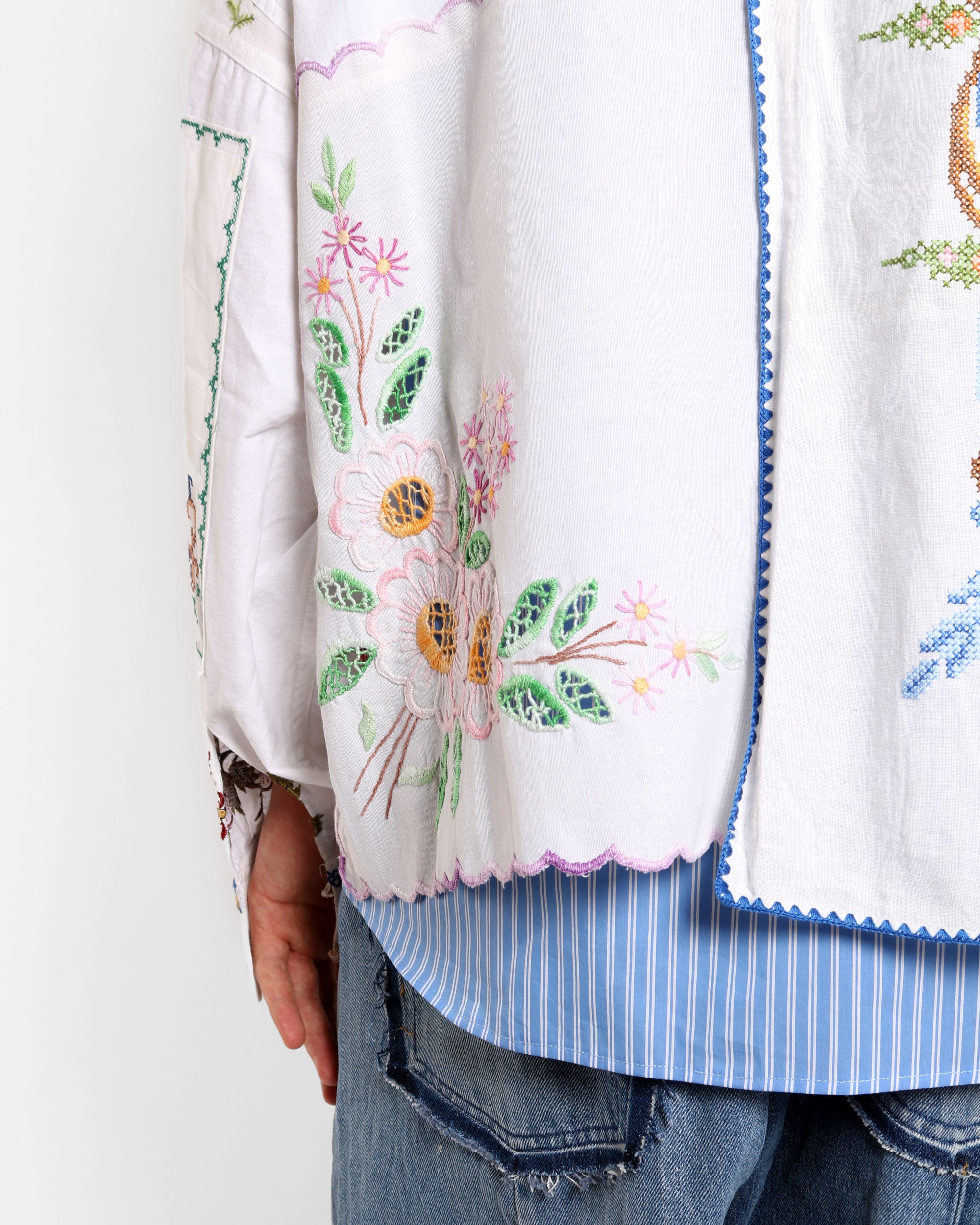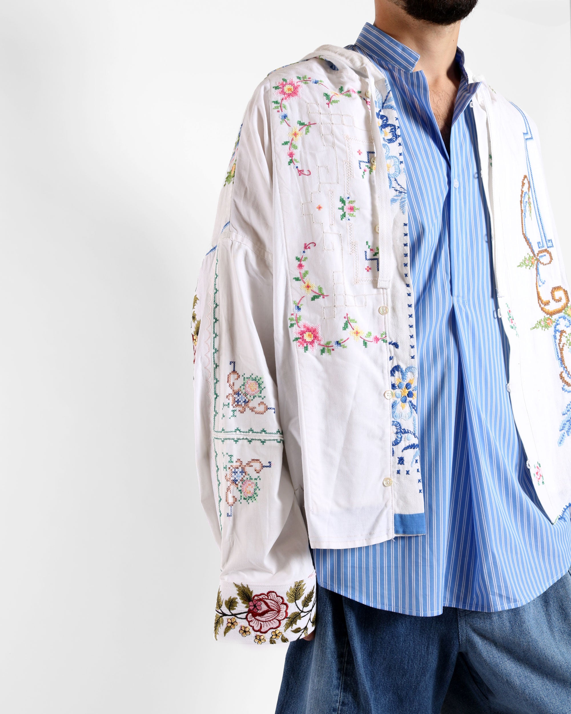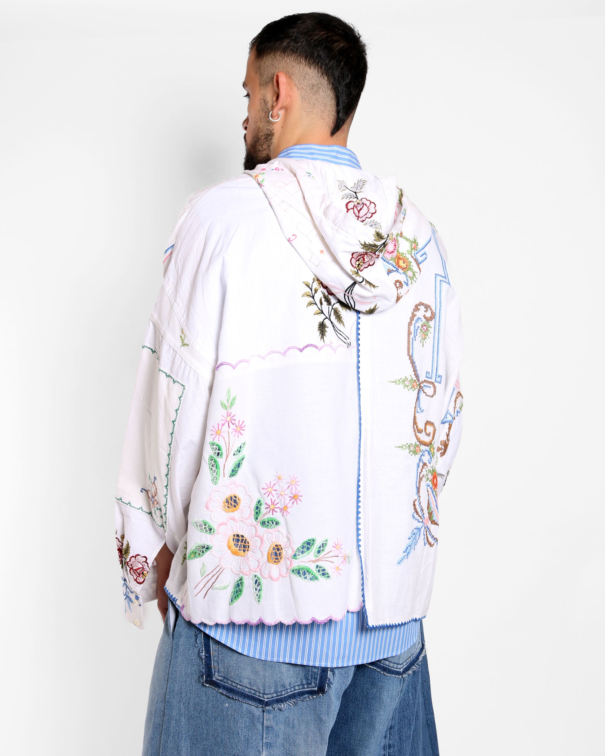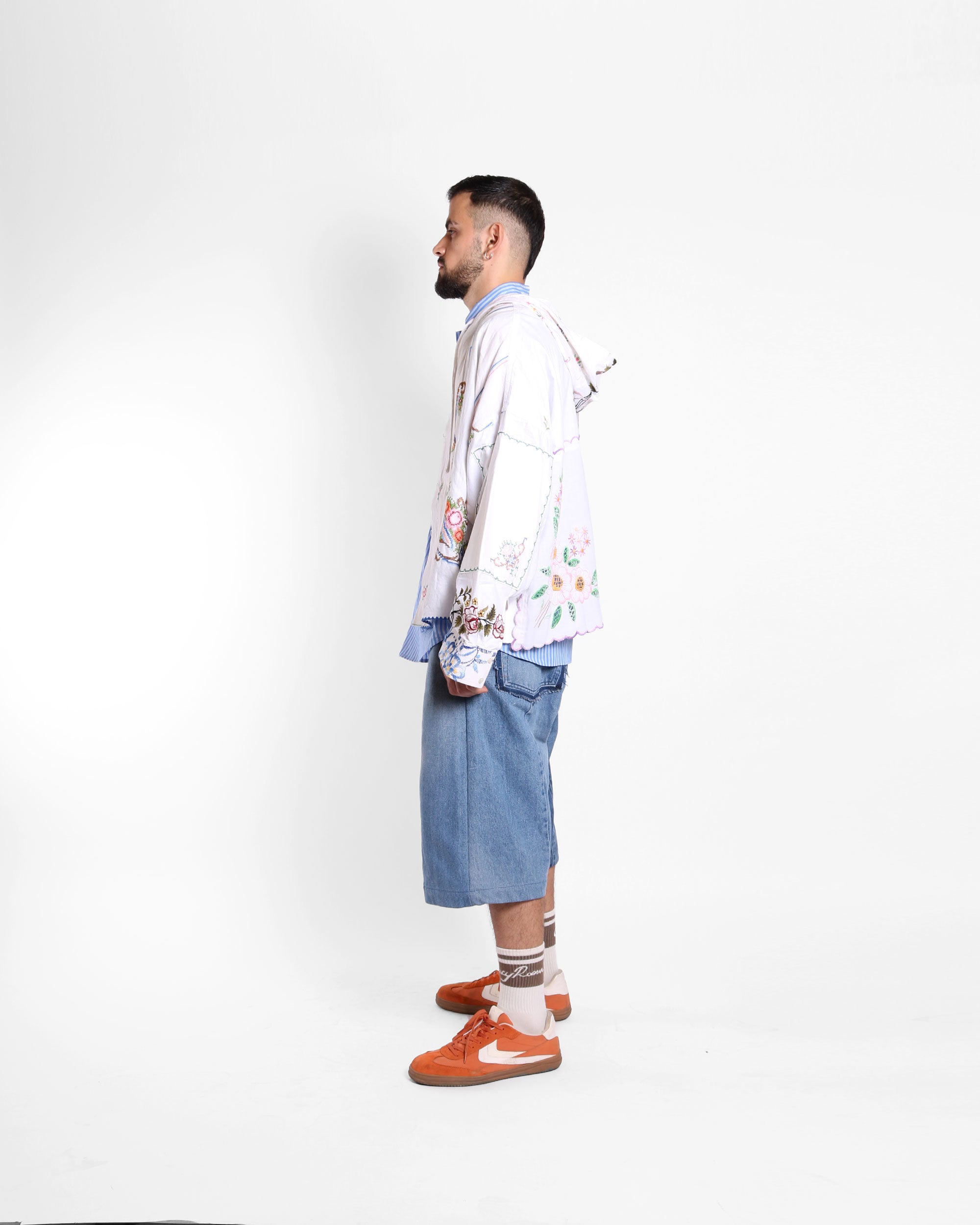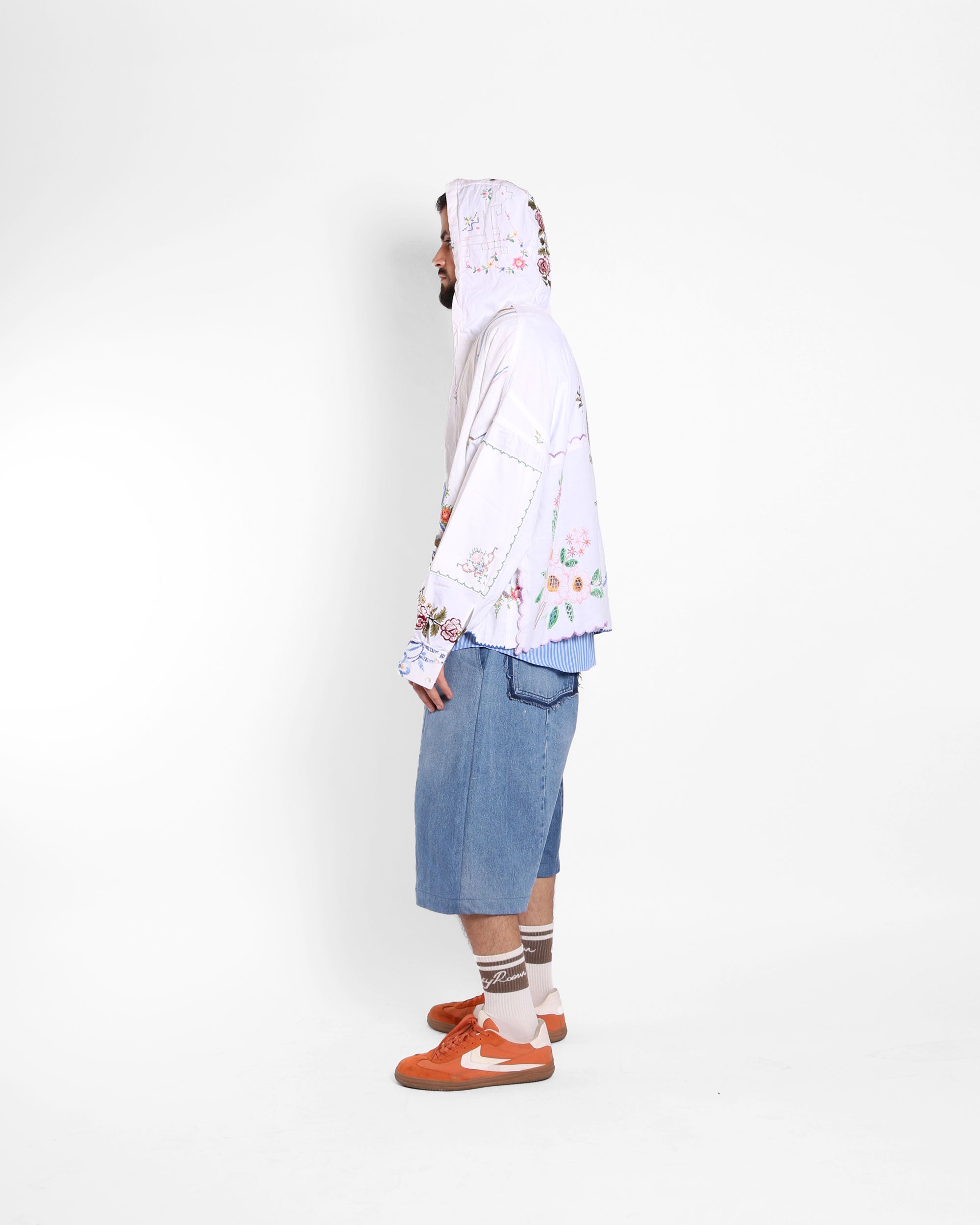 A relaxed hoodie cut from vintage embroidered table linens and decorative textiles, pieced together in a patchwork of floral motifs, lace trims, and scalloped edges. Every panel was carefully placed to preserve the character of each fabric while creating balance and movement. A soft yet striking reimagination of everyday nostalgia.
