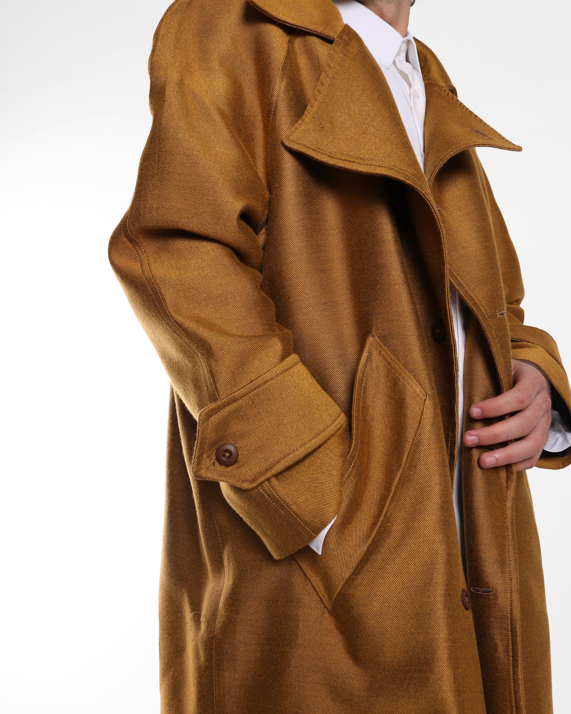 A long trench coat with a relaxed, slightly oversized silhouette and dropped shoulders. Designed with a soft drape, wide sleeves, and deep side pockets, this piece balances classic outerwear references with an effortless, contemporary attitude. Wear it open or closed for a sharp yet easy layering option.