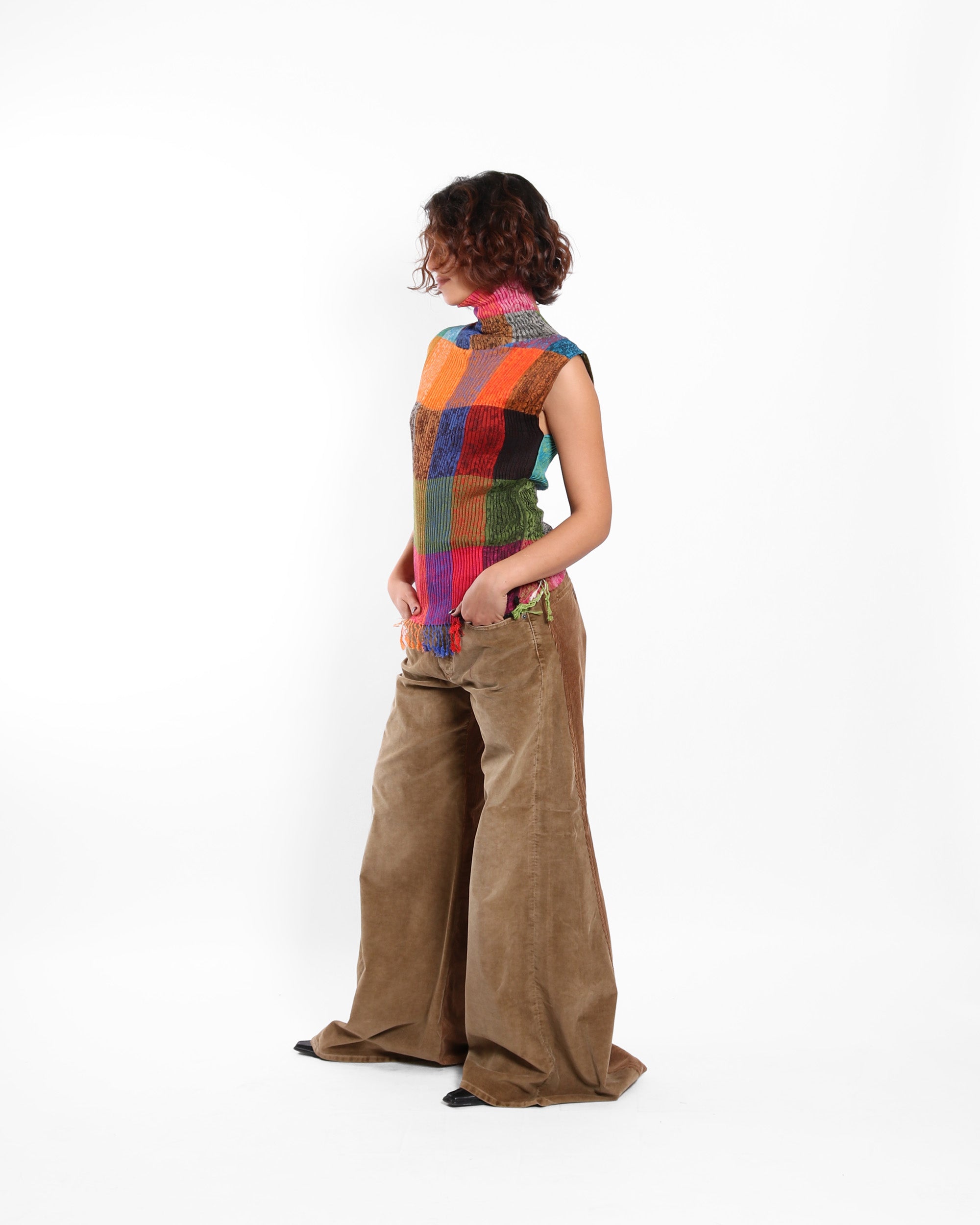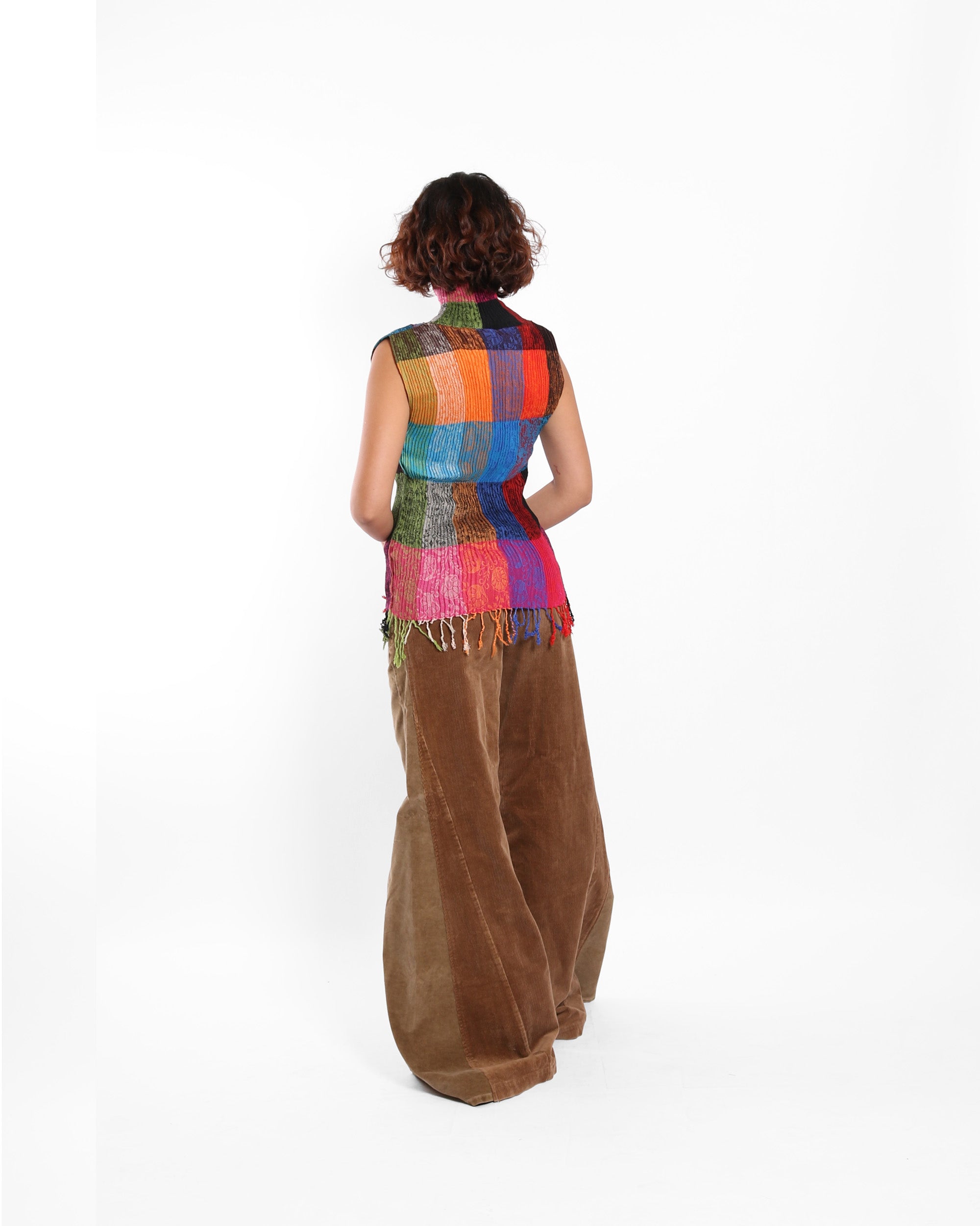 This top is made from an upcycled scarf, maintaining its woven character and fringed edge while reshaping it into a bold, turtle neck silhouette.