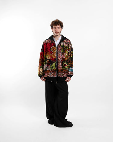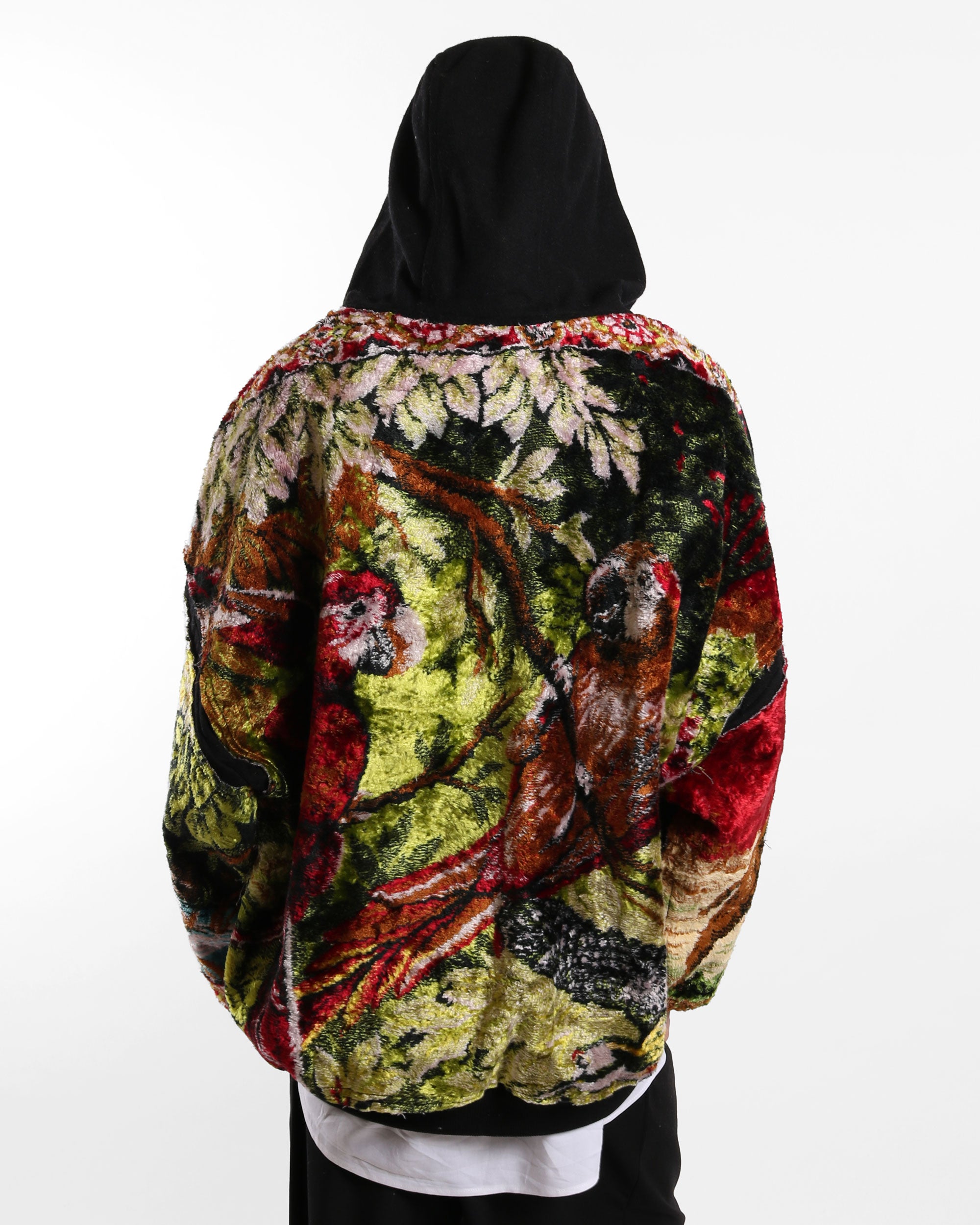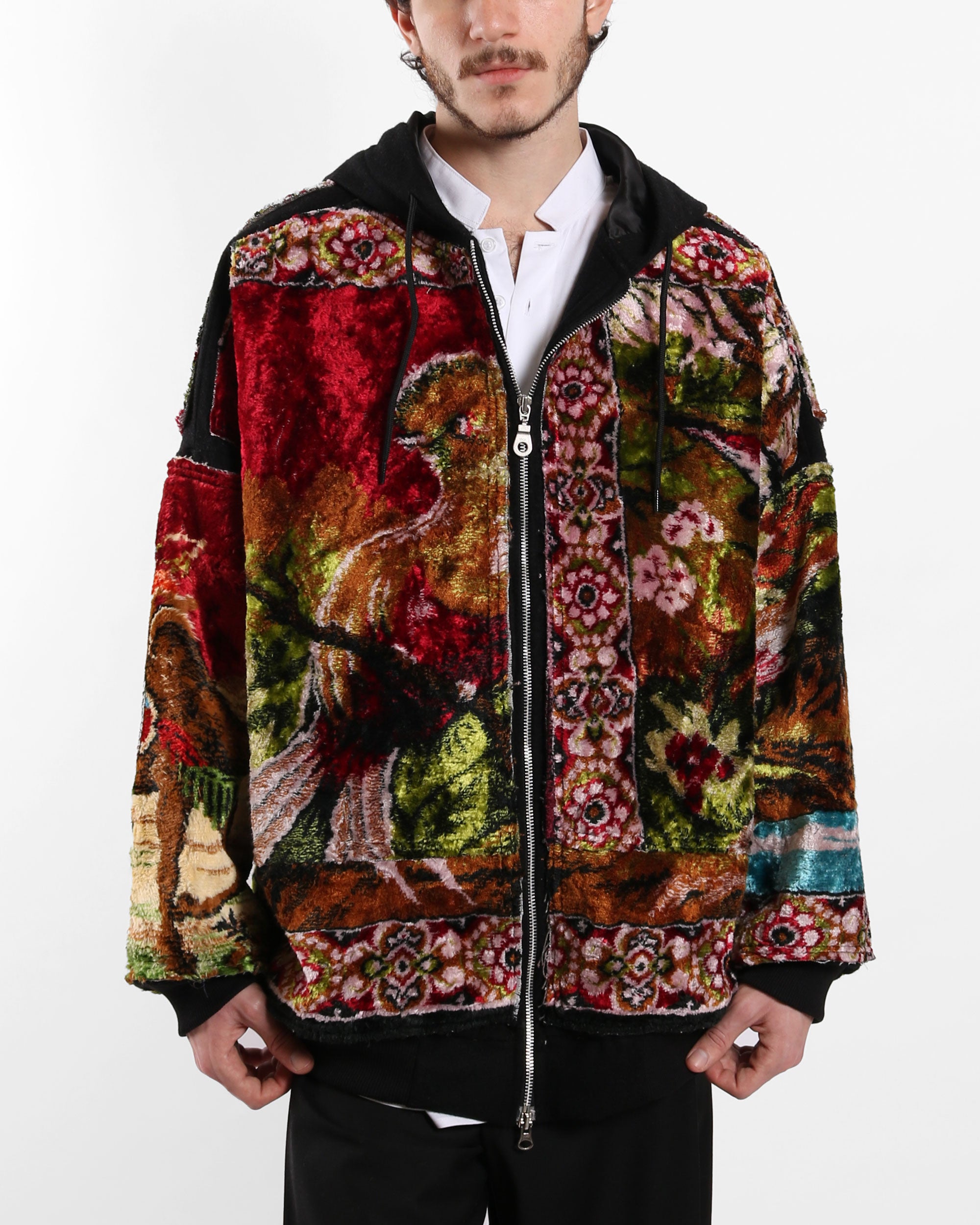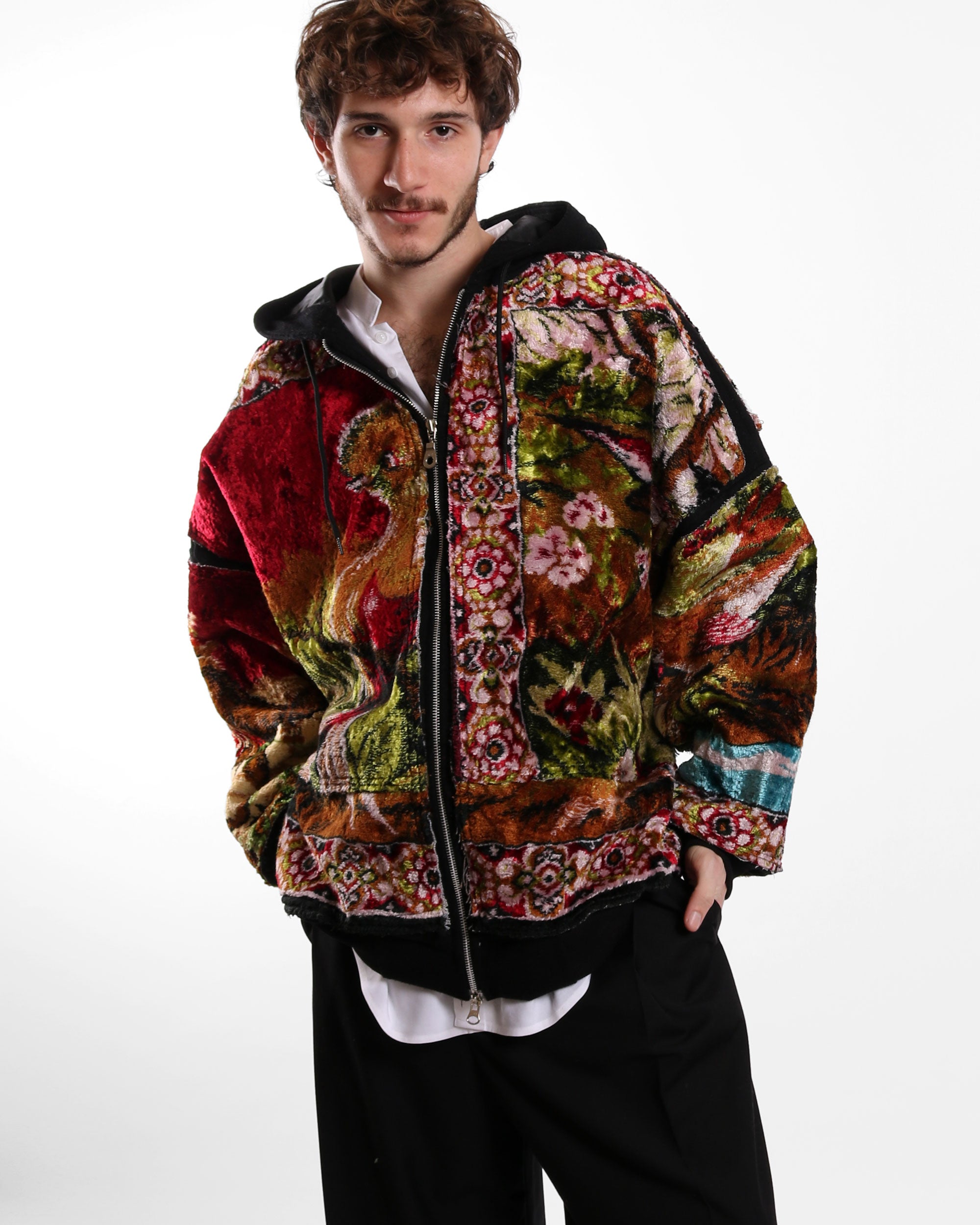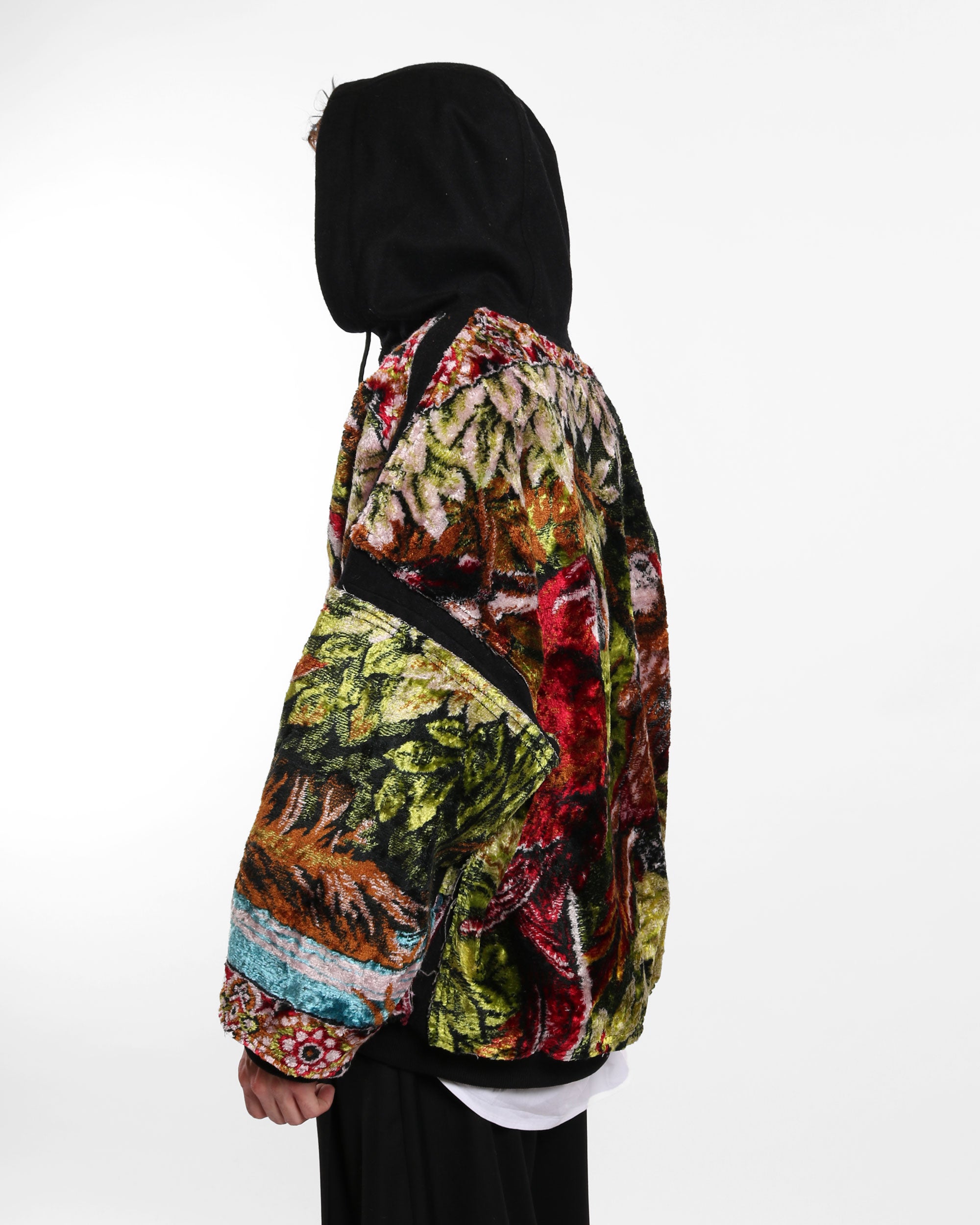 A cozy hoodie crafted from a soft wool base, featuring carpet panels on the front and back for added texture and bold character. Designed with a relaxed fit, dropped shoulders, and a hood, this piece blends everyday comfort with standout craftsmanship.