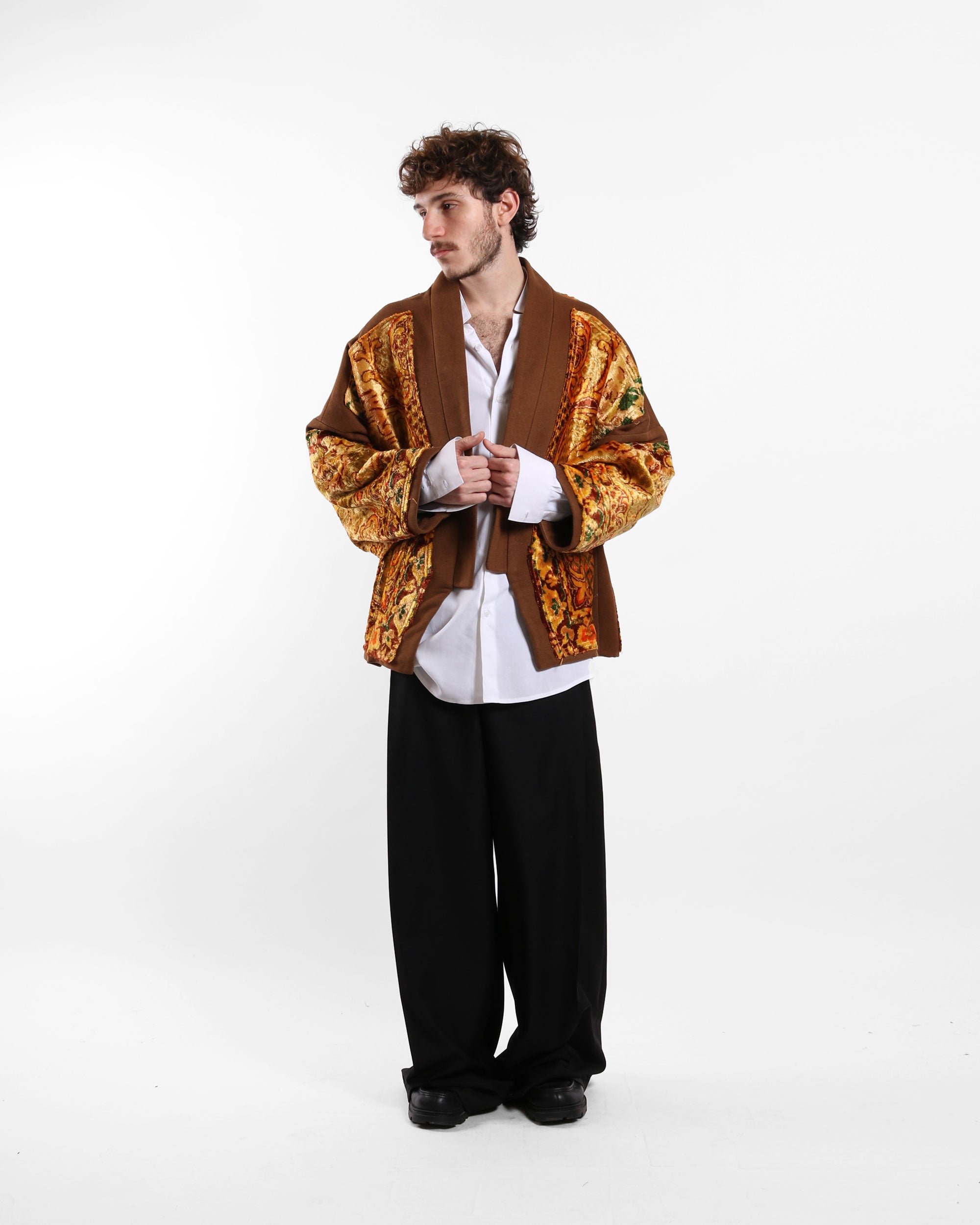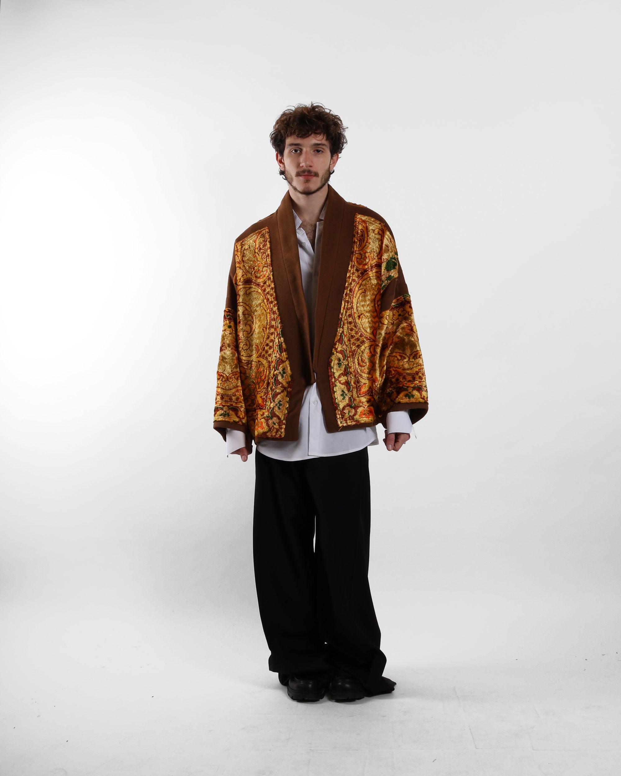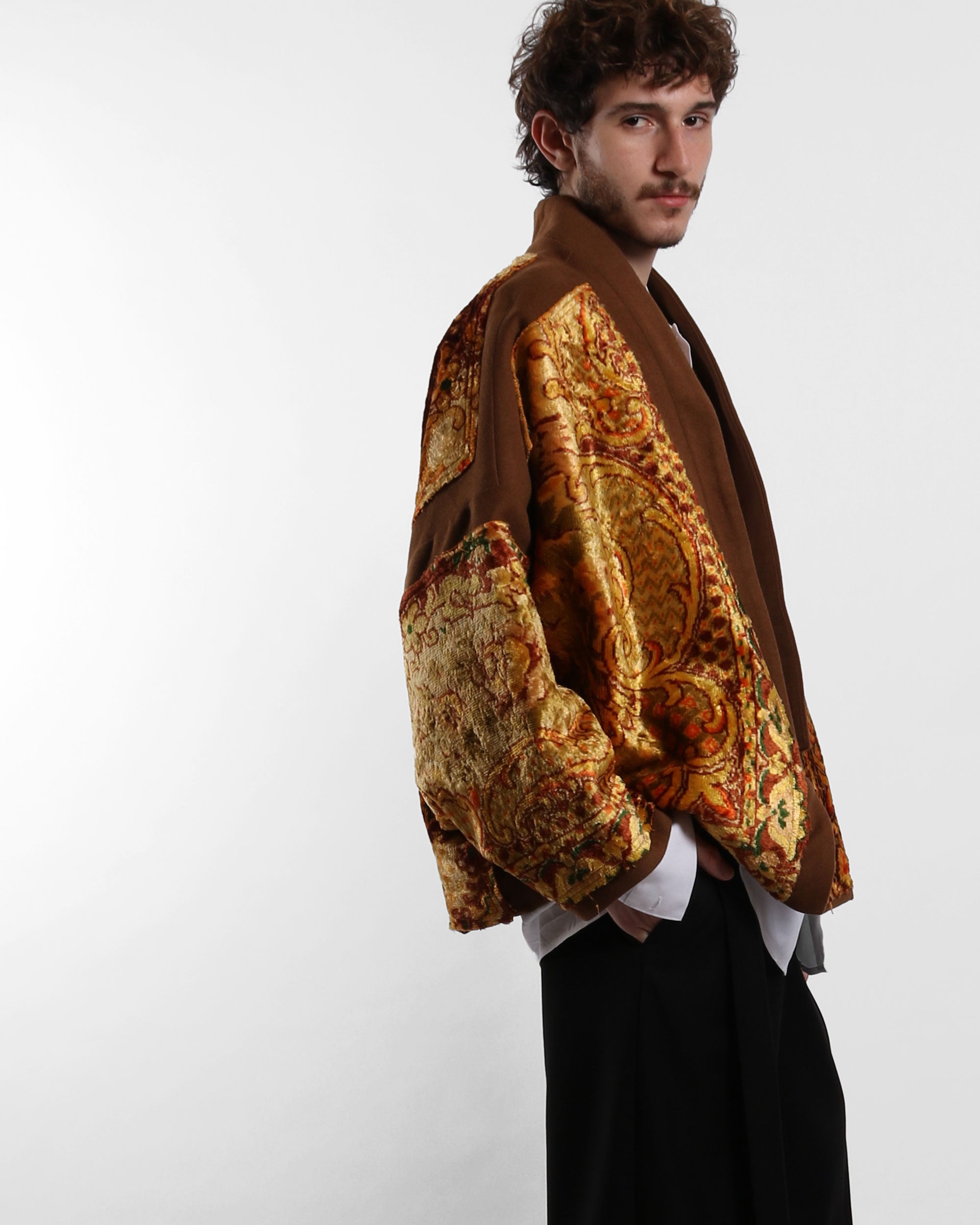 A kimono crafted from a wool base, featuring carpet panels on the front and back for added texture and bold character. Designed with a relaxed fit and open front, this piece blends everyday comfort with standout craftsmanship.