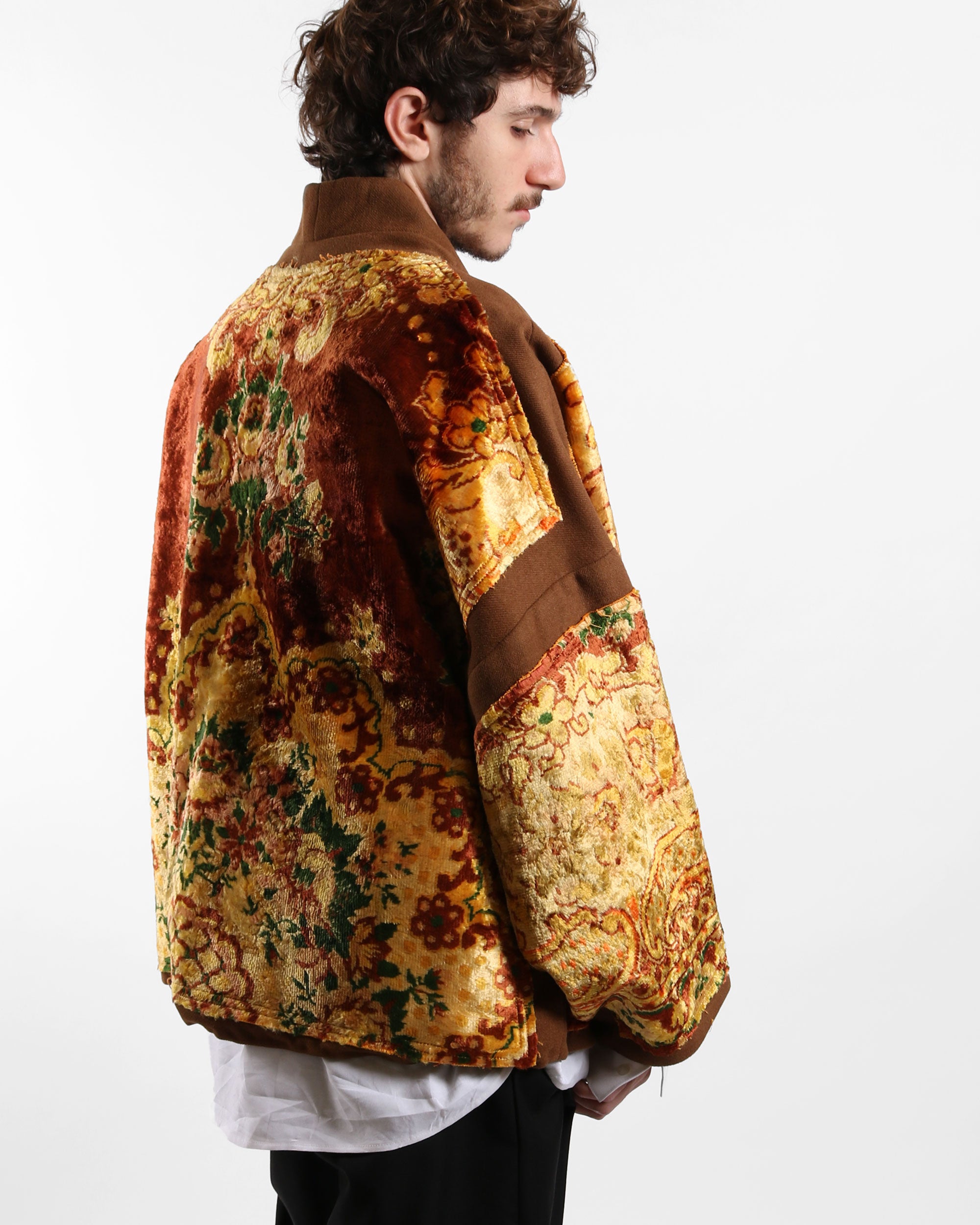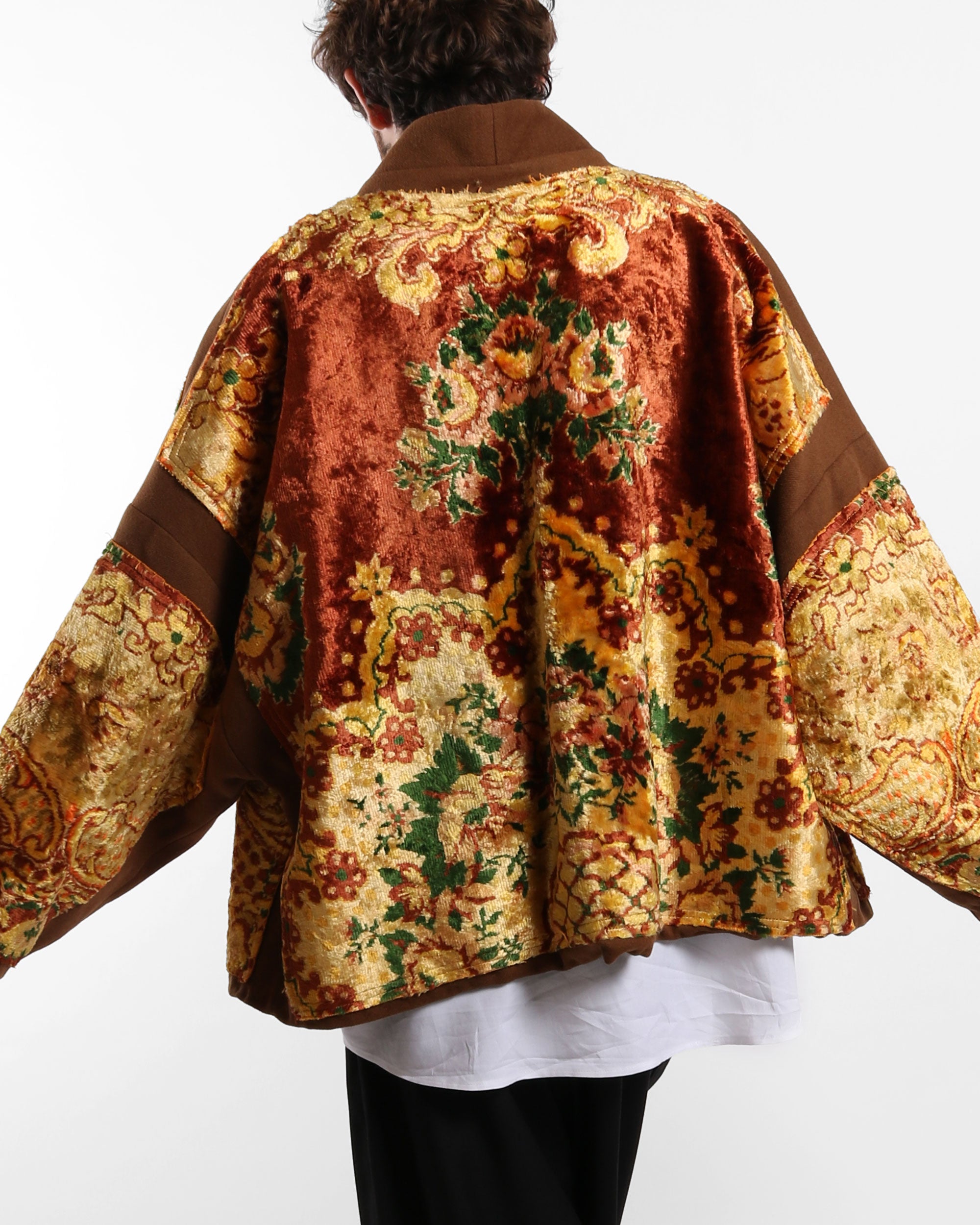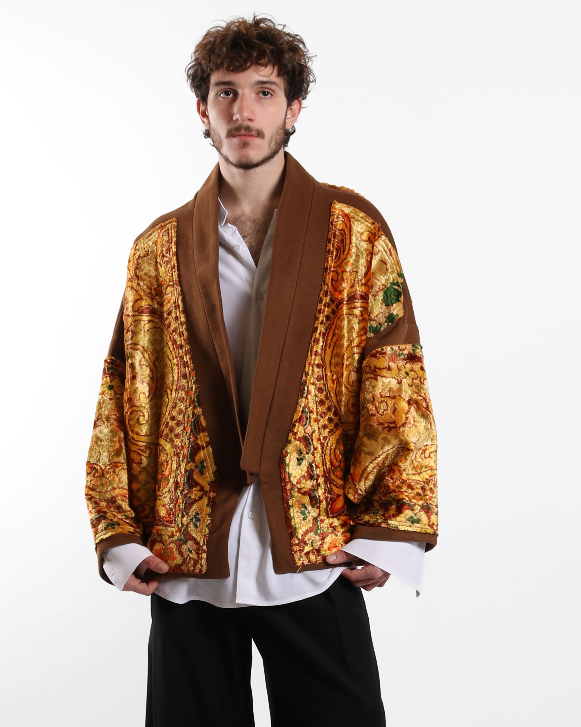 A kimono crafted from a wool base, featuring carpet panels on the front and back for added texture and bold character. Designed with a relaxed fit and open front, this piece blends everyday comfort with standout craftsmanship.
