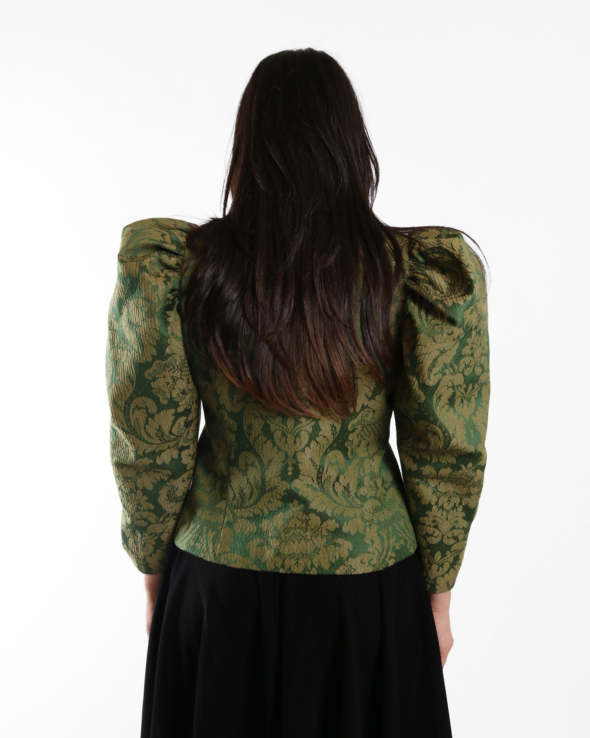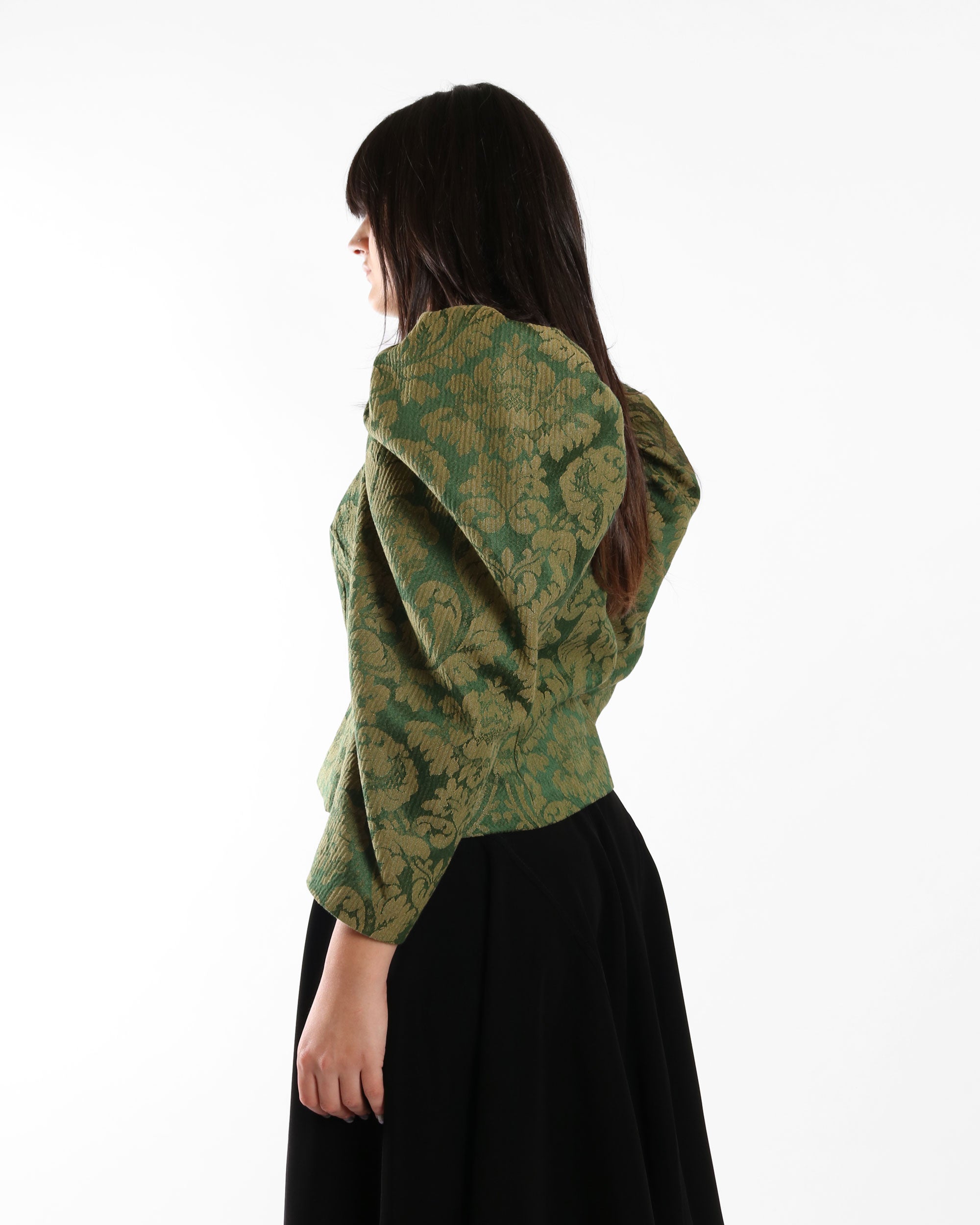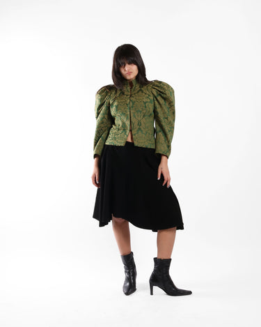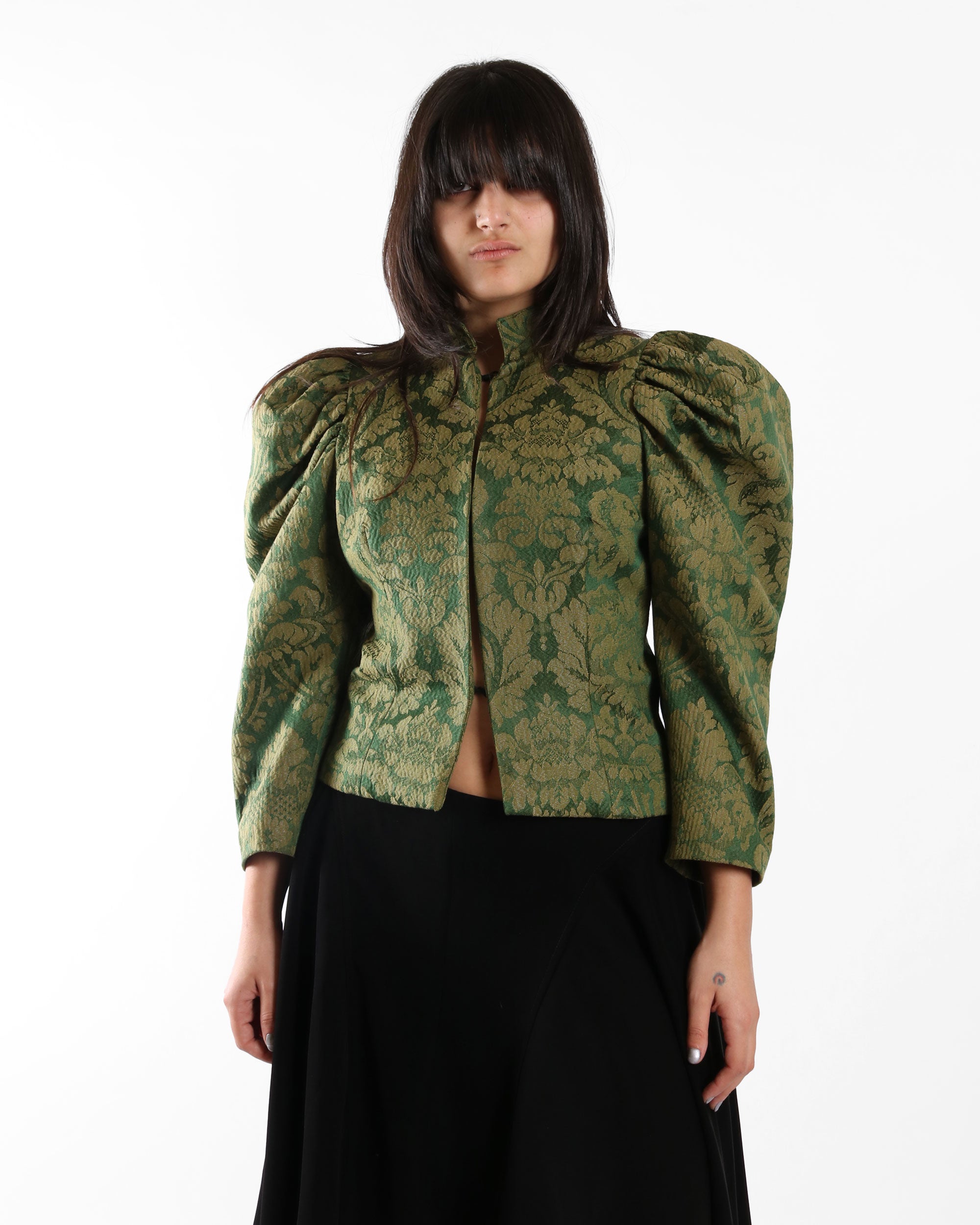 A fitted jacket with pronounced puffed sleeves, designed to sculpt the body while adding volume and drama through the shoulders. Crafted from dead stock fabric with a rich surface and subtle sheen, this piece reinterprets classic tailoring with a bold, contemporary attitude. A strong yet wearable statement for day-to-night styling.