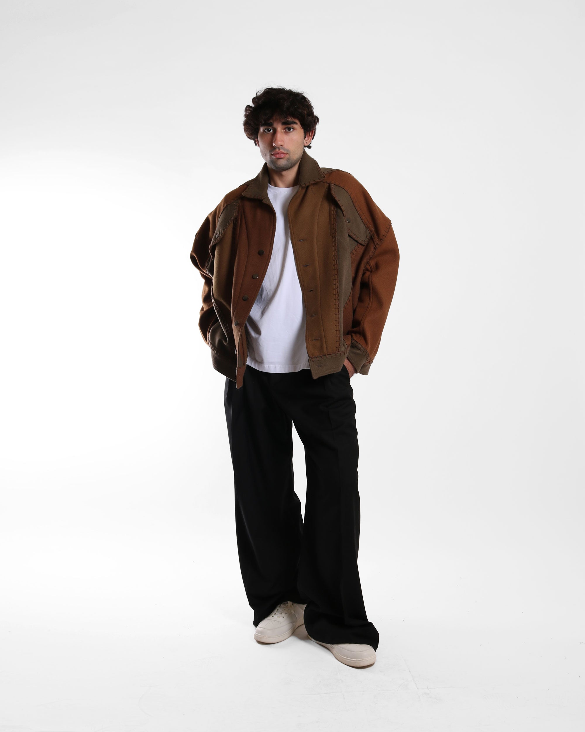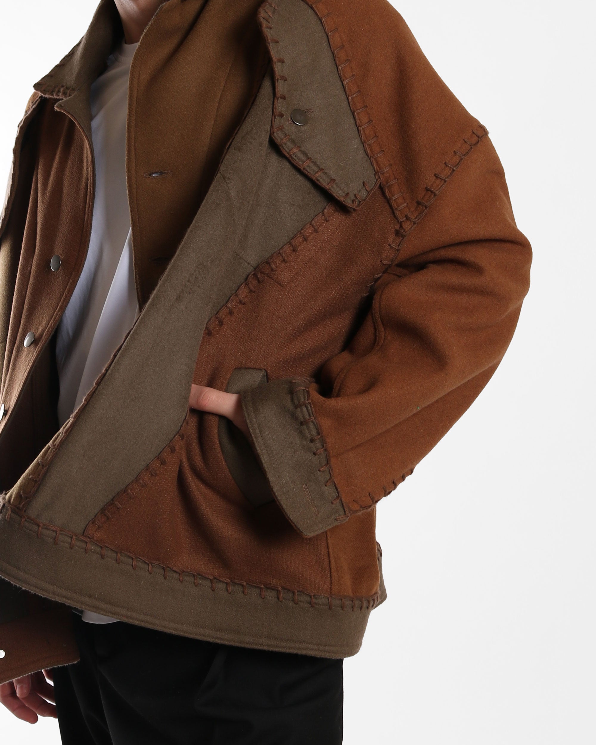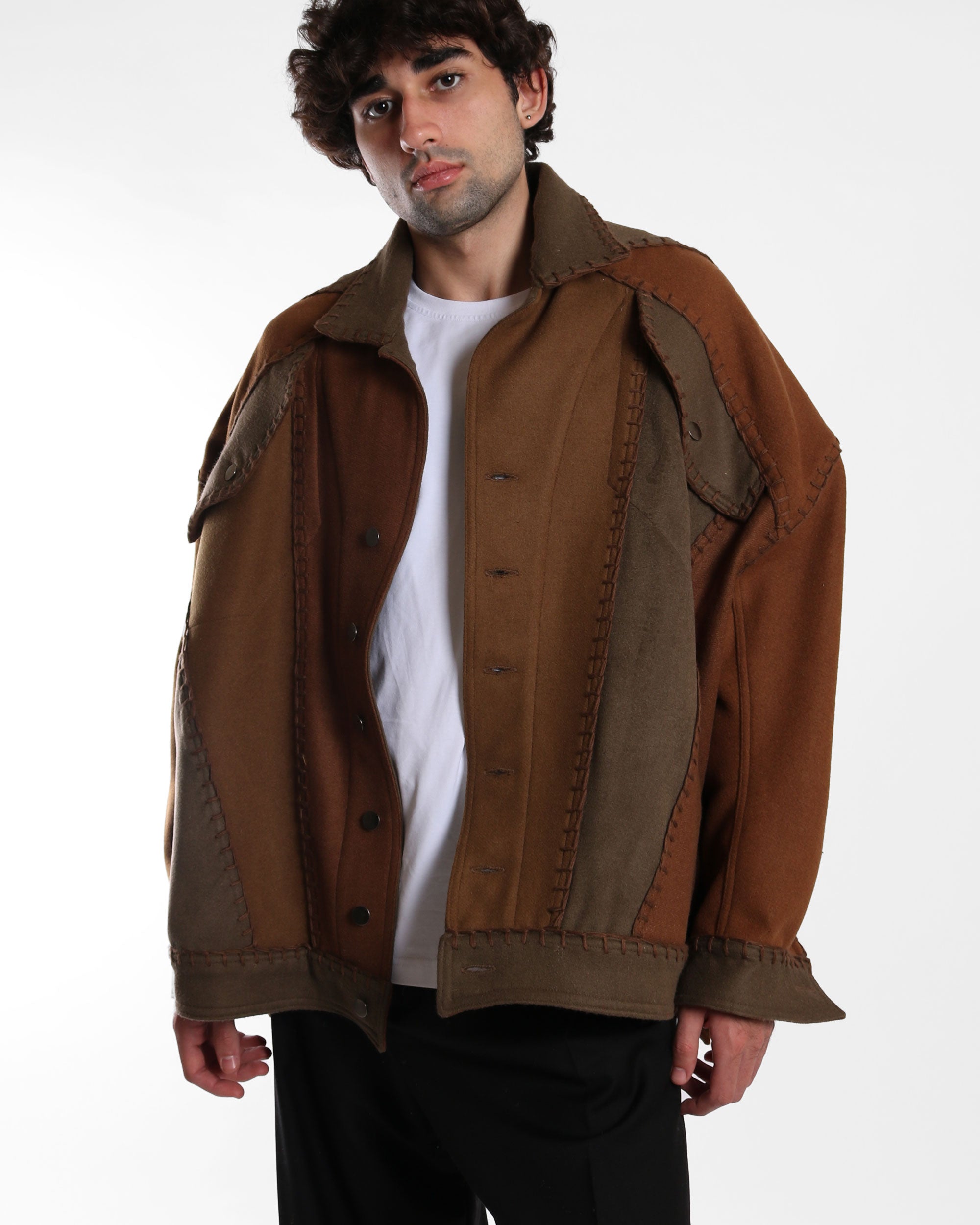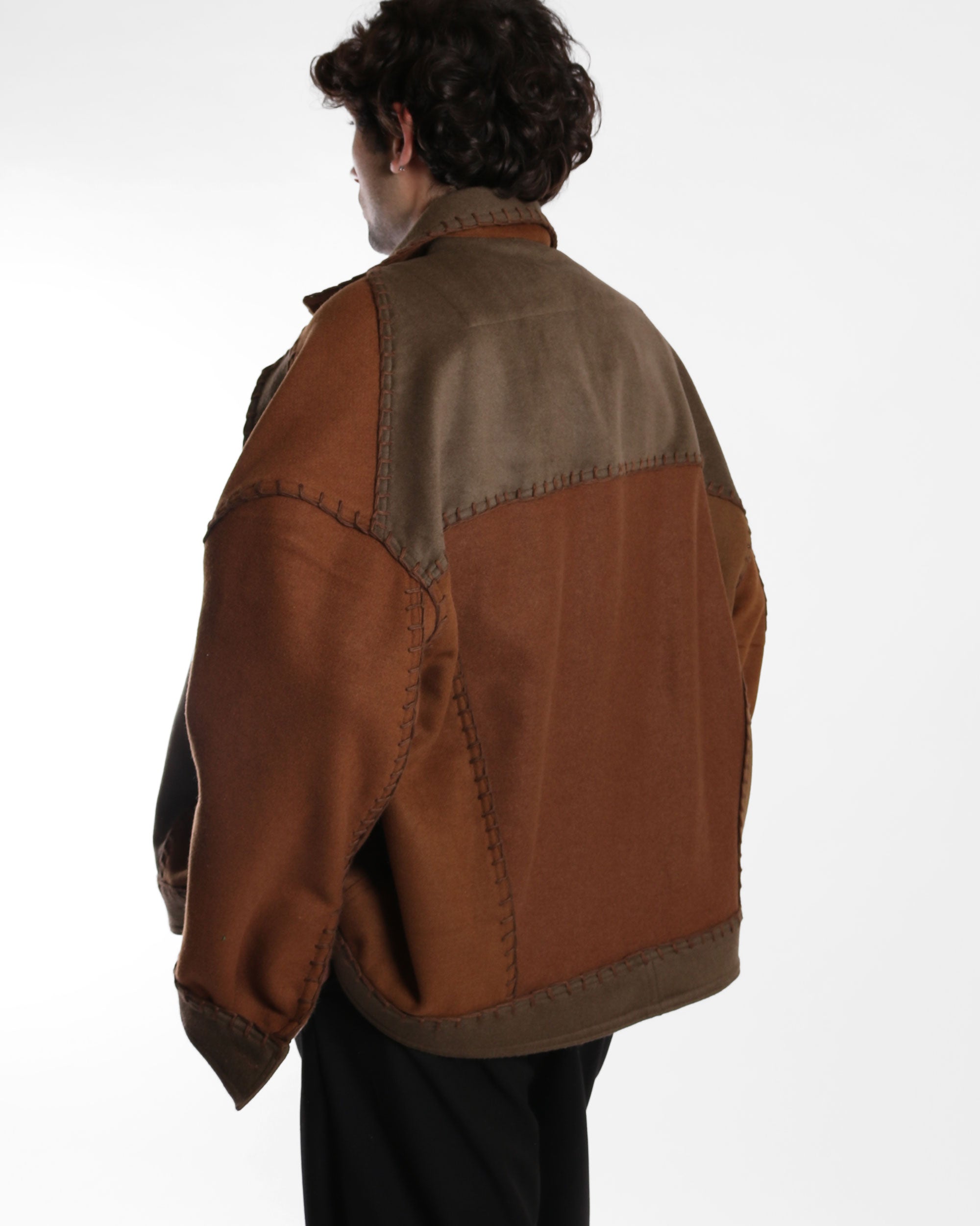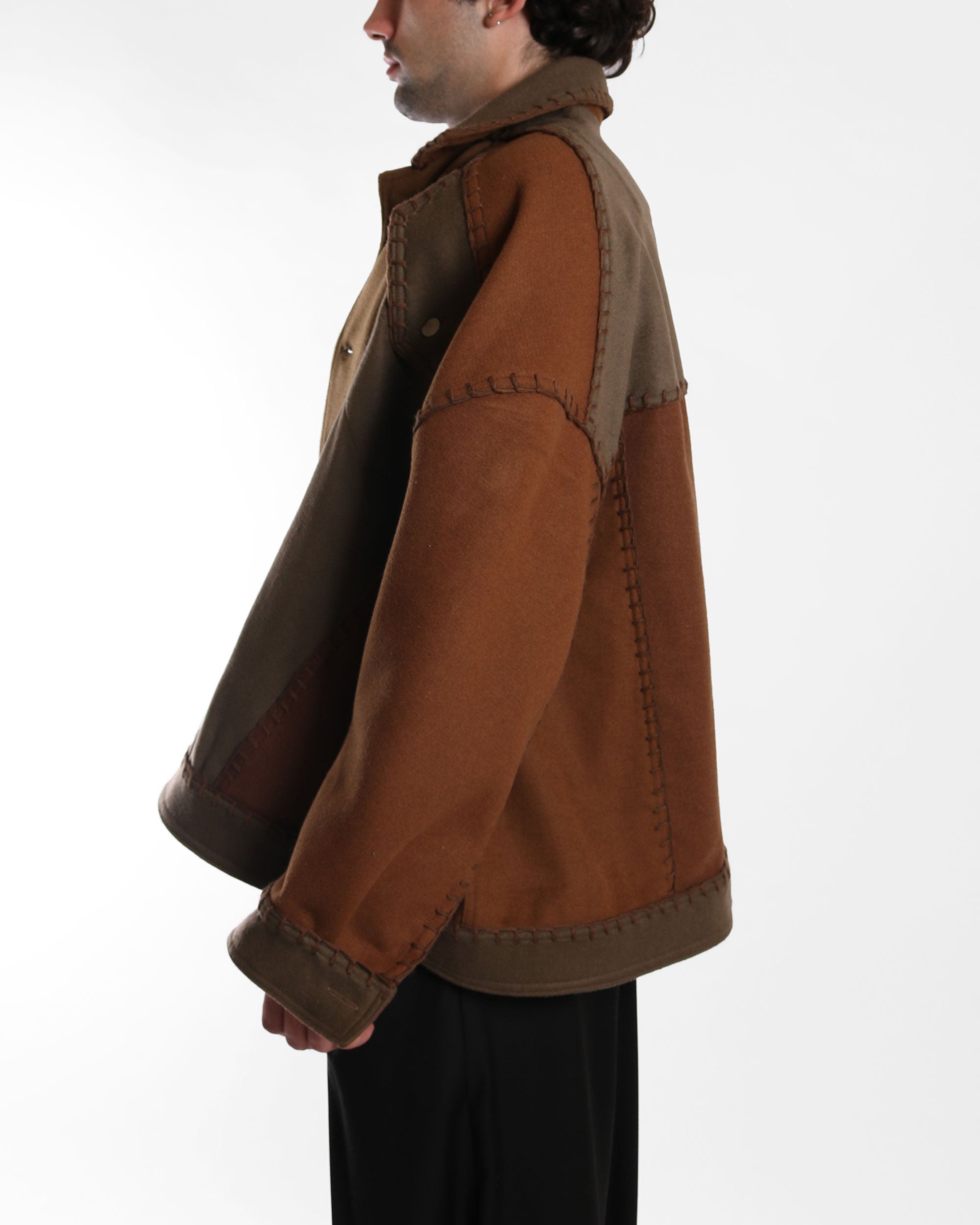 A rounded denim-cut jacket with a relaxed silhouette, constructed from variations of brown deadstock wool blend fabrics. Designed with dropped shoulders and a soft, structured shape, the jacket is finished with visible hand embroidery along all seams, emphasizing the construction and craftsmanship behind the piece. A tactile, everyday outerwear piece with subtle character.