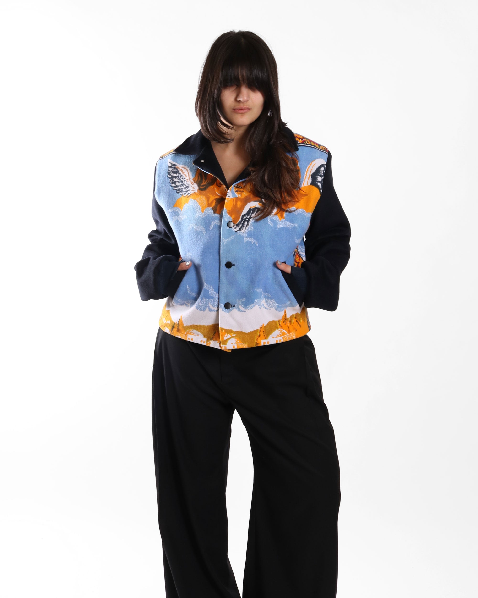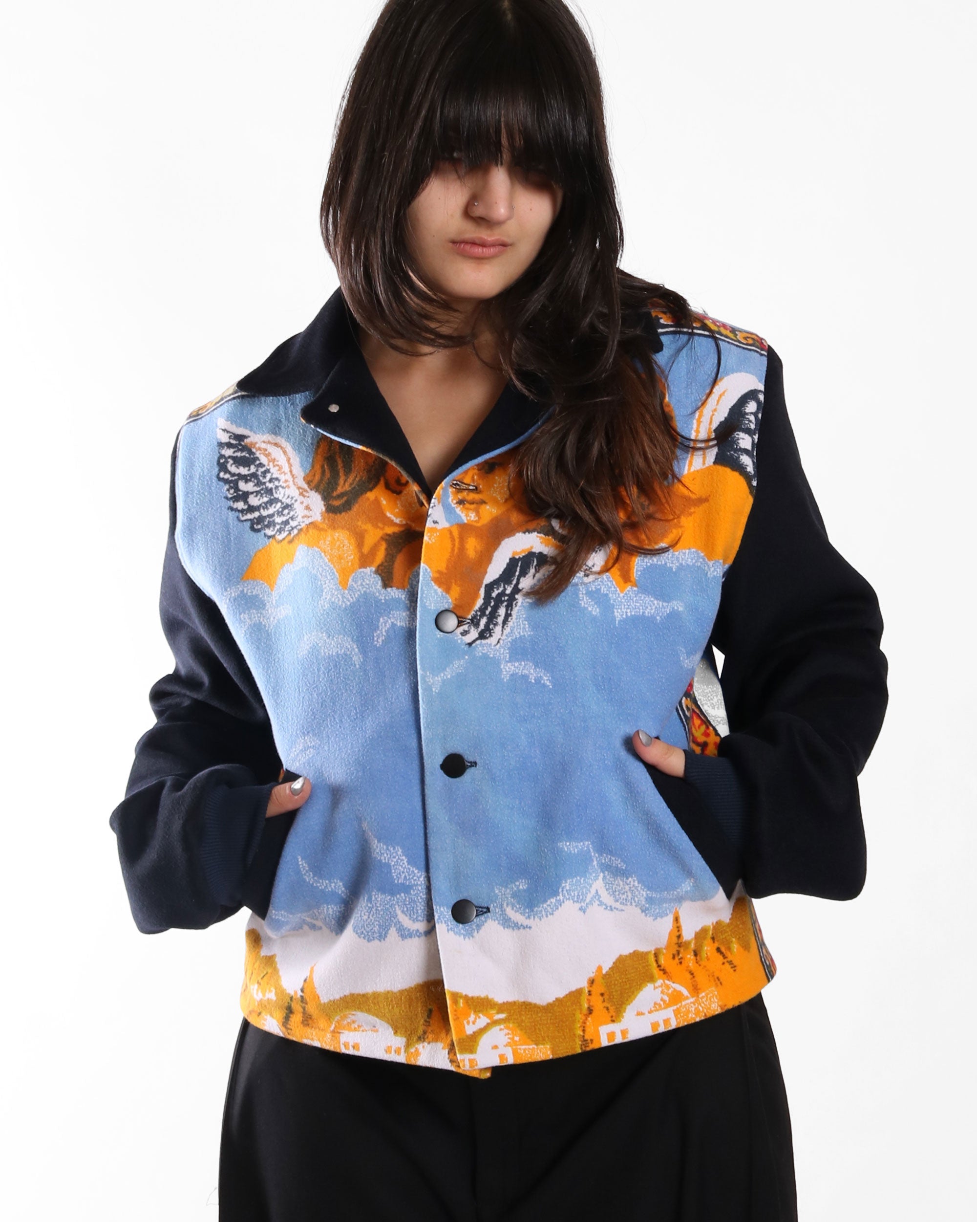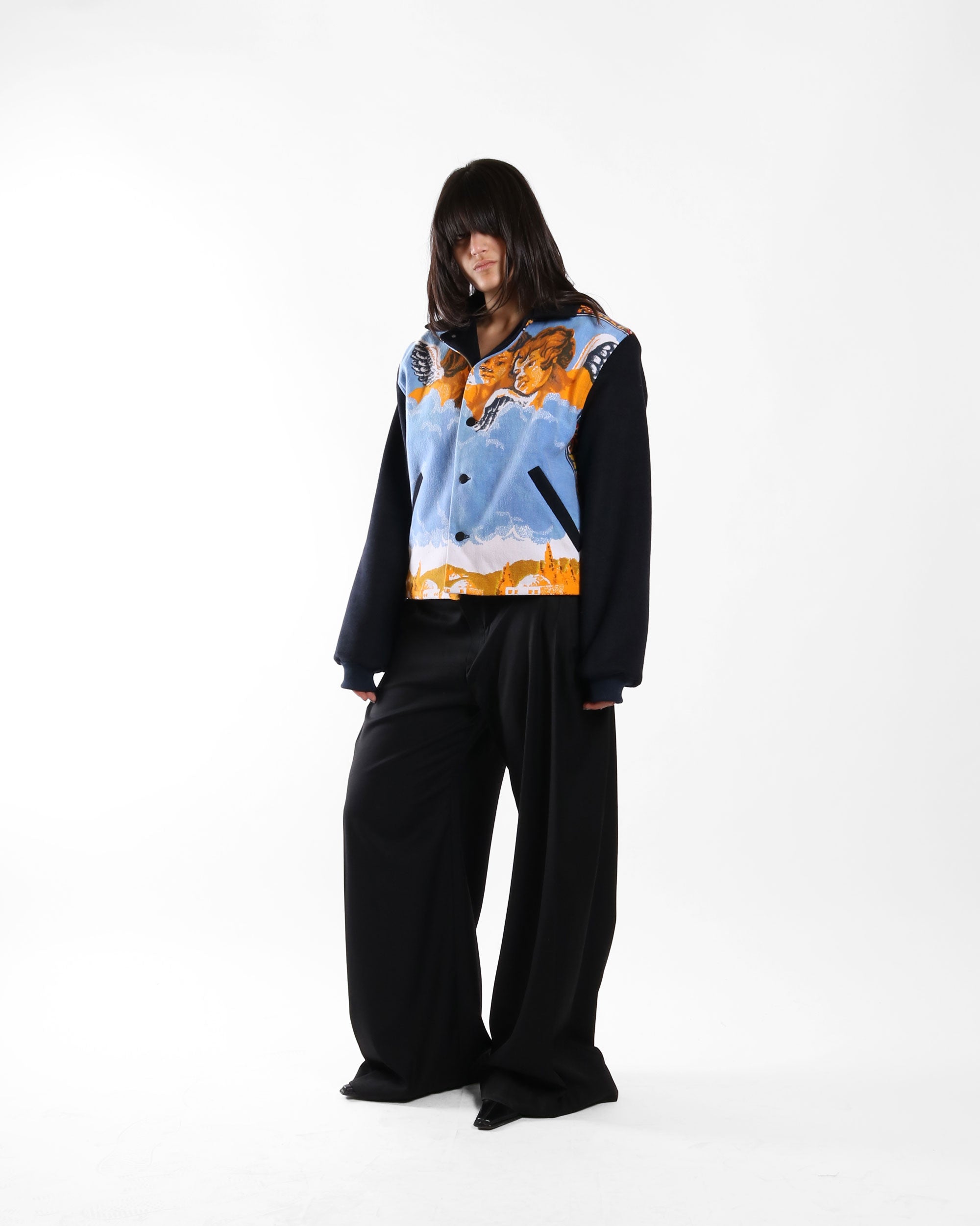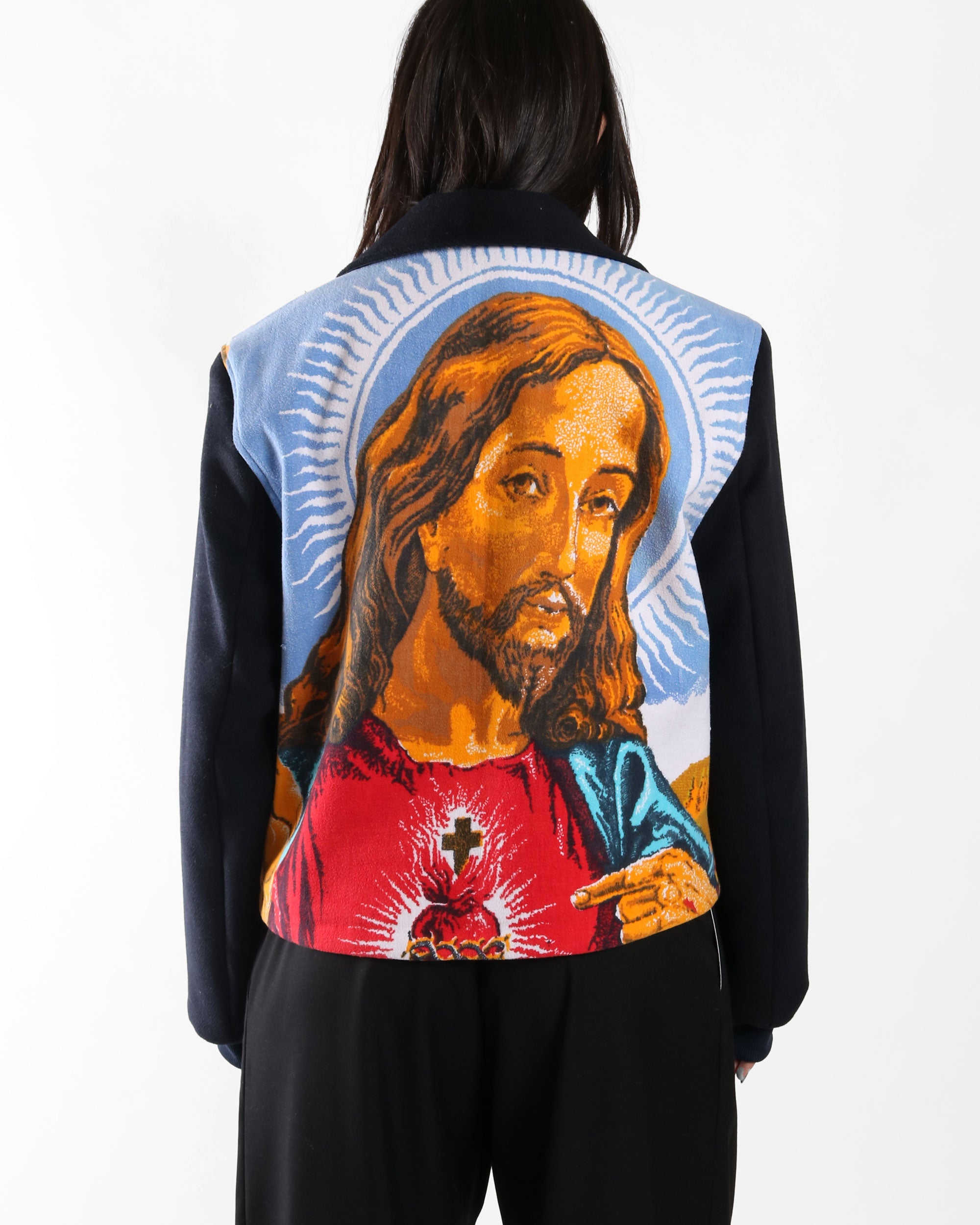 A straight-cut bomber jacket featuring a body made from an up-cycled printed textile depicting Jesus Christ, contrasted with clean black wool sleeves. The classic bomber silhouette grounds the graphic imagery, creating a direct, unapologetic statement that plays with symbolism, iconography, and everyday wear.