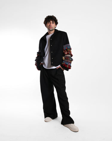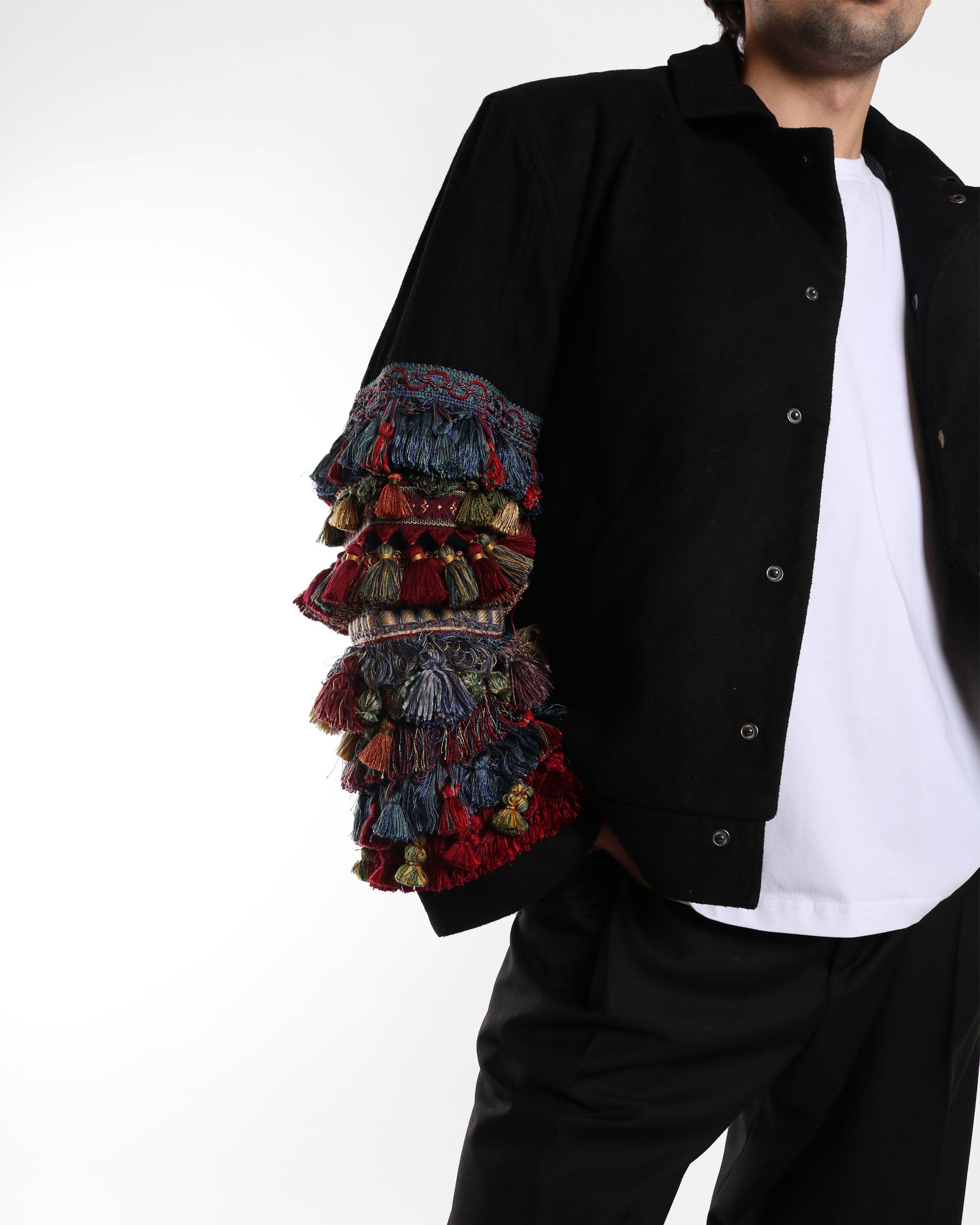 A bomber jacket with a clean, straight silhouette, crafted from dead stock wool blend fabric. The sleeves are finished with layered tassel details, adding movement, texture, and a bold decorative contrast to the minimal body of the jacket. A playful yet wearable piece that balances craft and everyday outerwear.