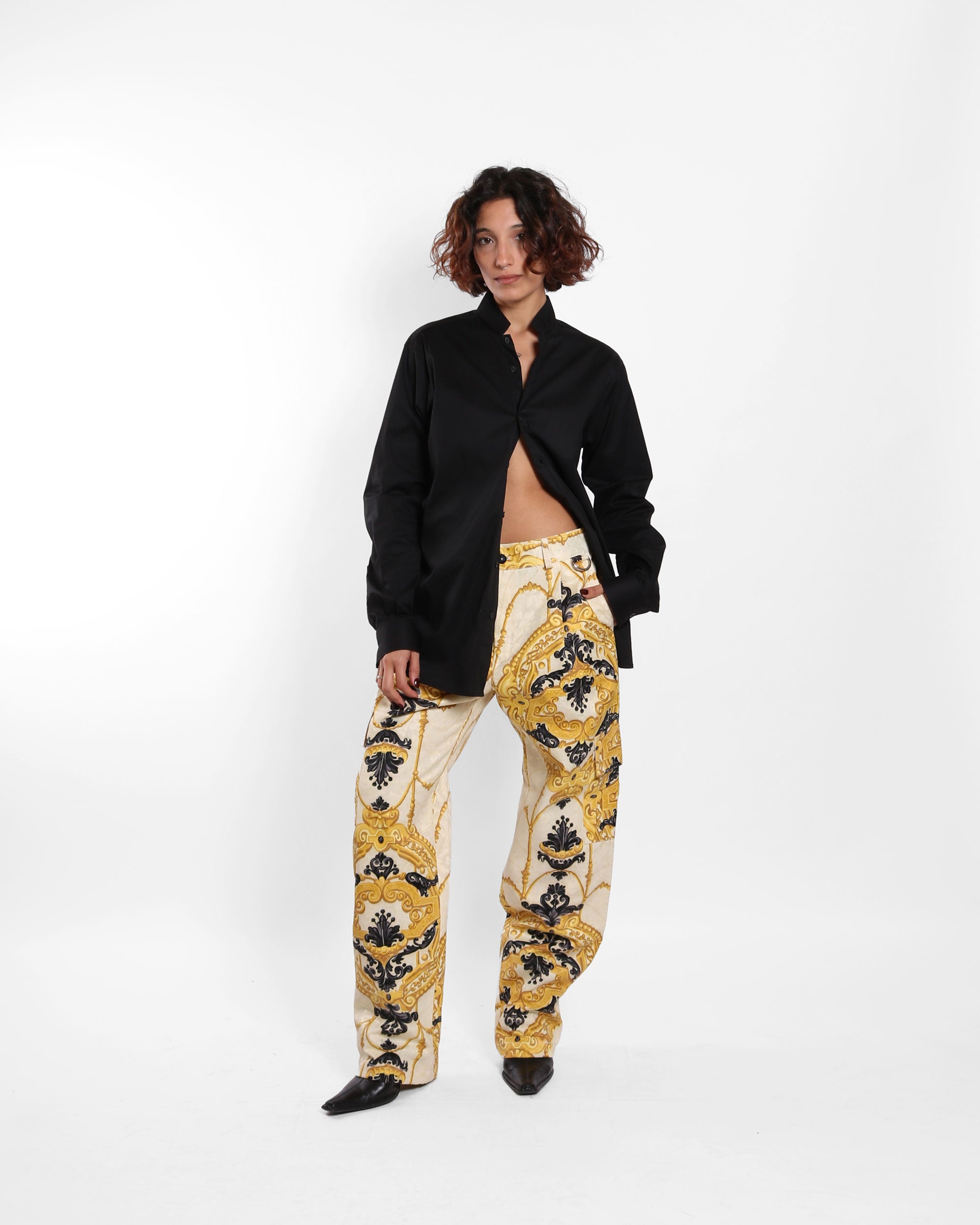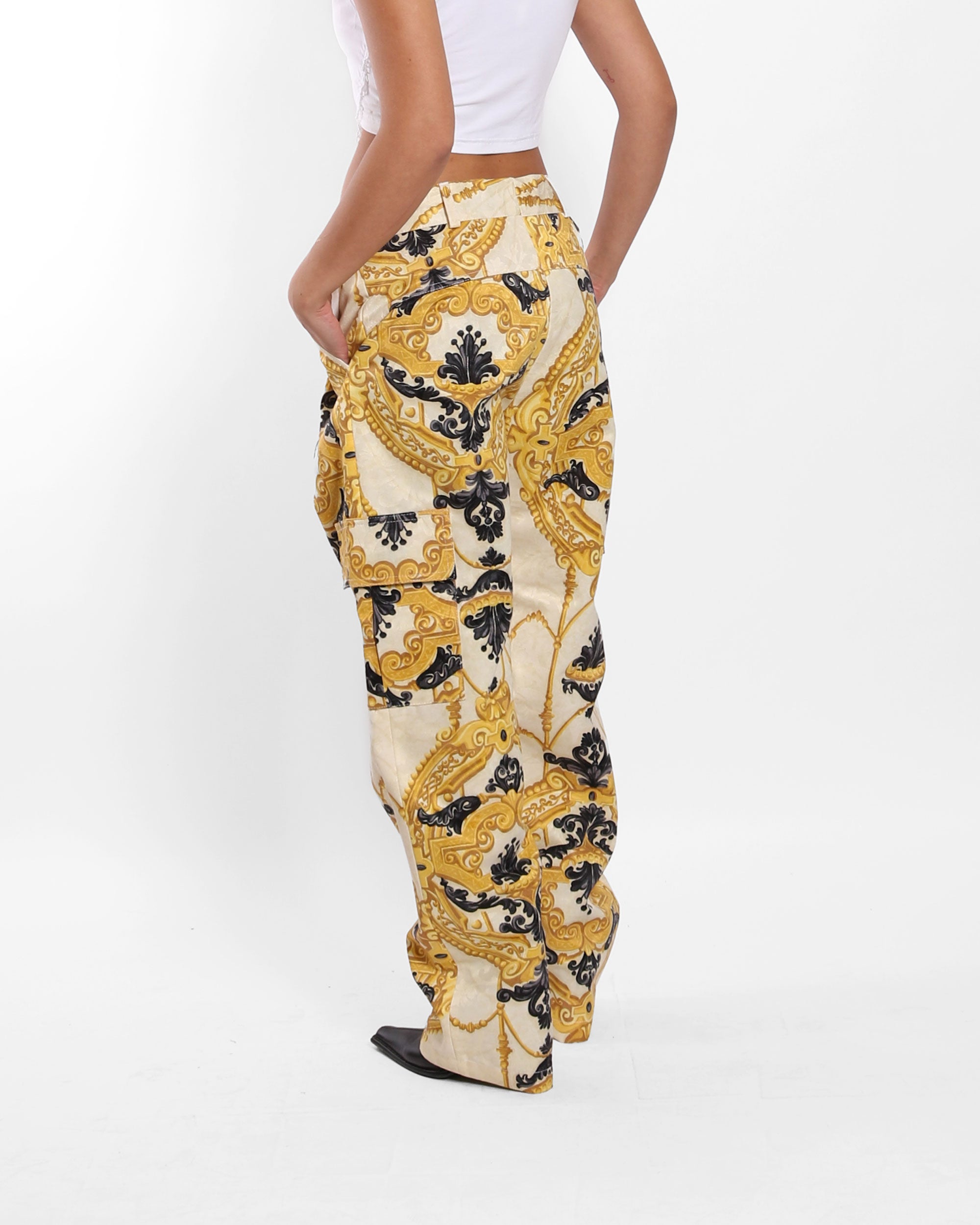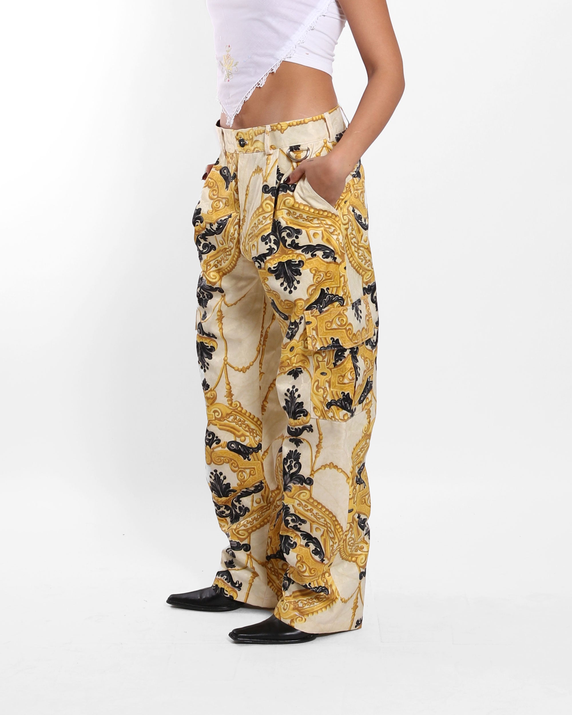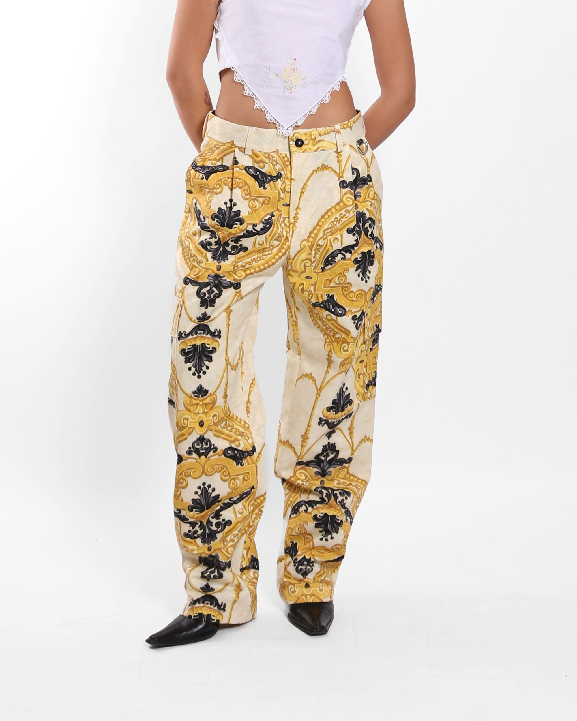 A playful pair of wide-leg cargo pants made from a thrifted cotton textile featuring a baroque print. The silhouette is relaxed and structured with front pleats, two side pockets, two cargo pockets, and a silver D-ring belt loop detail.