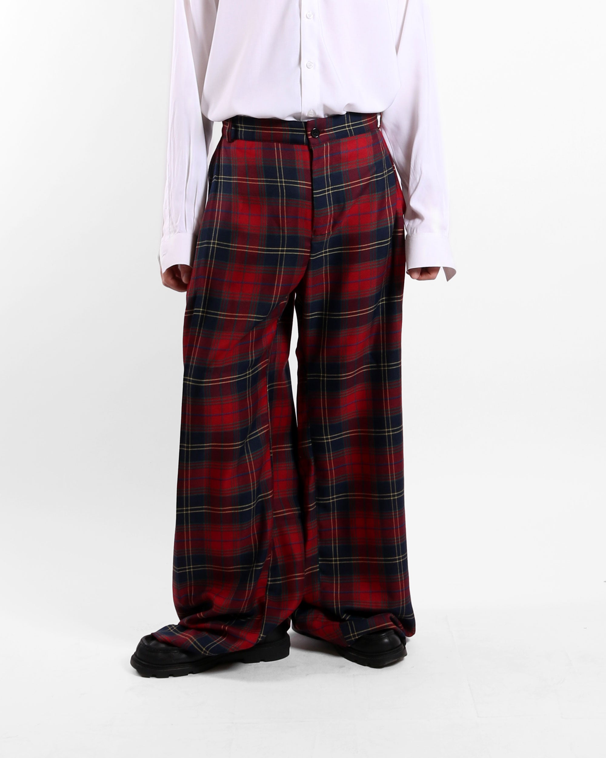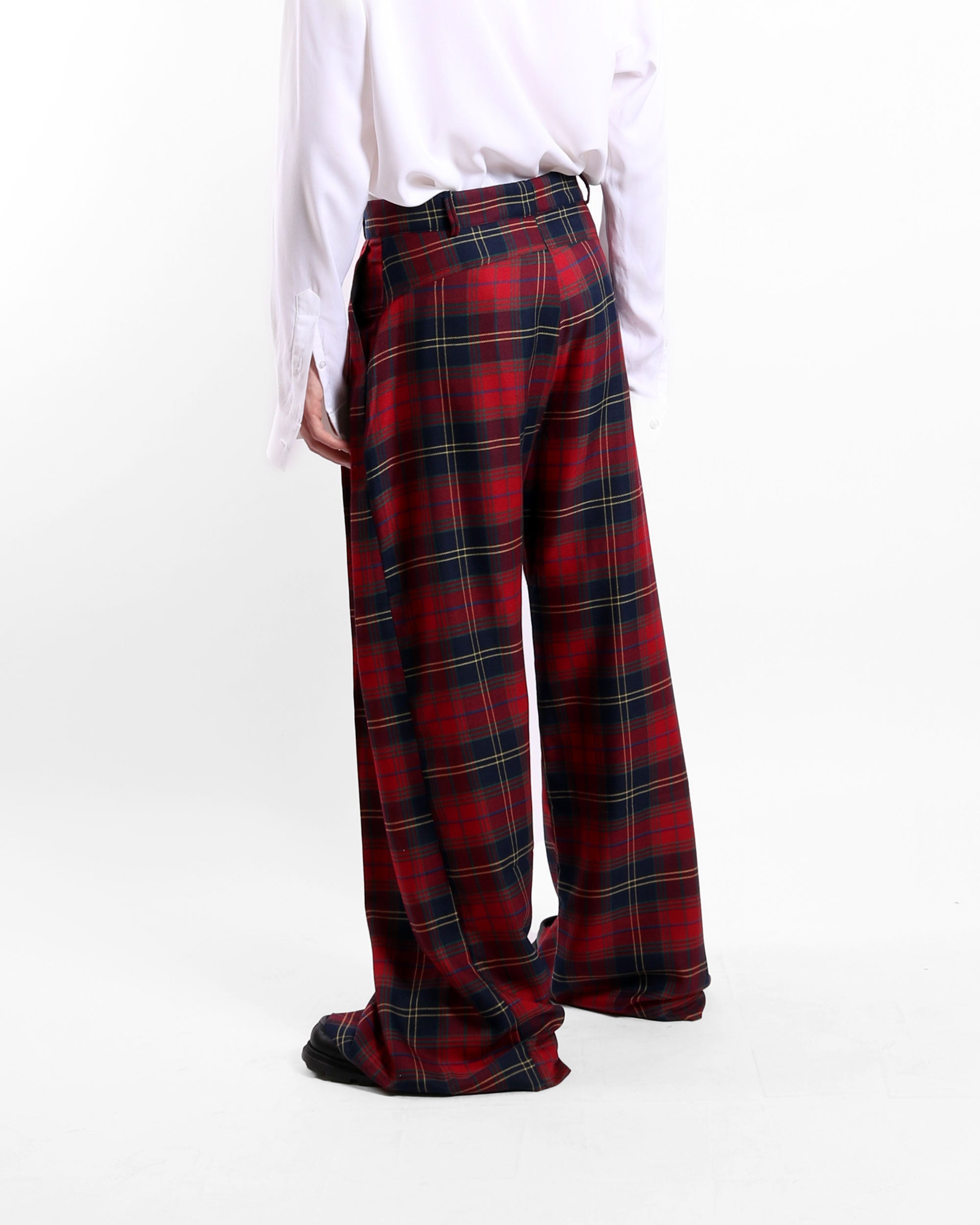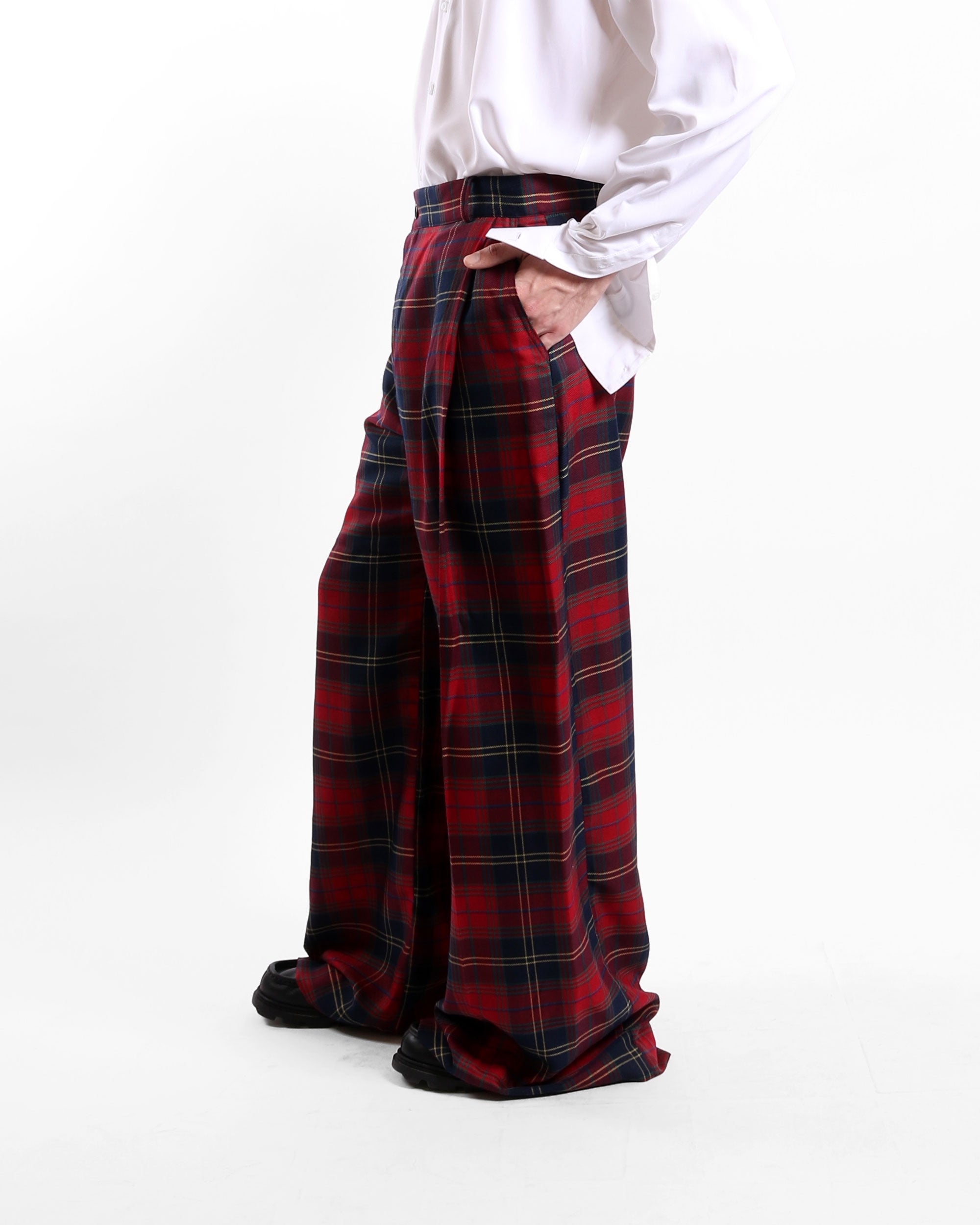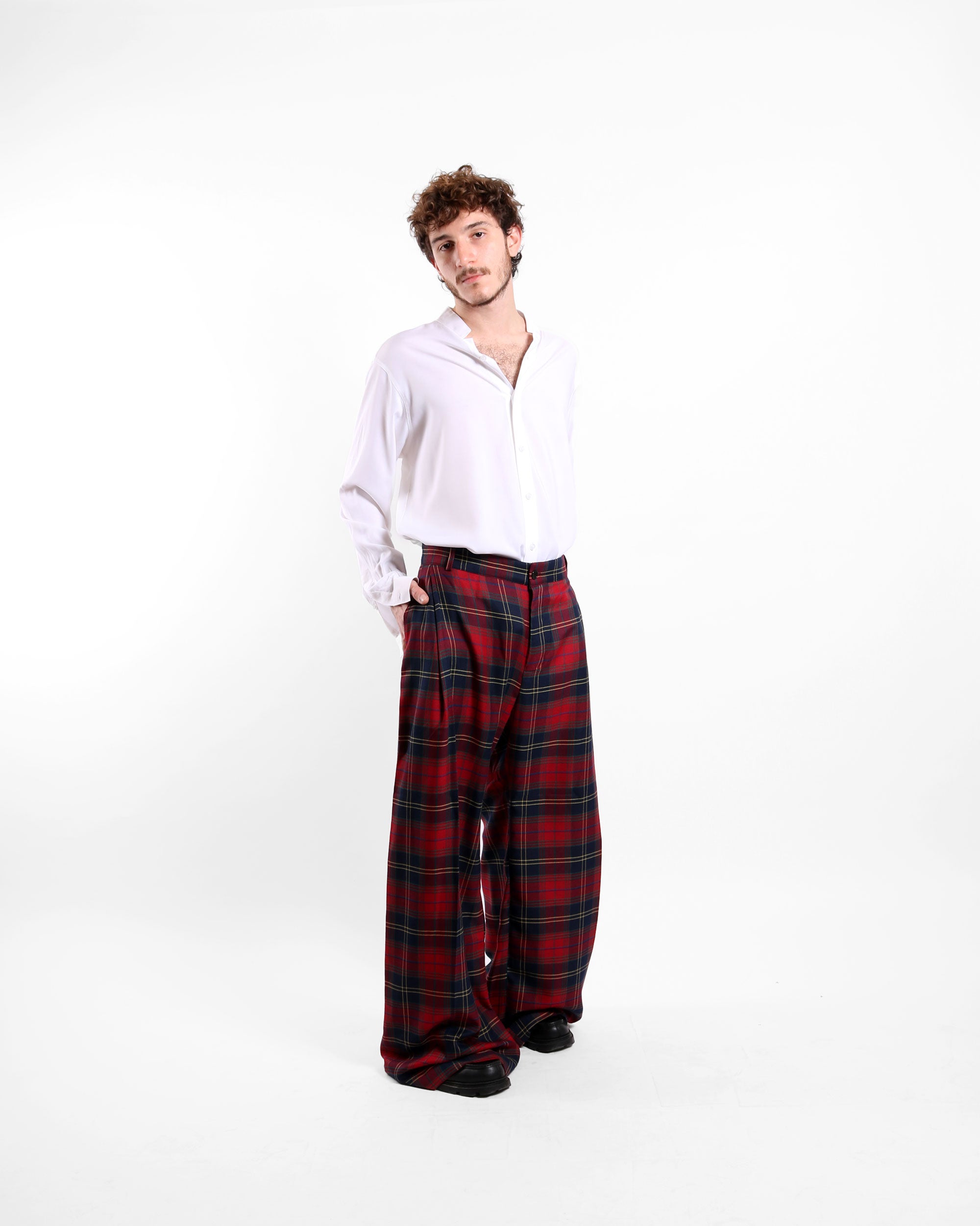 Easy, fluid, and built for comfort. These pleated pants are crafted from soft checkered fabric in deep red and navy tones. Designed with a tailored waistband, front pleats, and side pockets, they create a relaxed yet sharp silhouette with beautiful drape and movement.