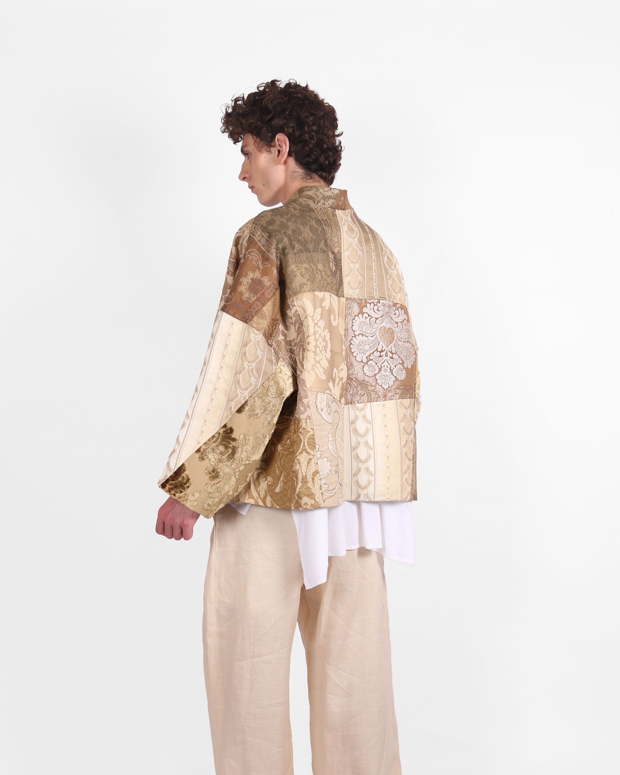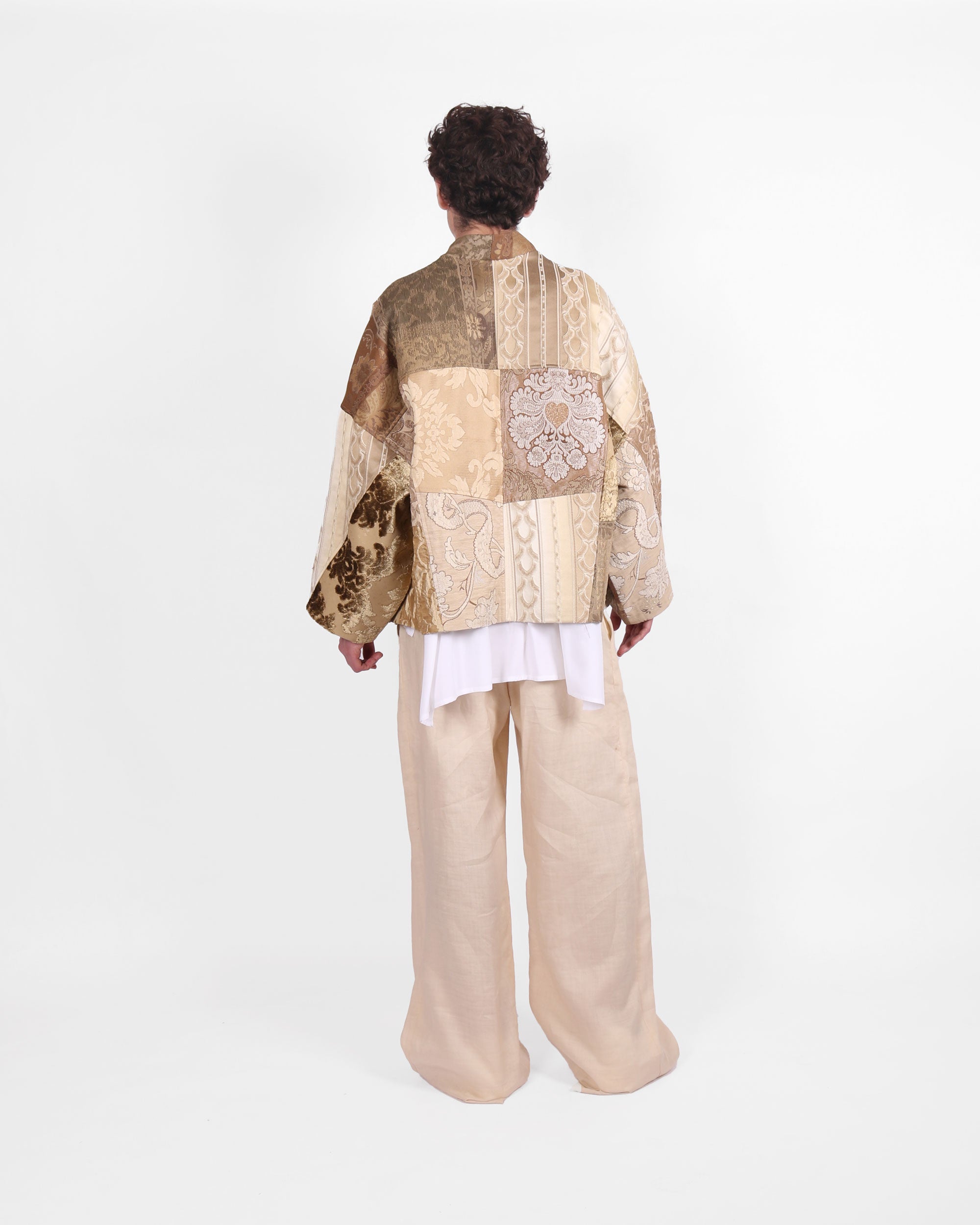 A Wide Cut Kimono Jacket with long sleeves, pockets, and a band collar.