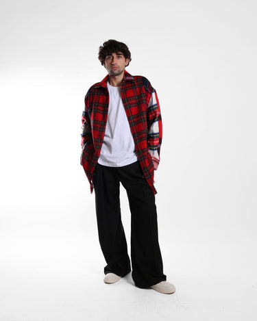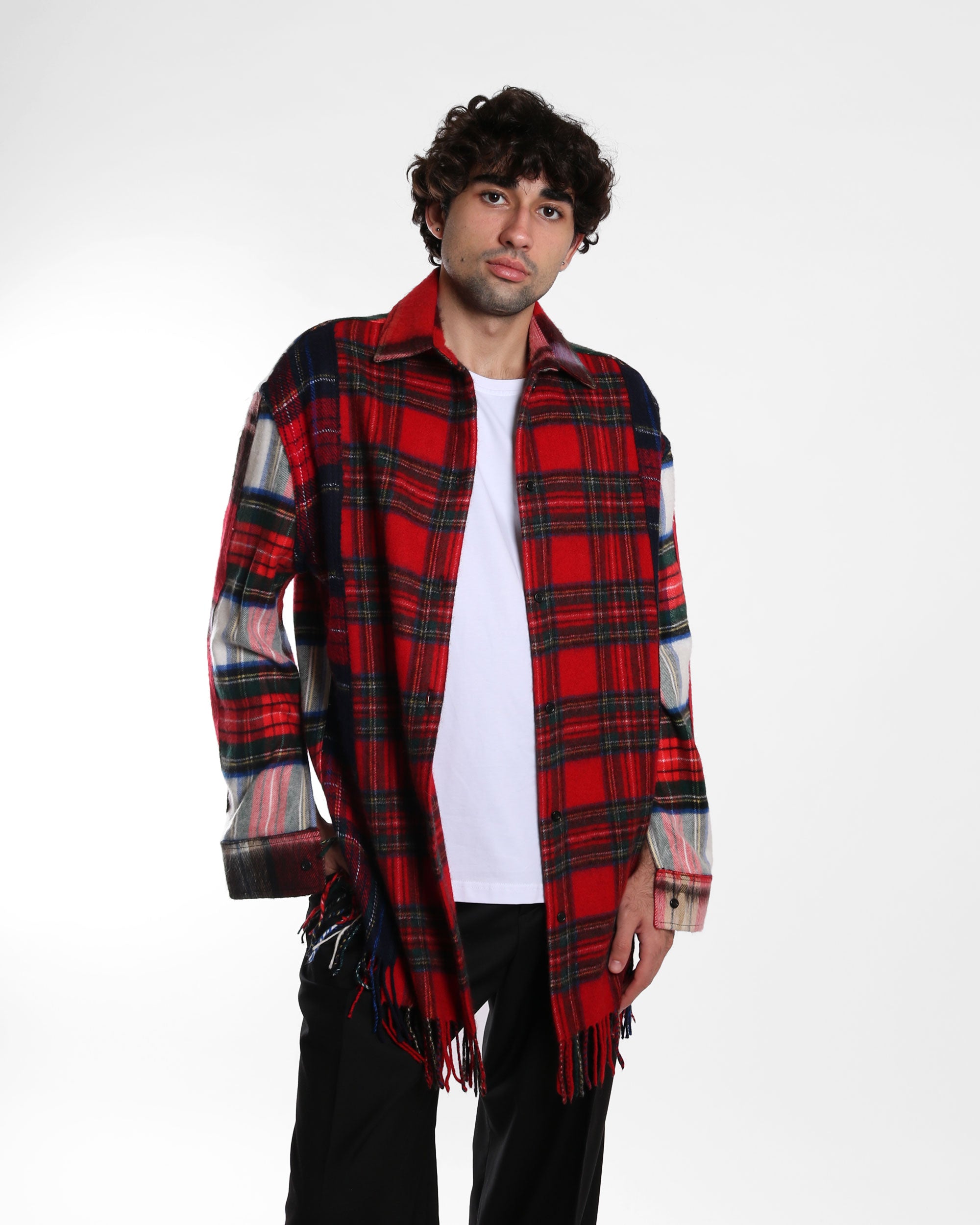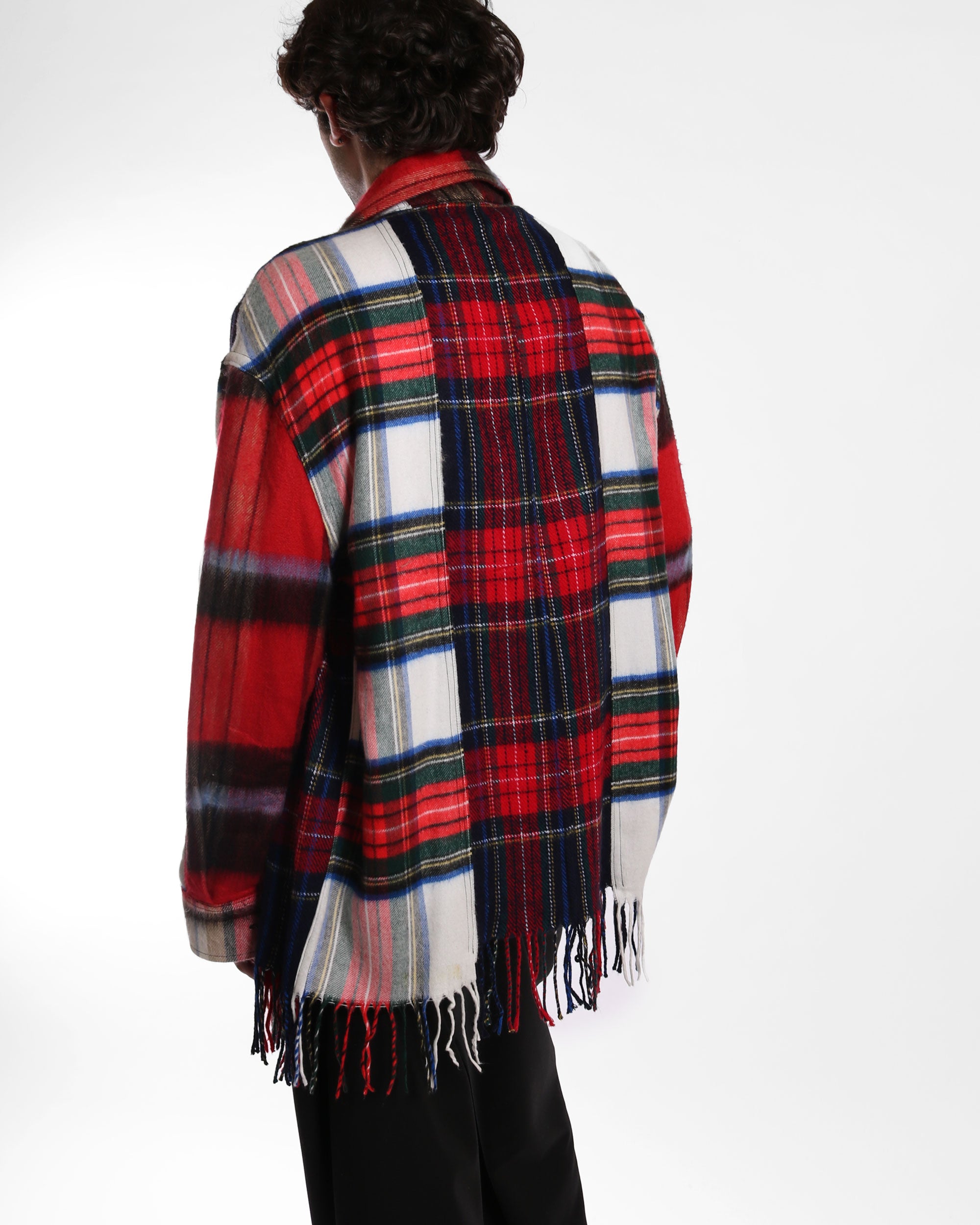 A shirt constructed entirely from wool scarves, combined to create a relaxed, elongated silhouette with visible patchwork and raw fringed edges. Familiar winter accessories are reworked into a lightweight outer layer, blending warmth, texture, and graphic patterning in an easy-to-wear form.