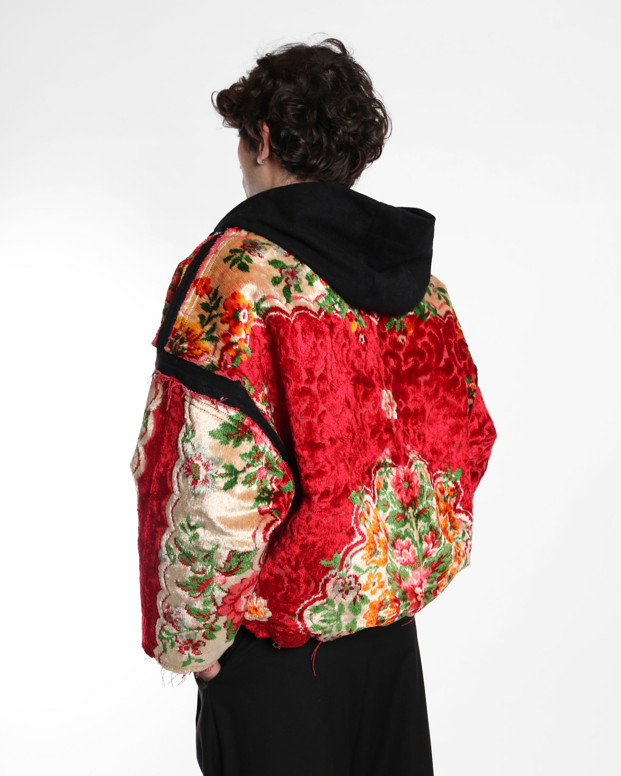 A cozy hoodie crafted from a soft wool base, featuring carpet panels on the front and back for added texture and bold character. Designed with a relaxed fit, dropped shoulders, and a hood, this piece blends everyday comfort with standout craftsmanship.