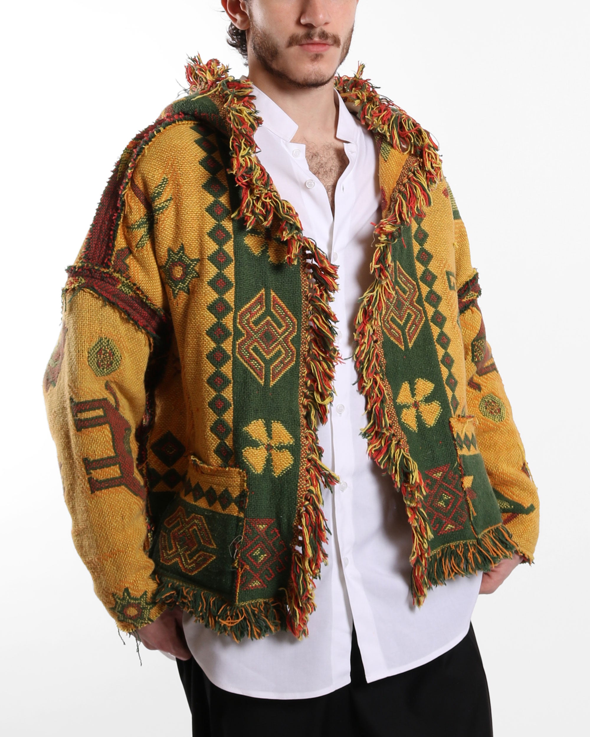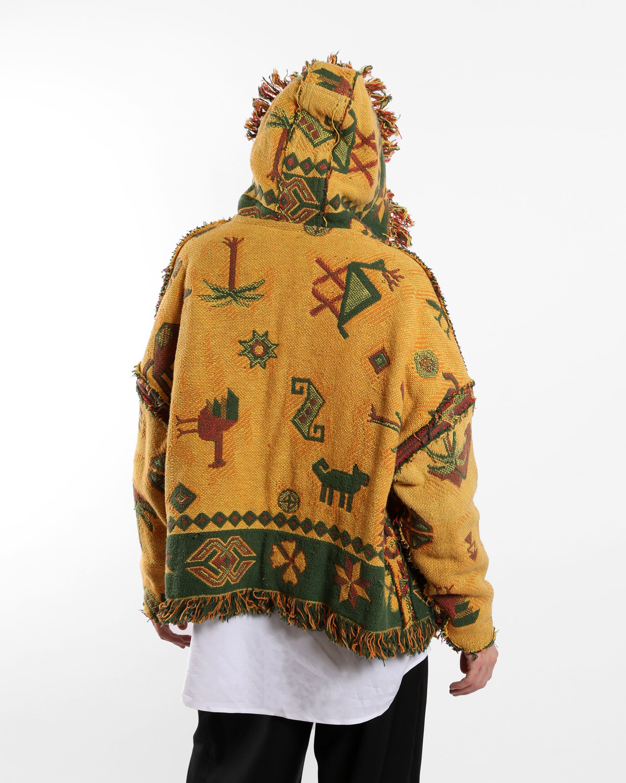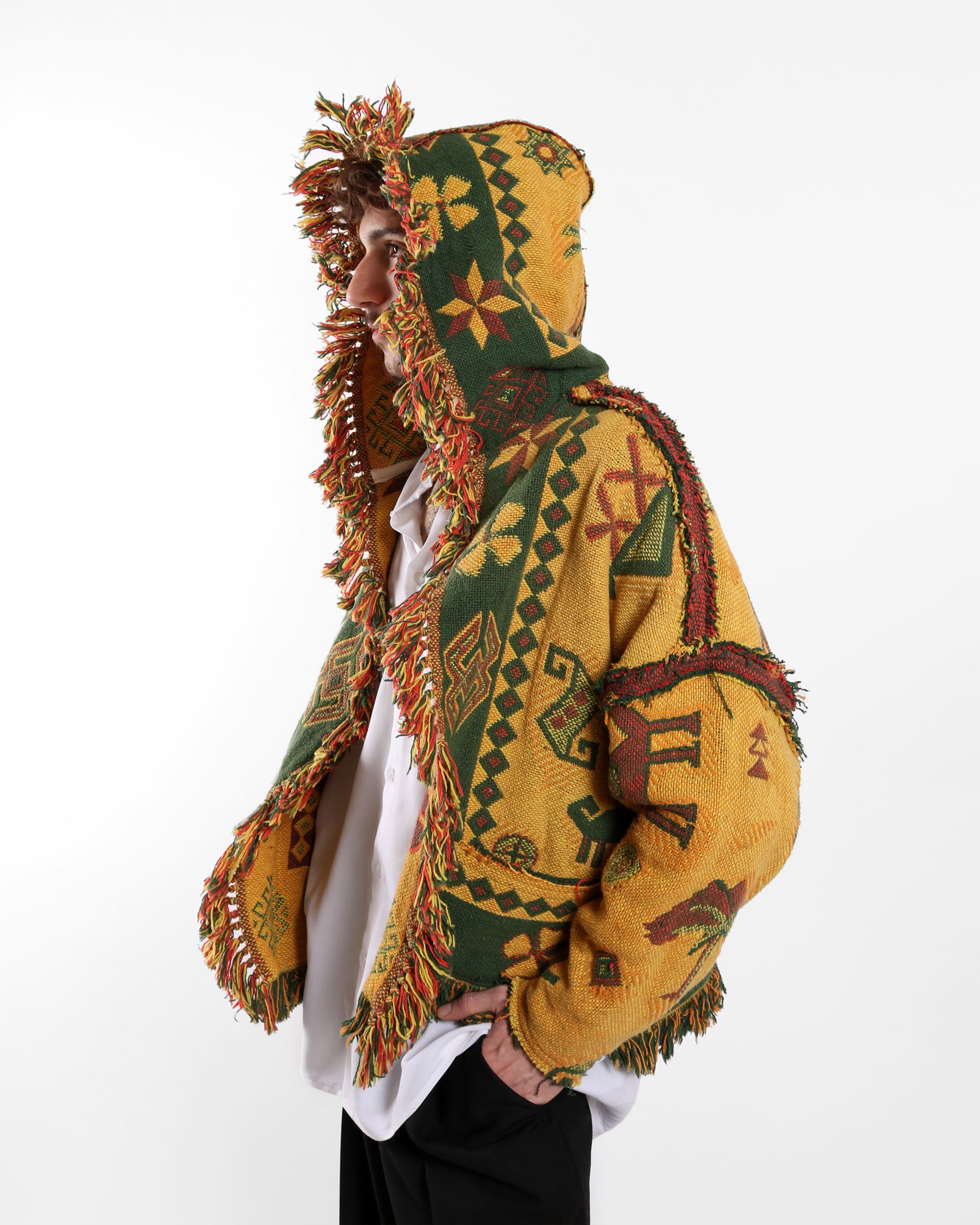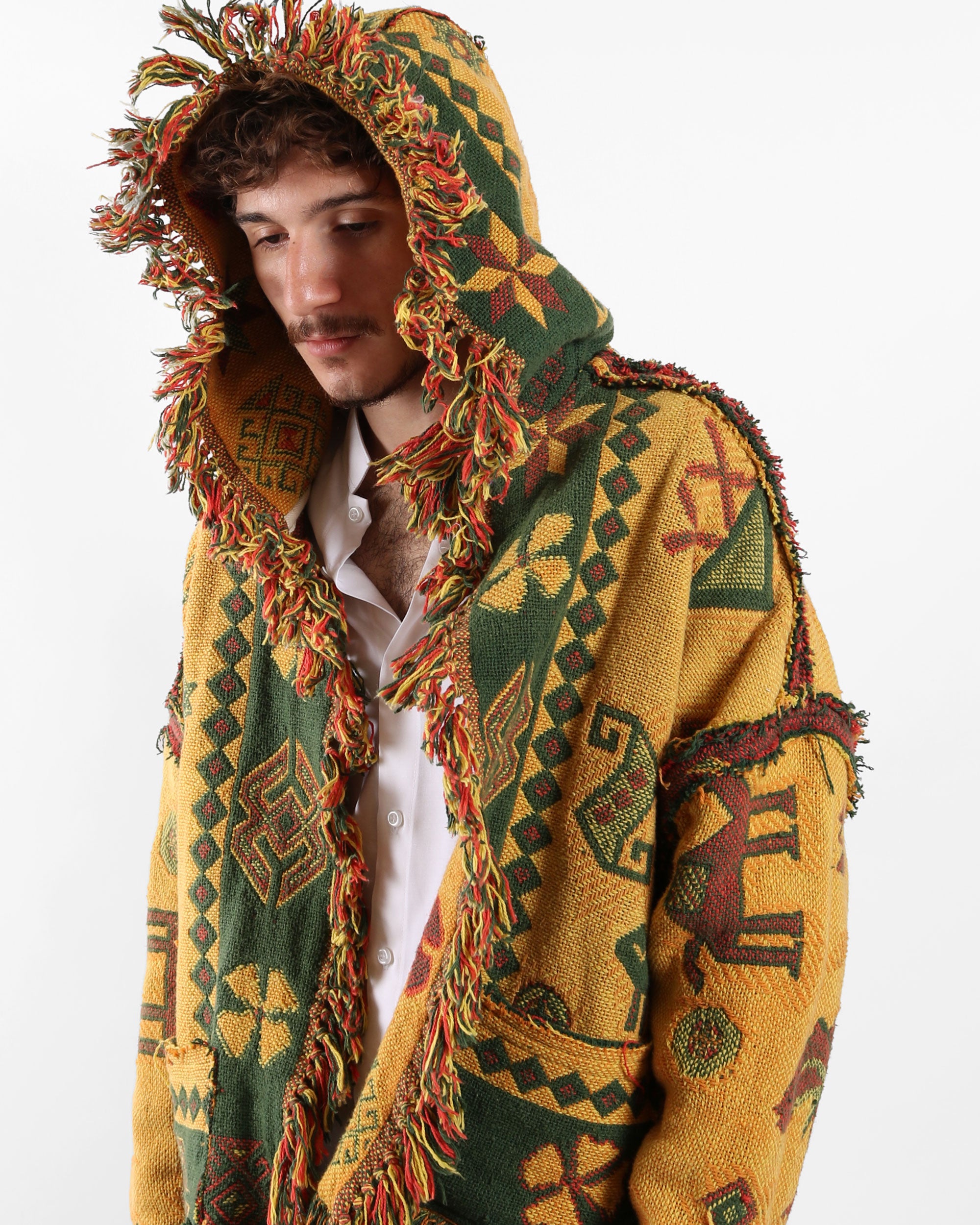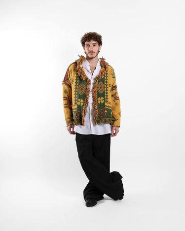 A statement piece that blurs the line between outerwear and art. This open-front hoodie is cut from a thrifted jacquard blanket in rich mustard and forest green tones. The wide silhouette gives it a relaxed, easygoing attitude, while hand-fringed edges and a generous hood add movement and playfulness.