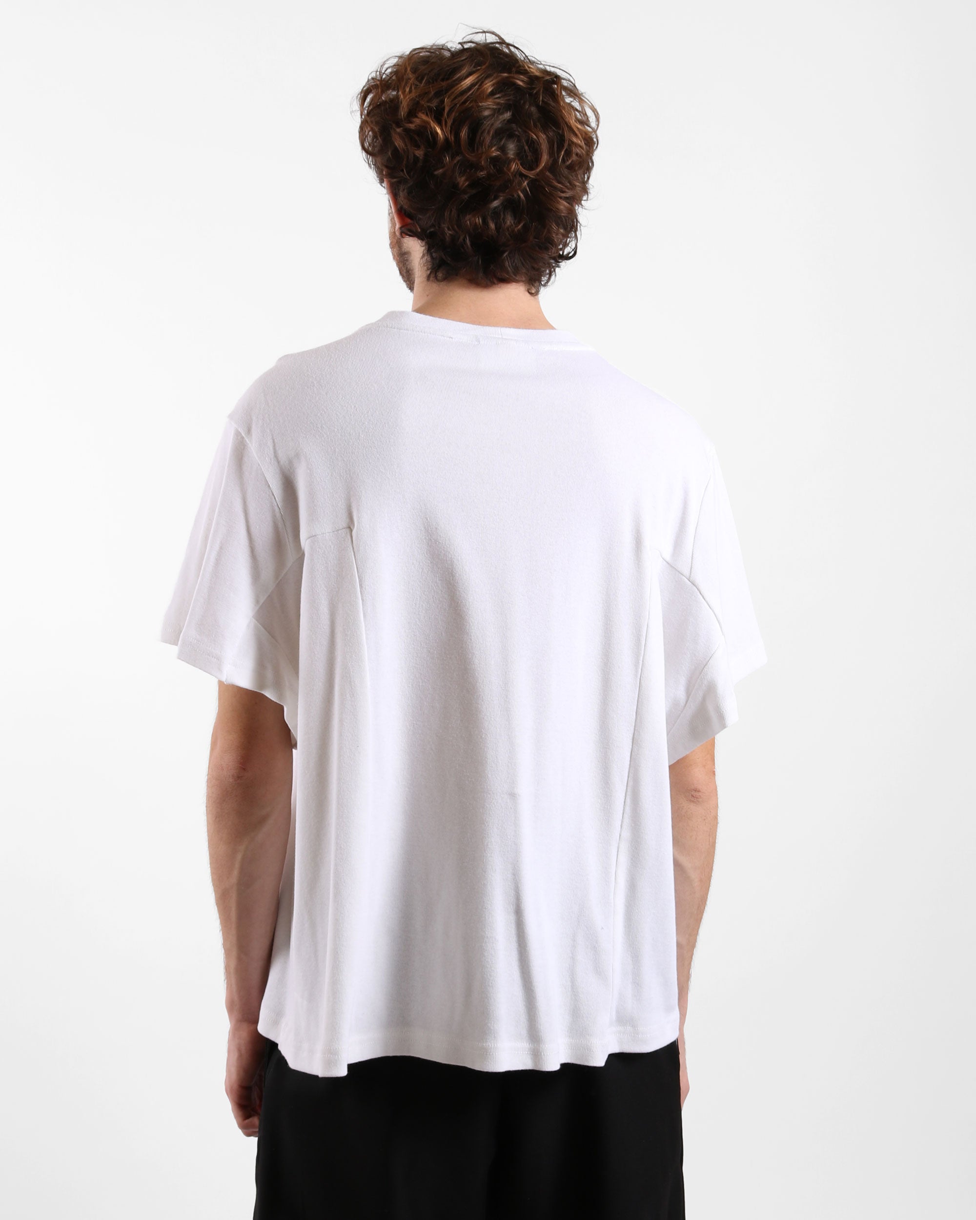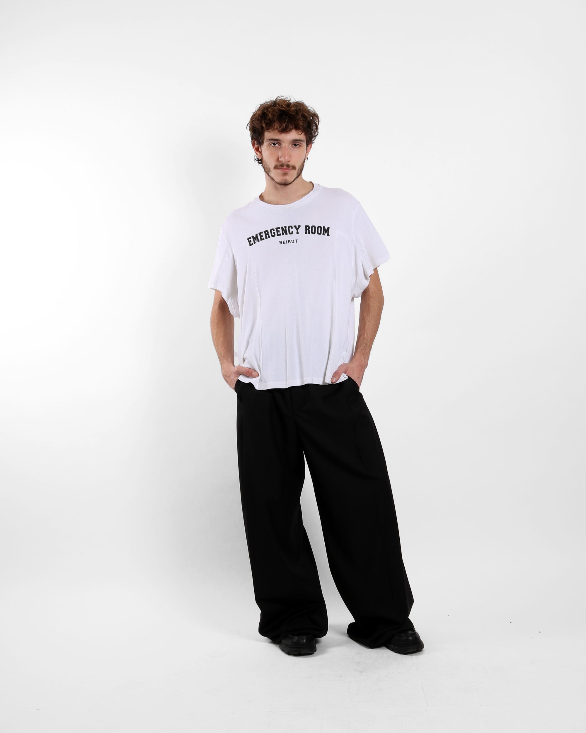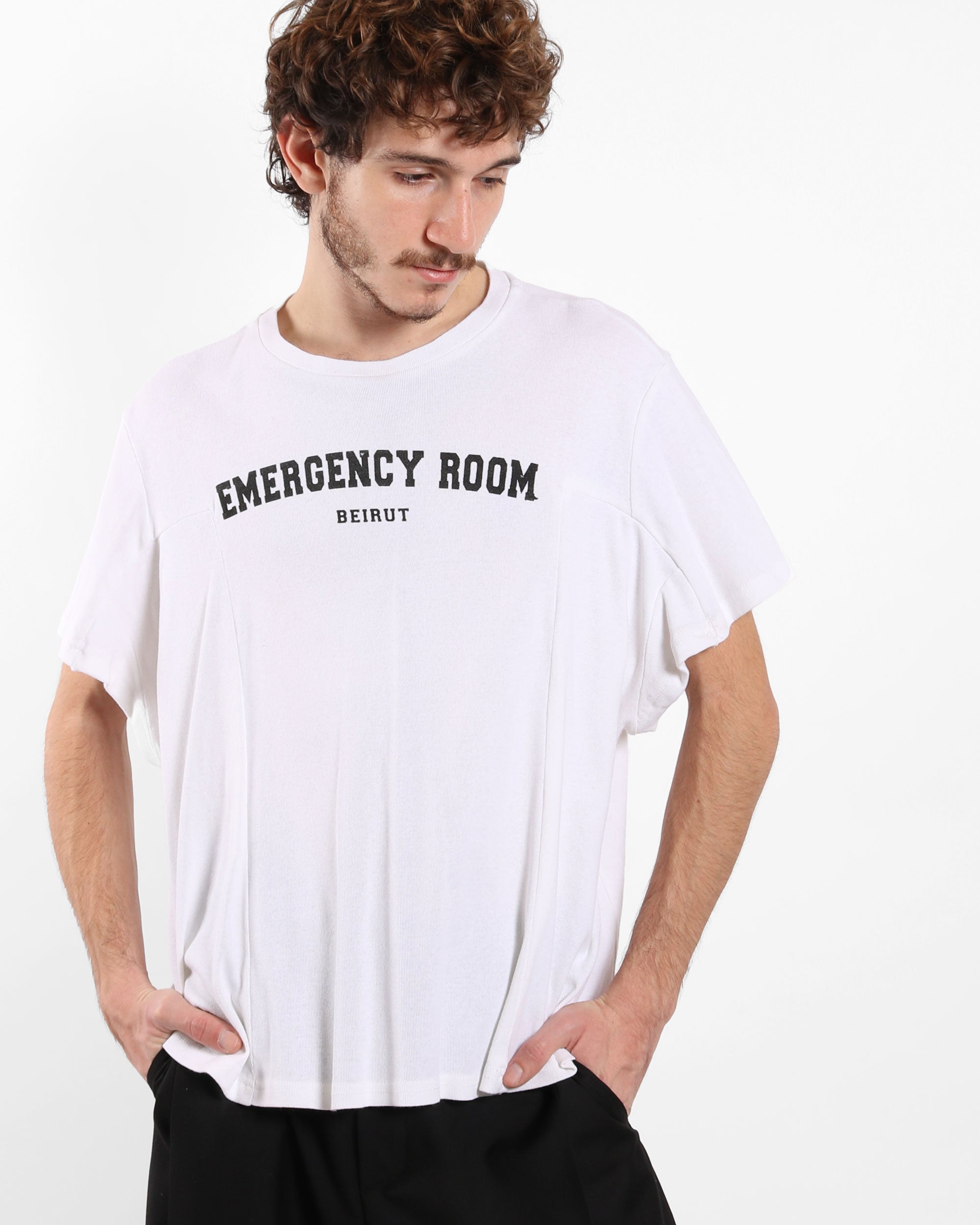 Made from two thrifted t-shirts, this one-of-a-kind piece features a silkscreened Emergency Room Beirut logo. Designed with a wide cut and a slightly cropped silhouette, it blends casual comfort with standout character.