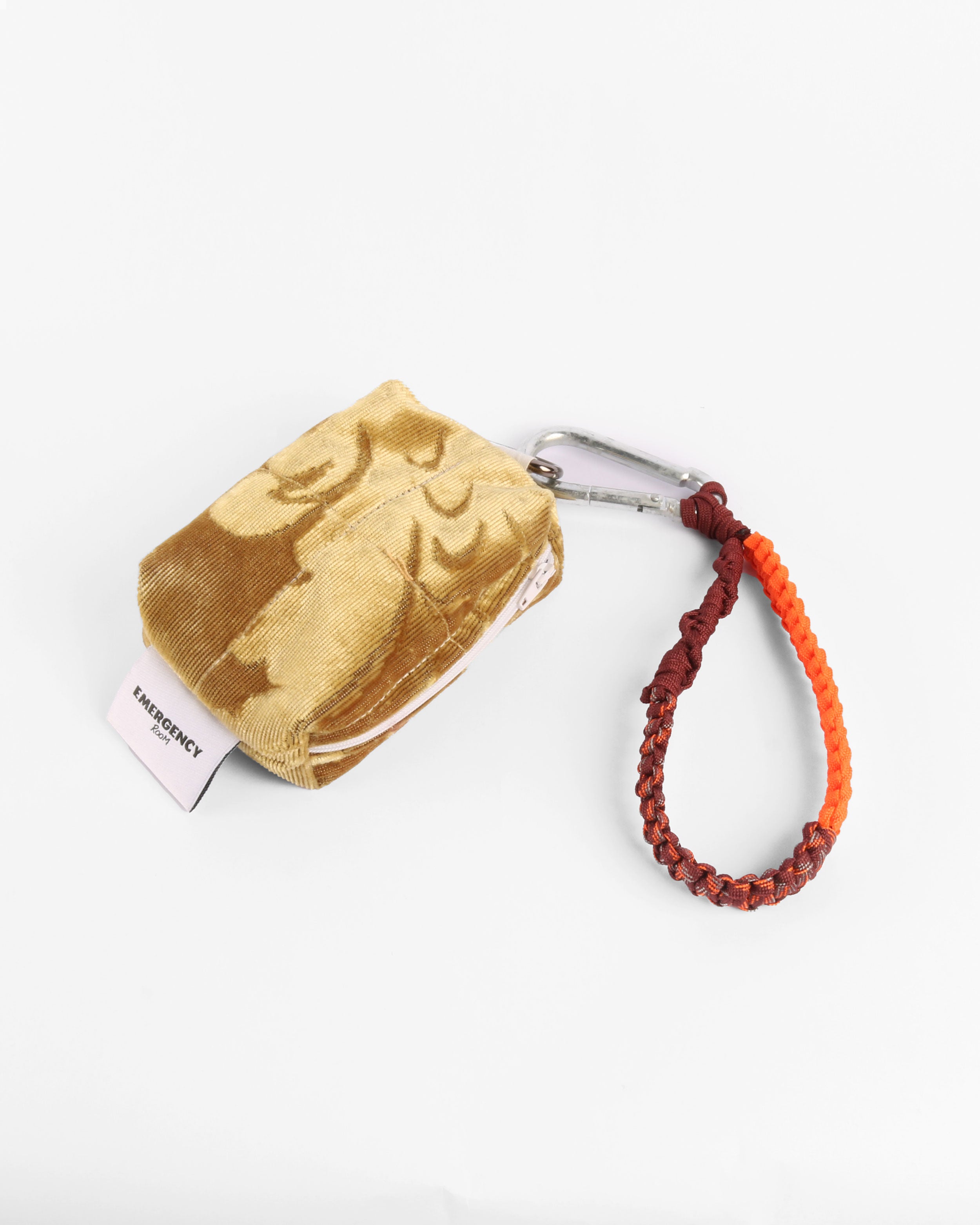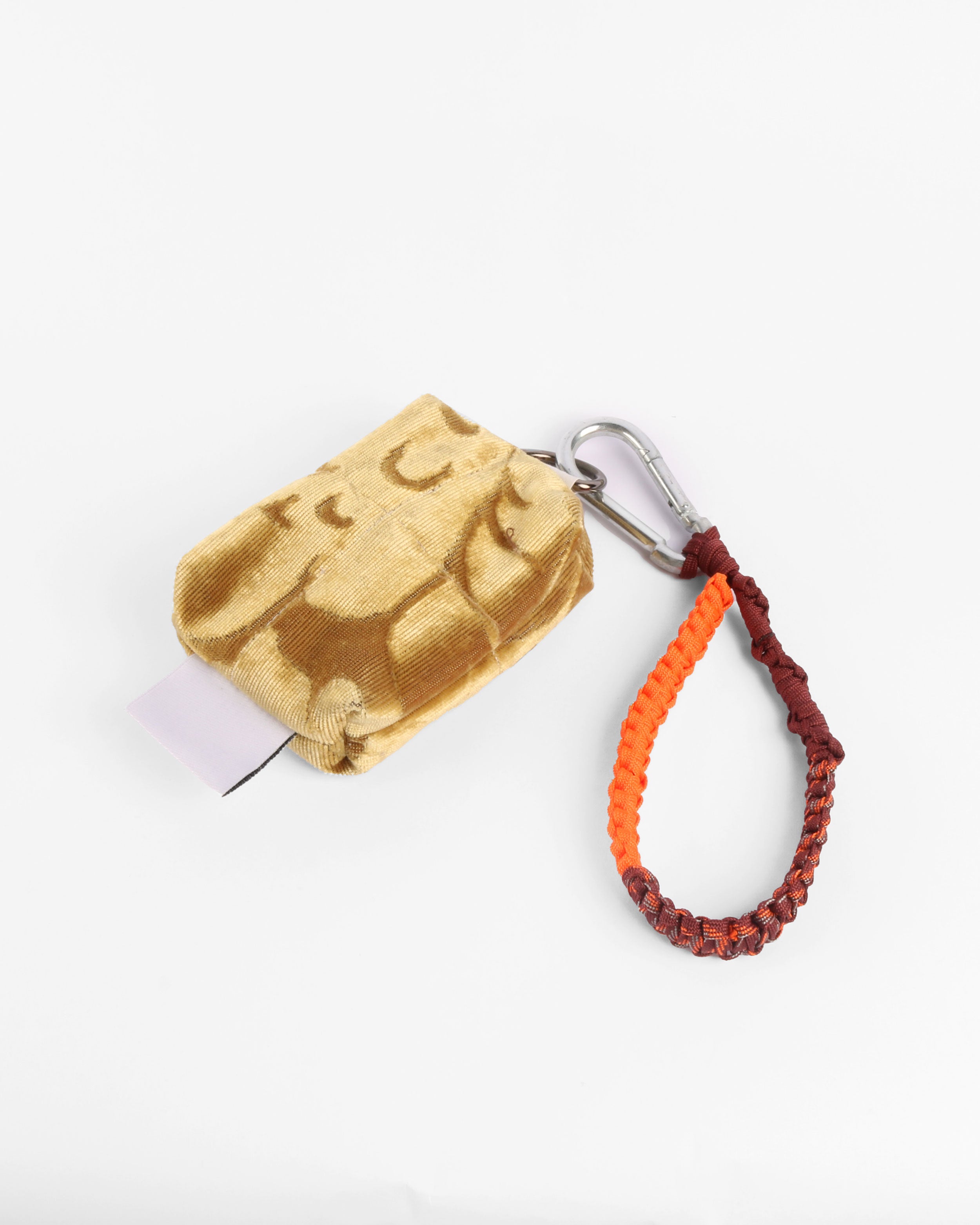 A mini pouch crafted from up-cycled fabrics. Features a compact silhouette with a hand-made macramé strap and a repurposed metal buckle, designed to clip onto pants or bags for effortless wear.