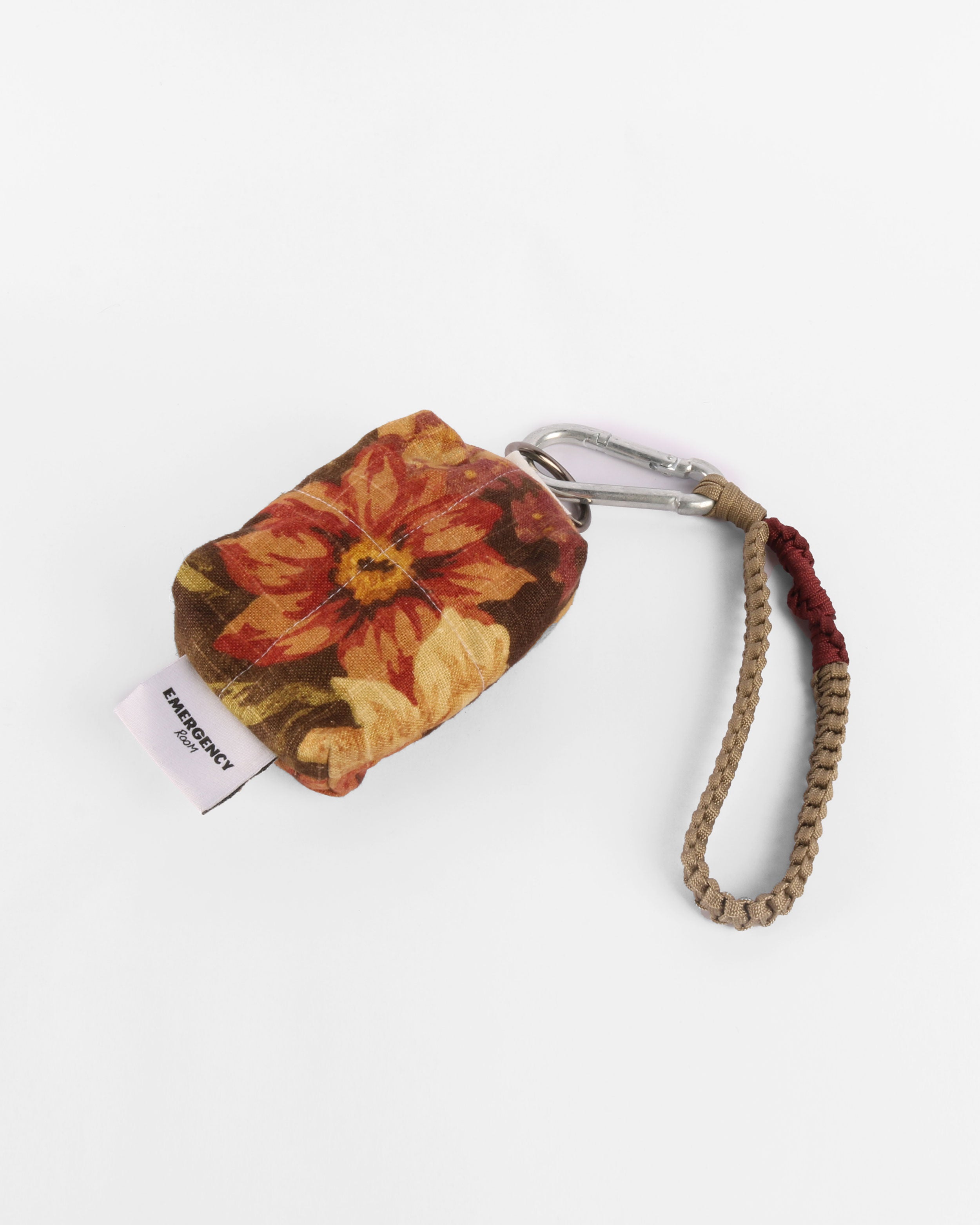 A mini pouch crafted from up-cycled fabrics. Features a compact silhouette with a hand-made macramé strap and a repurposed metal buckle, designed to clip onto pants or bags for effortless wear.