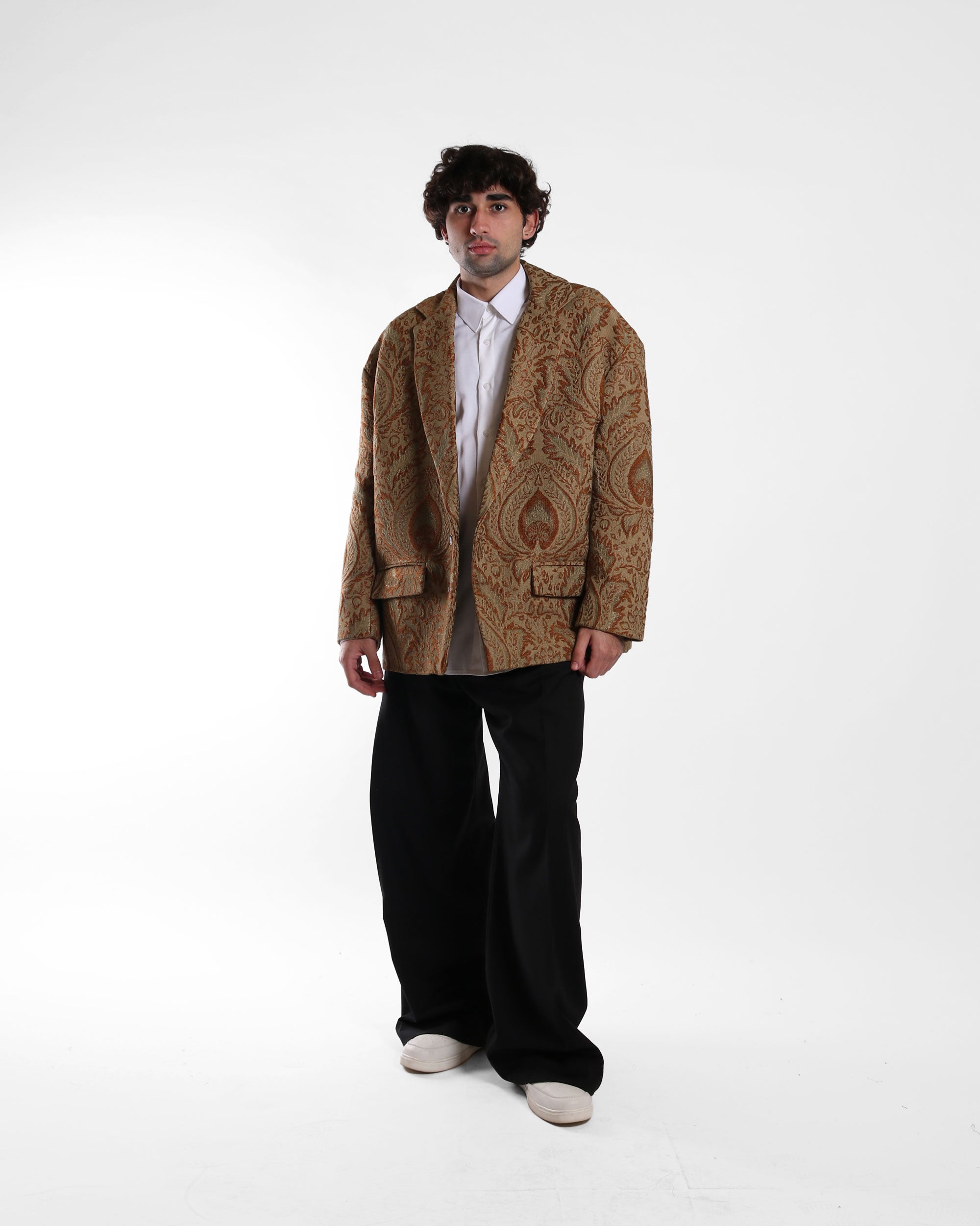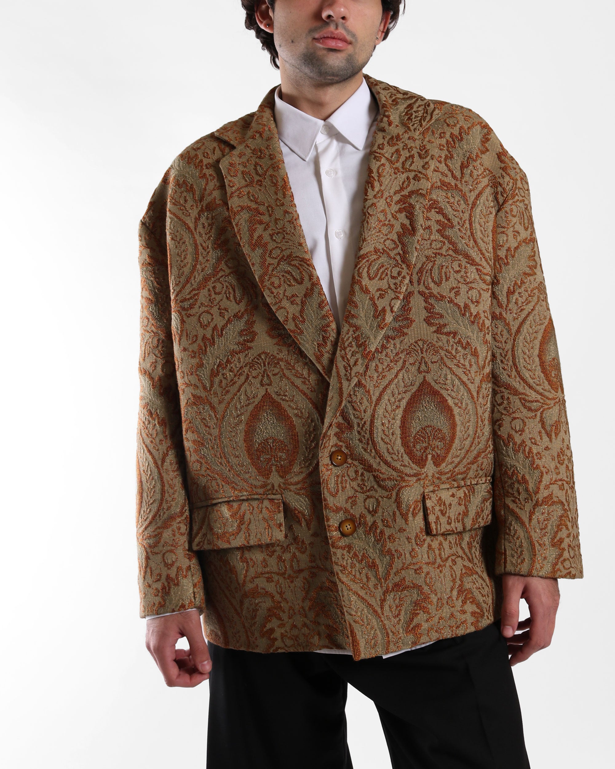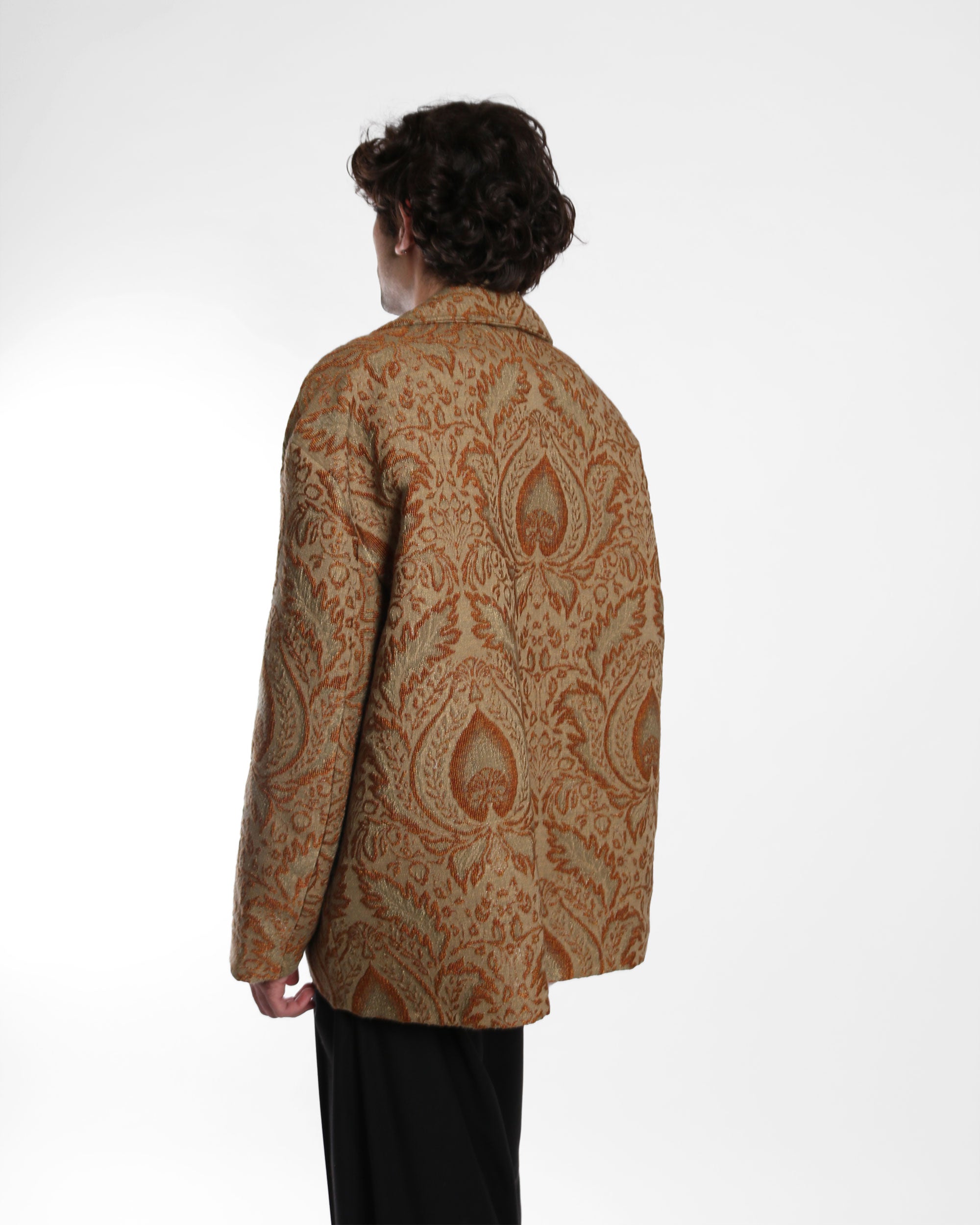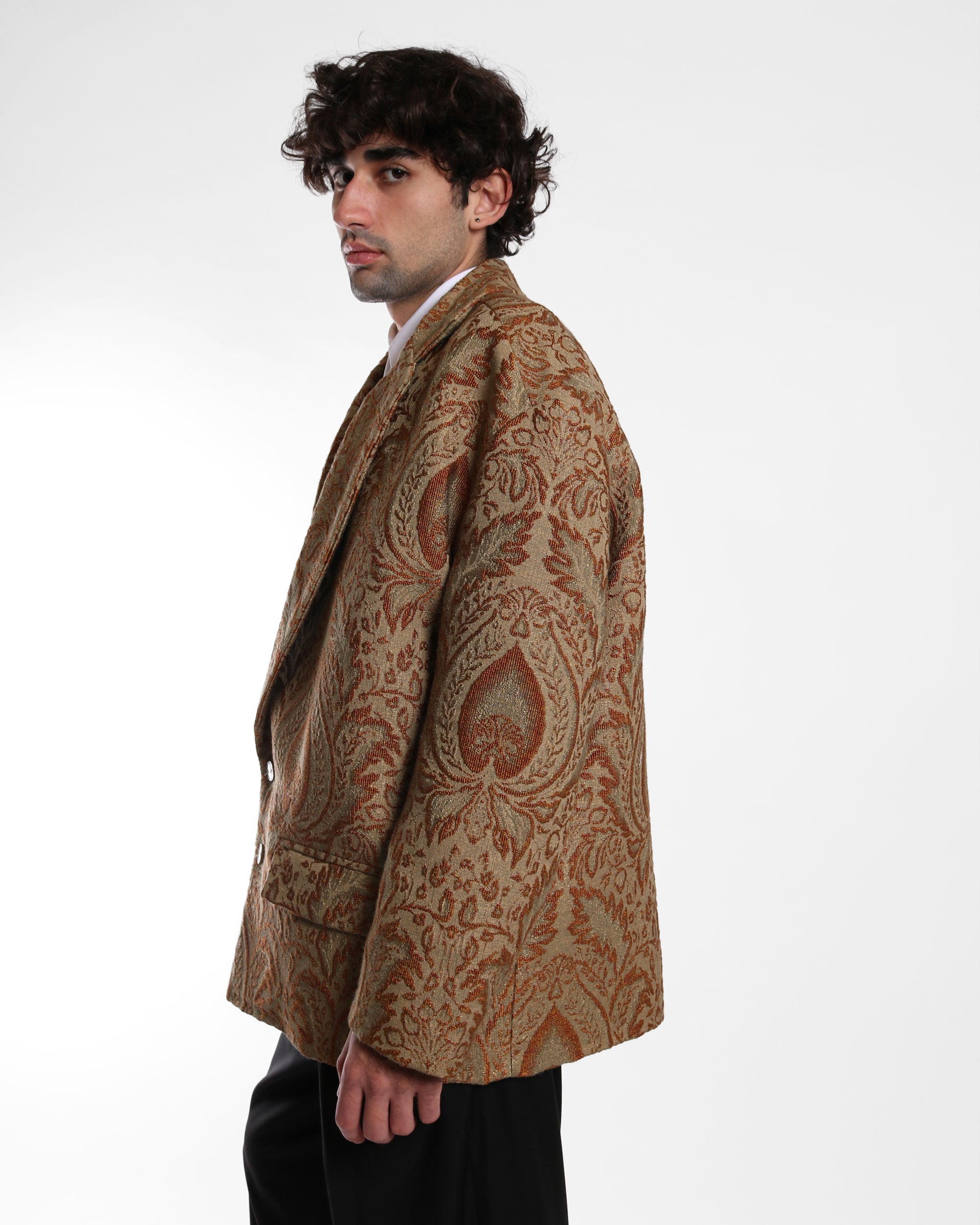 A statement blazer with dropped shoulders and a generous silhouette, cut in a luxurious deadstock jacquard upholstery fabric. Features notched lapels, front flap pockets, and a double-button closure. The oversized fit makes it ideal for layering or elevating a simple look.