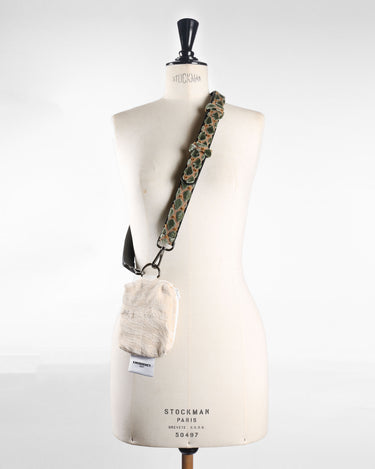 A compact pouch crafted from up-cycled fabric, featuring a structured, quilted finish. Designed for everyday functionality, it is paired with a statement adjustable strap built on a leather base, layered with fabric, and detailed with metal accessories.