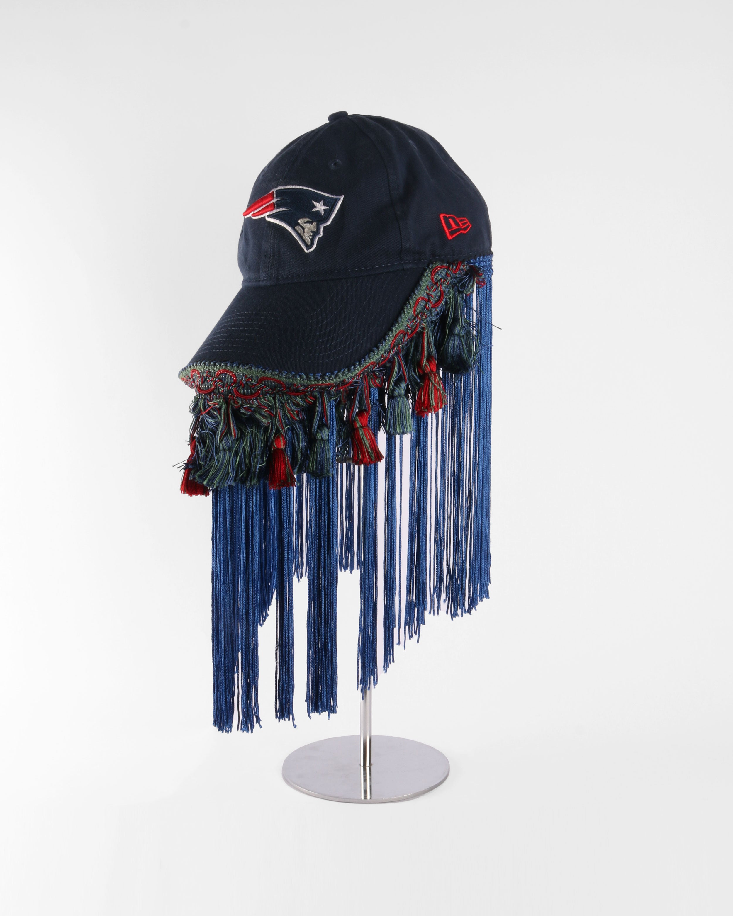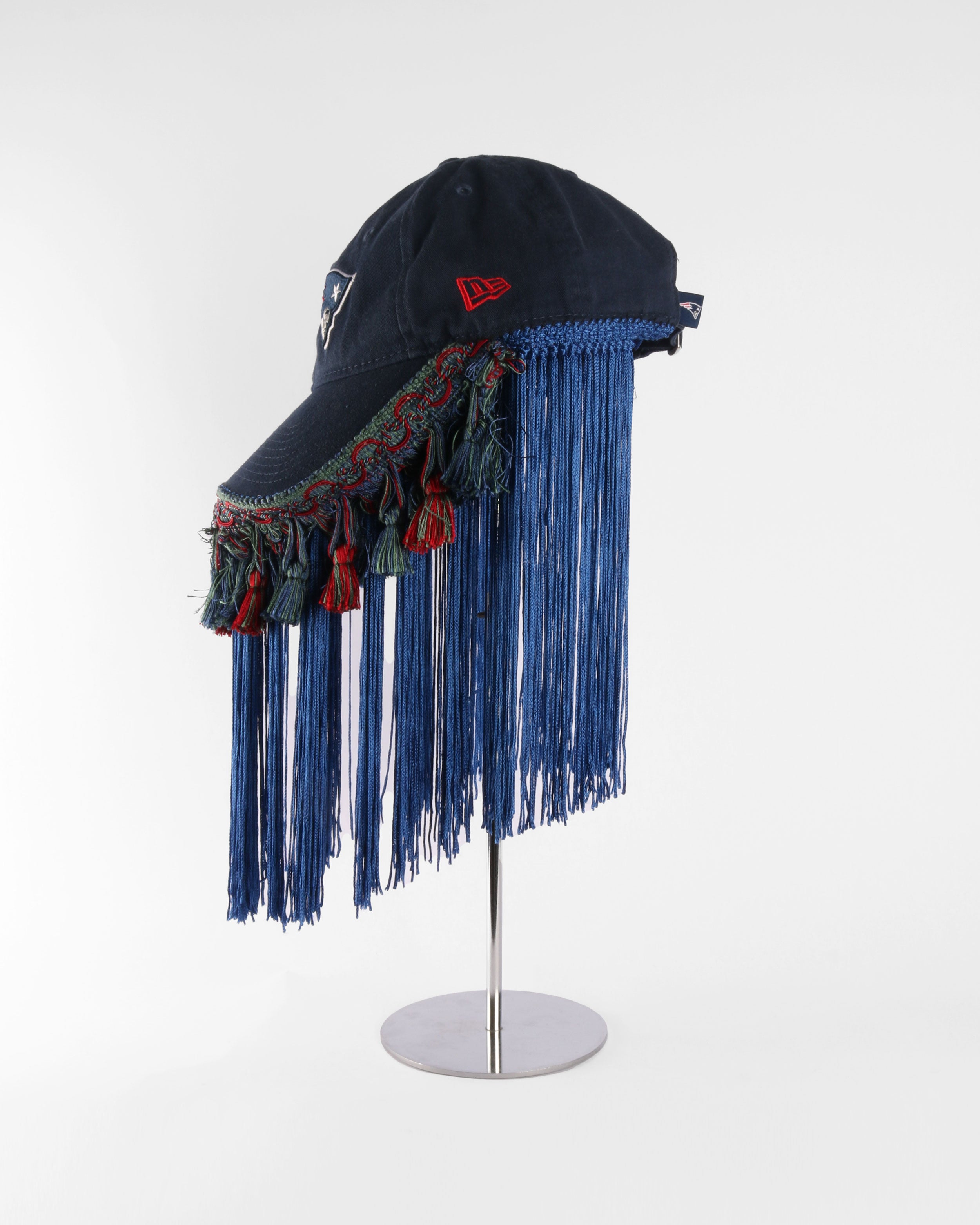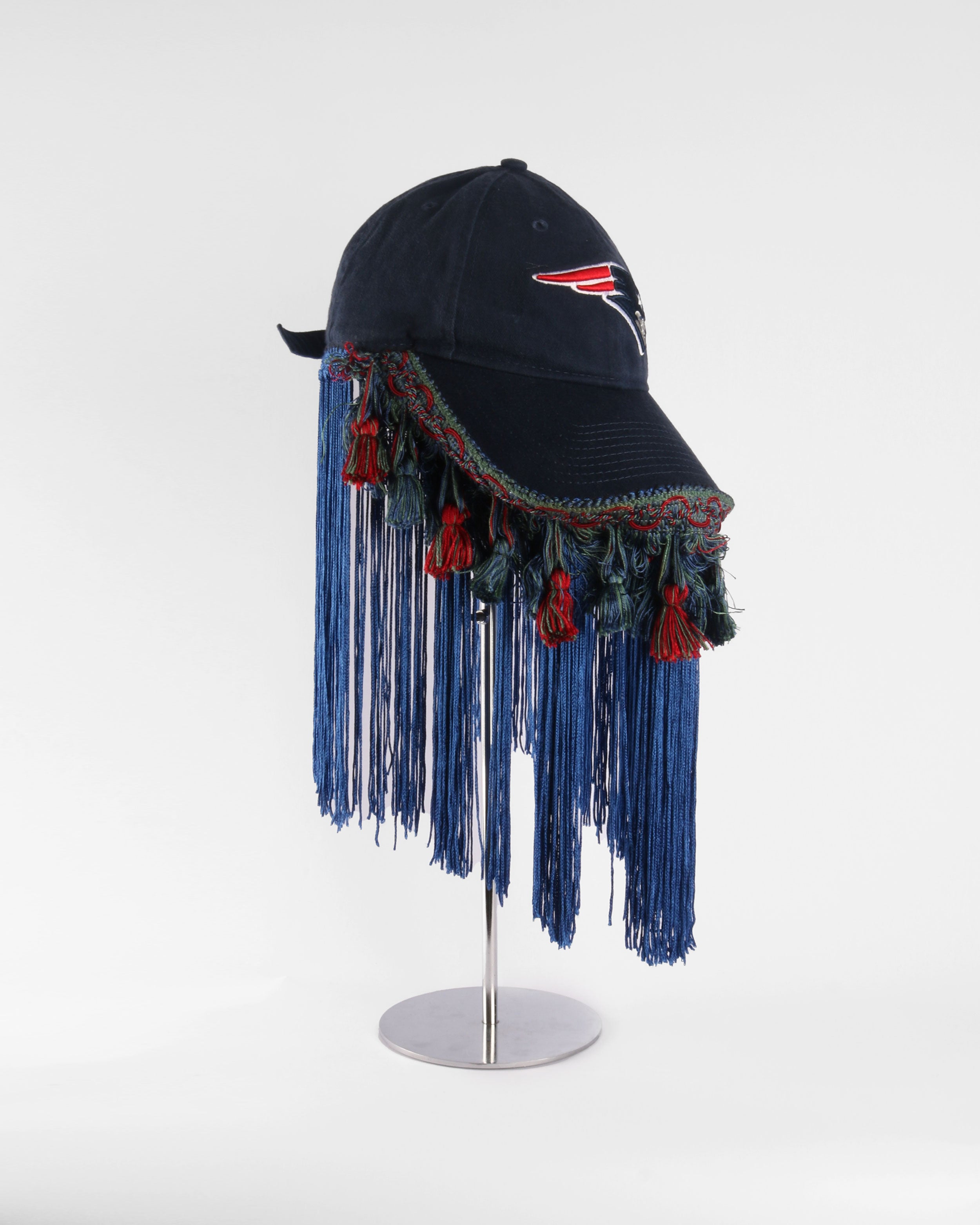 An upcycled cap reimagined through intricate detailing. Entirely handmade and adorned with layered tassels and textured fringes. This piece carries a bold, expressive character, transforming a casual silhouette into a statement accessory.