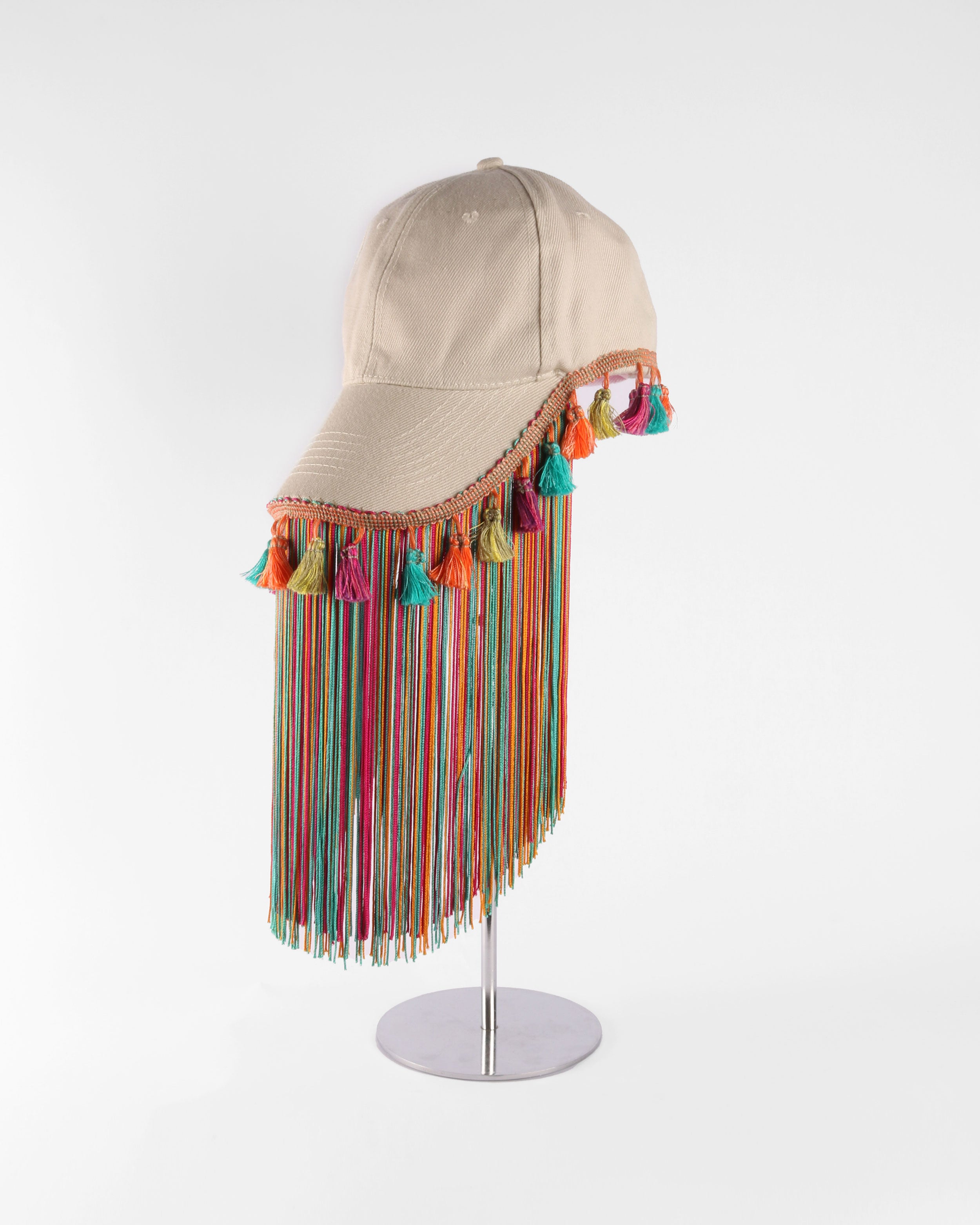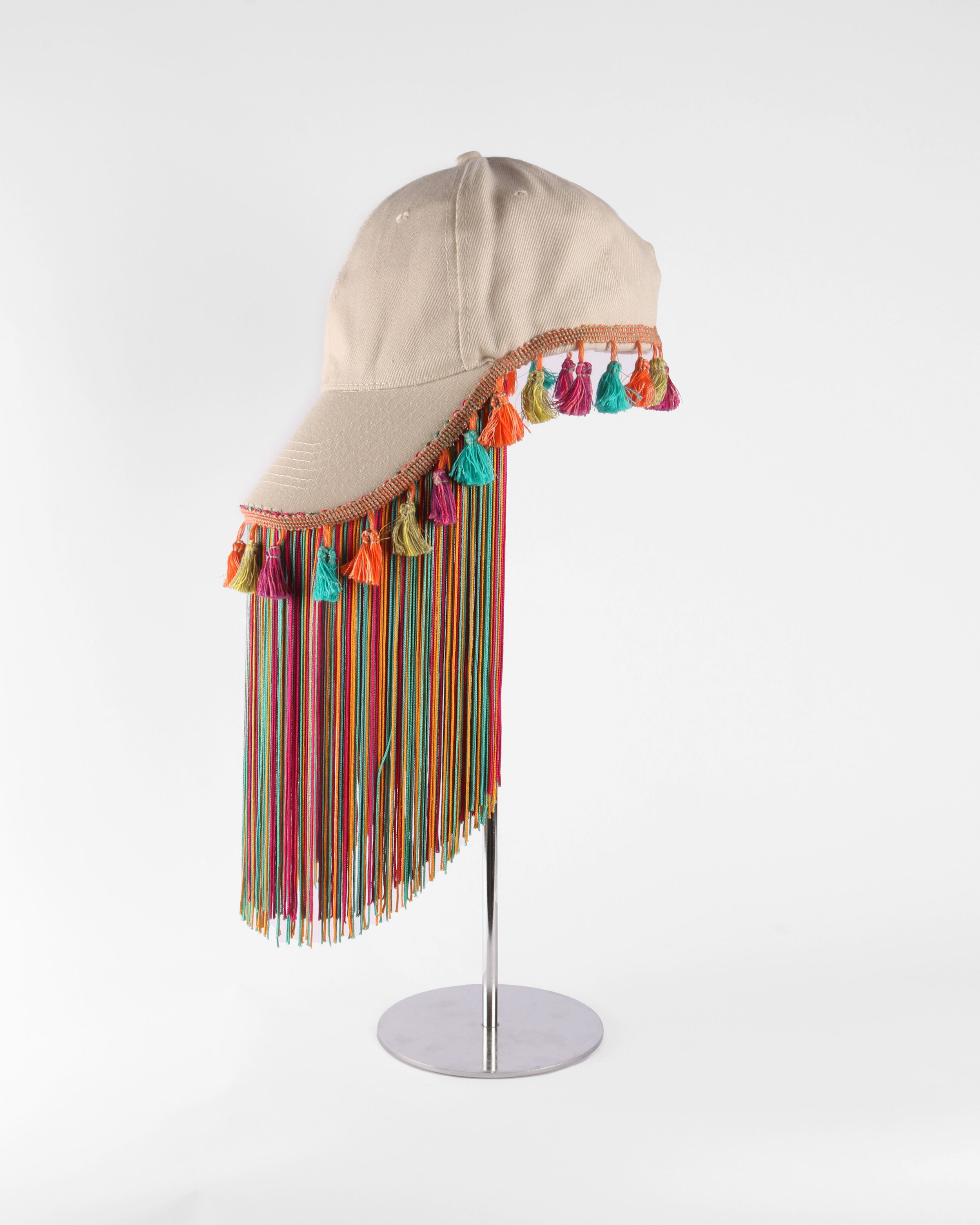 An upcycled cap reimagined through intricate detailing. Handmade and adorned with layered tassels and textured fringes. This piece carries a bold, expressive character, transforming a casual silhouette into a statement accessory.