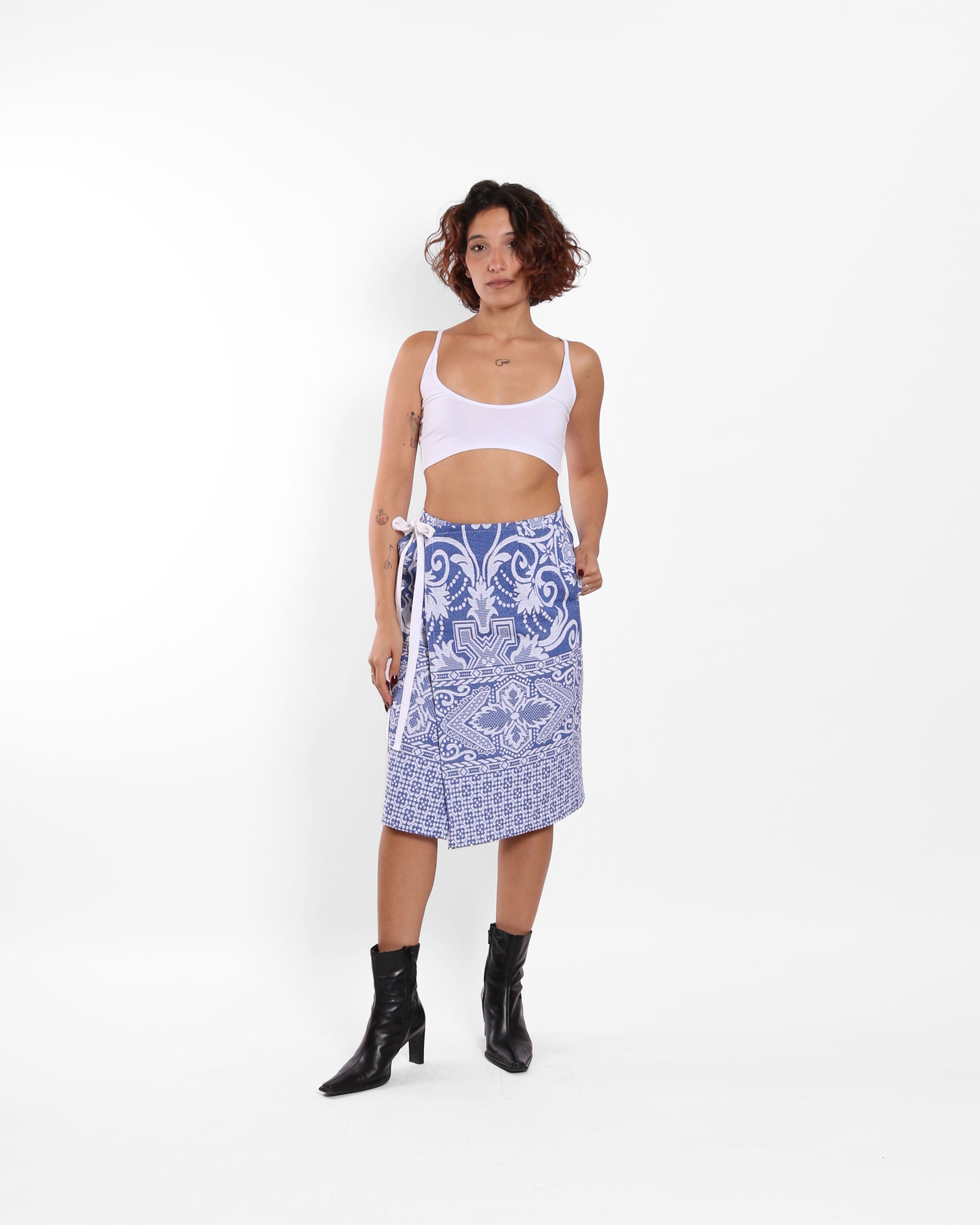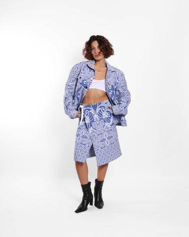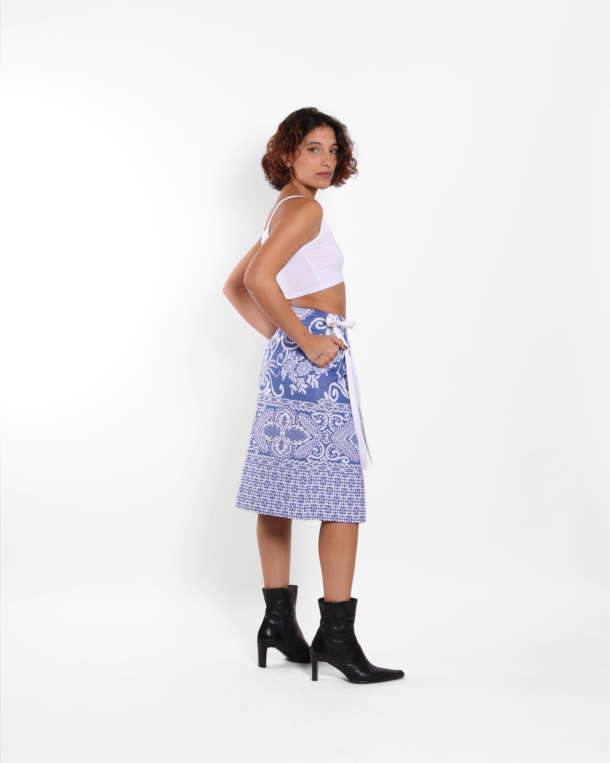 A wrap skirt made from up-cycled Jacquard woven cotton bedsheets, featuring a straight cut that ties at the waist with a ribbon. The structured fabric holds its shape while allowing for soft movement, blending utility with elegance.