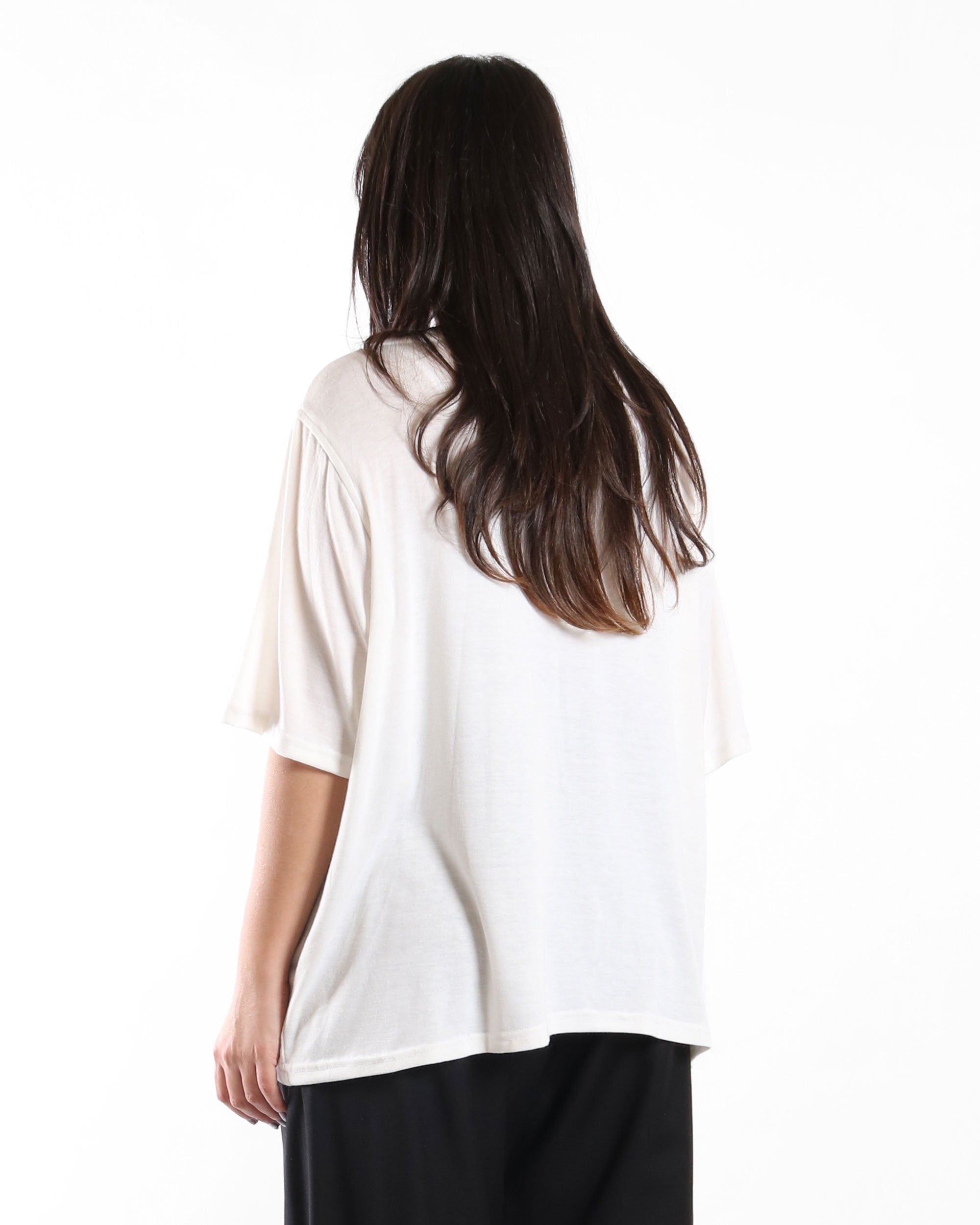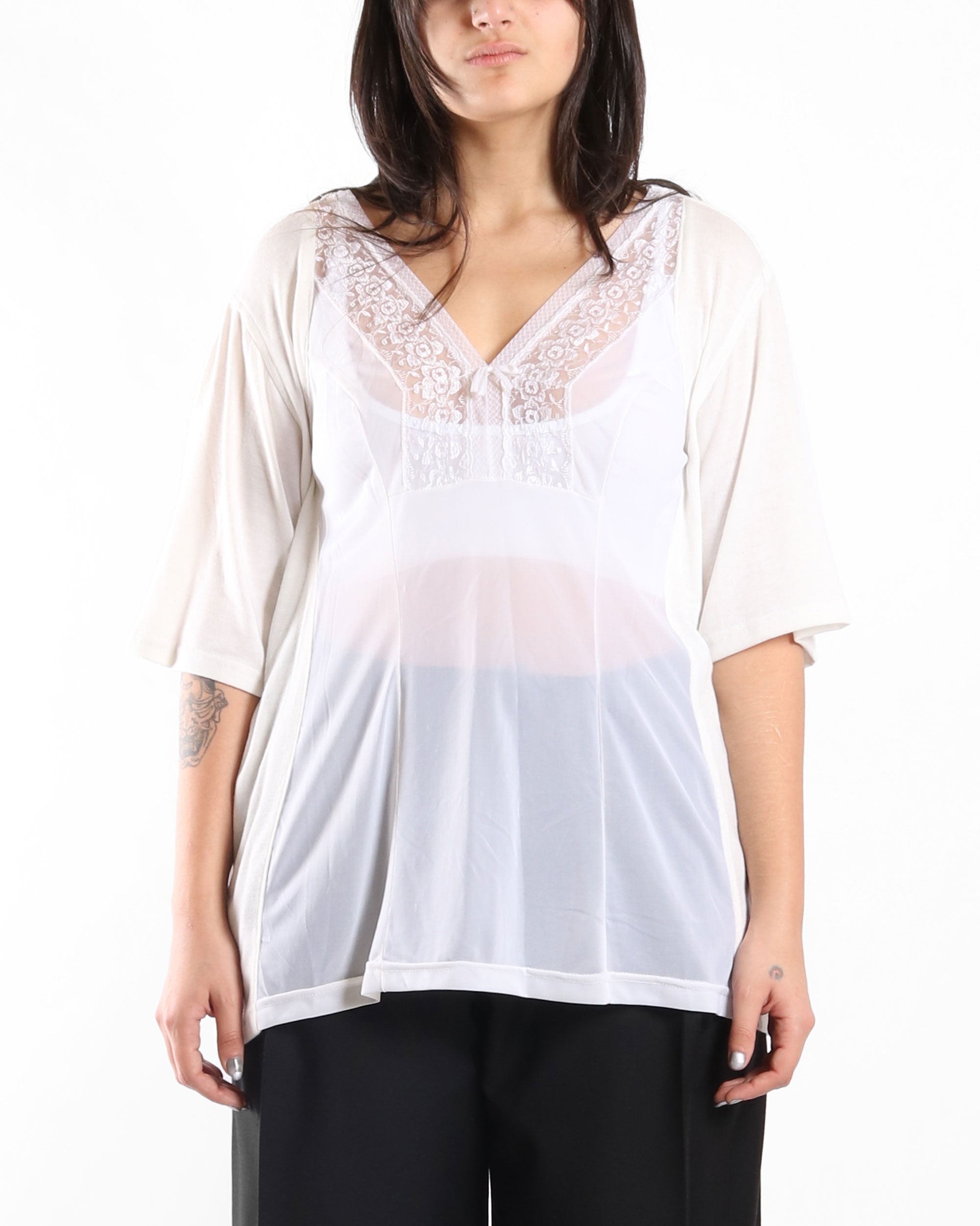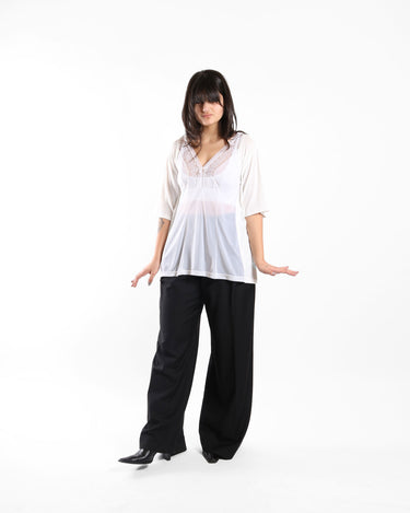 This piece combines the delicacy of a lace-trimmed slip with the relaxed structure of a T-shirt silhouette. Fluid, slightly oversized, and effortlessly draped, it blurs the line between intimate wear and outerwear, designed to be layered or worn unapologetically on its own.