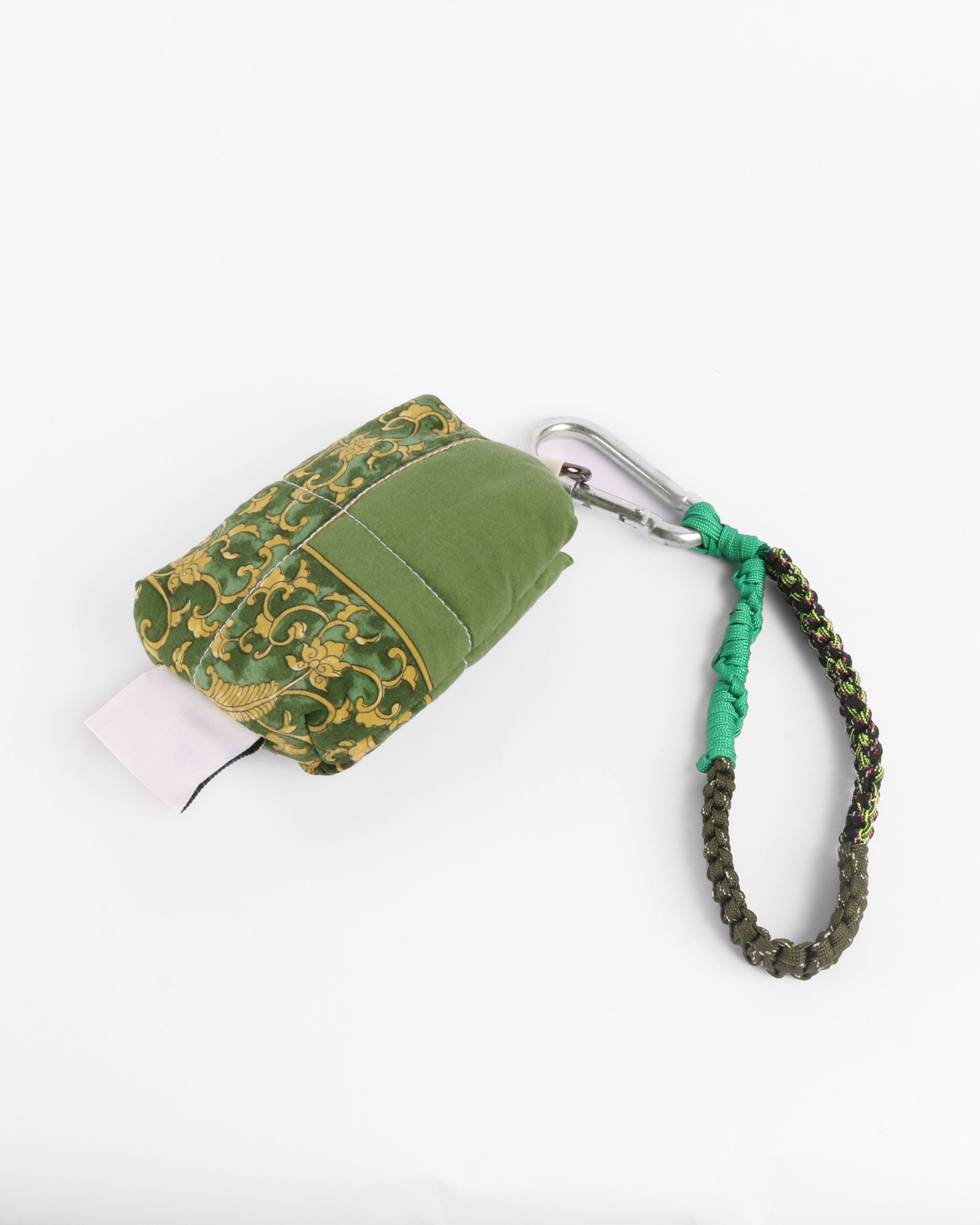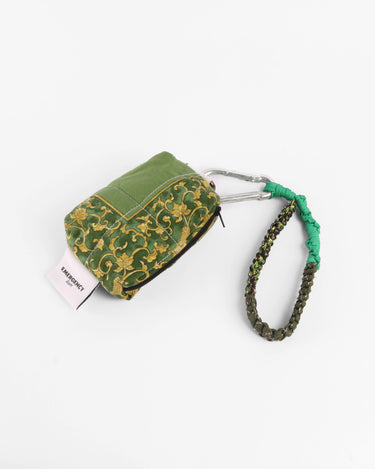 A mini pouch crafted from up-cycled fabrics. Features a compact silhouette with a hand-made macramé strap and a repurposed metal buckle, designed to clip onto pants or bags for effortless wear.