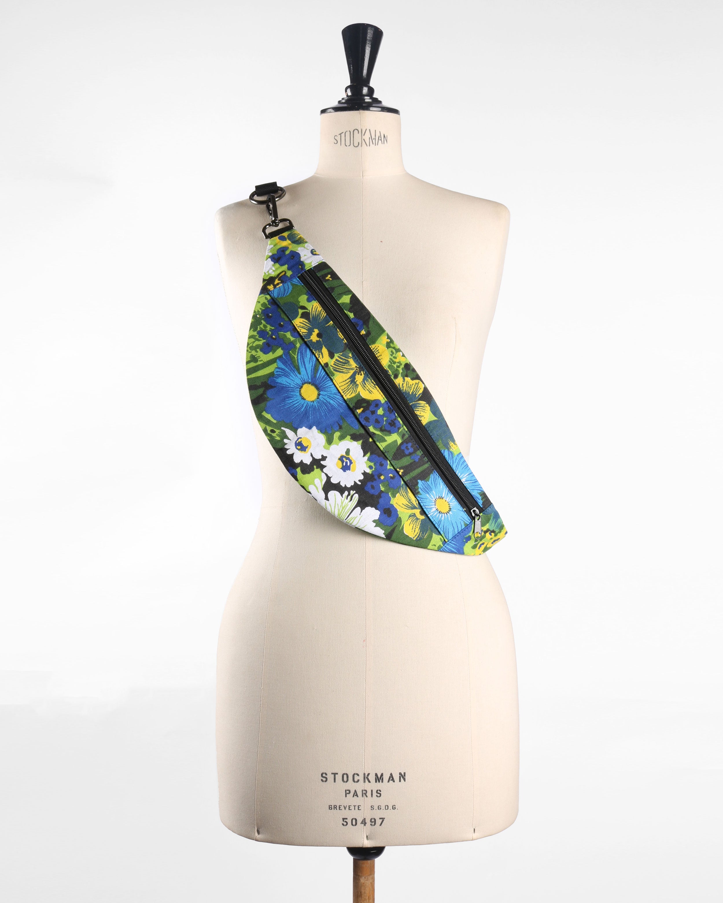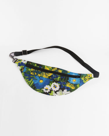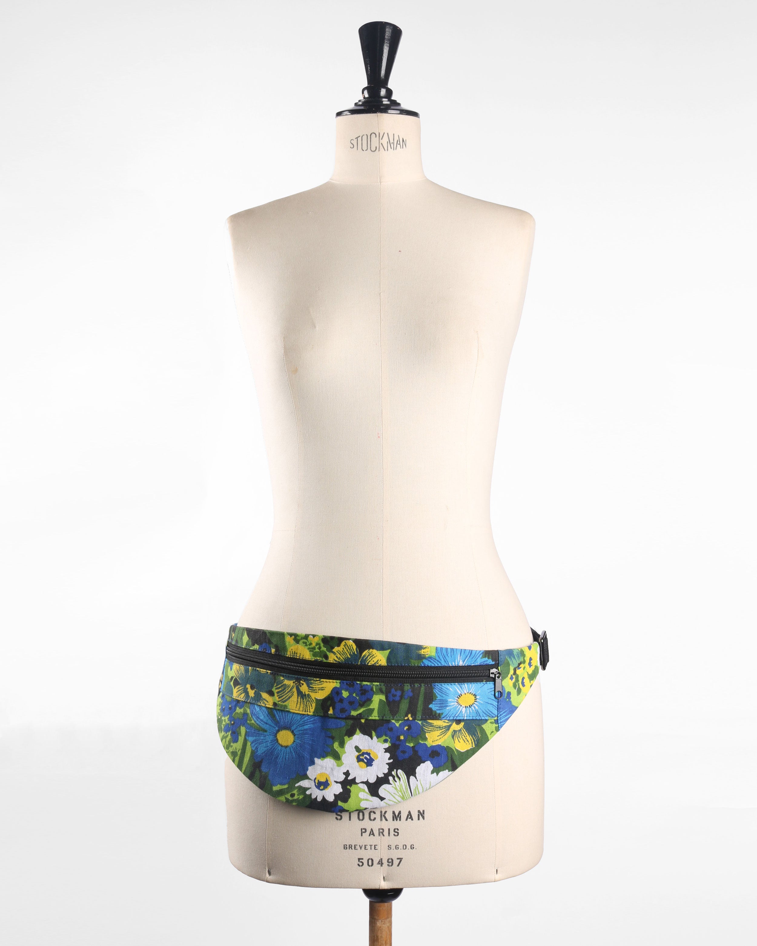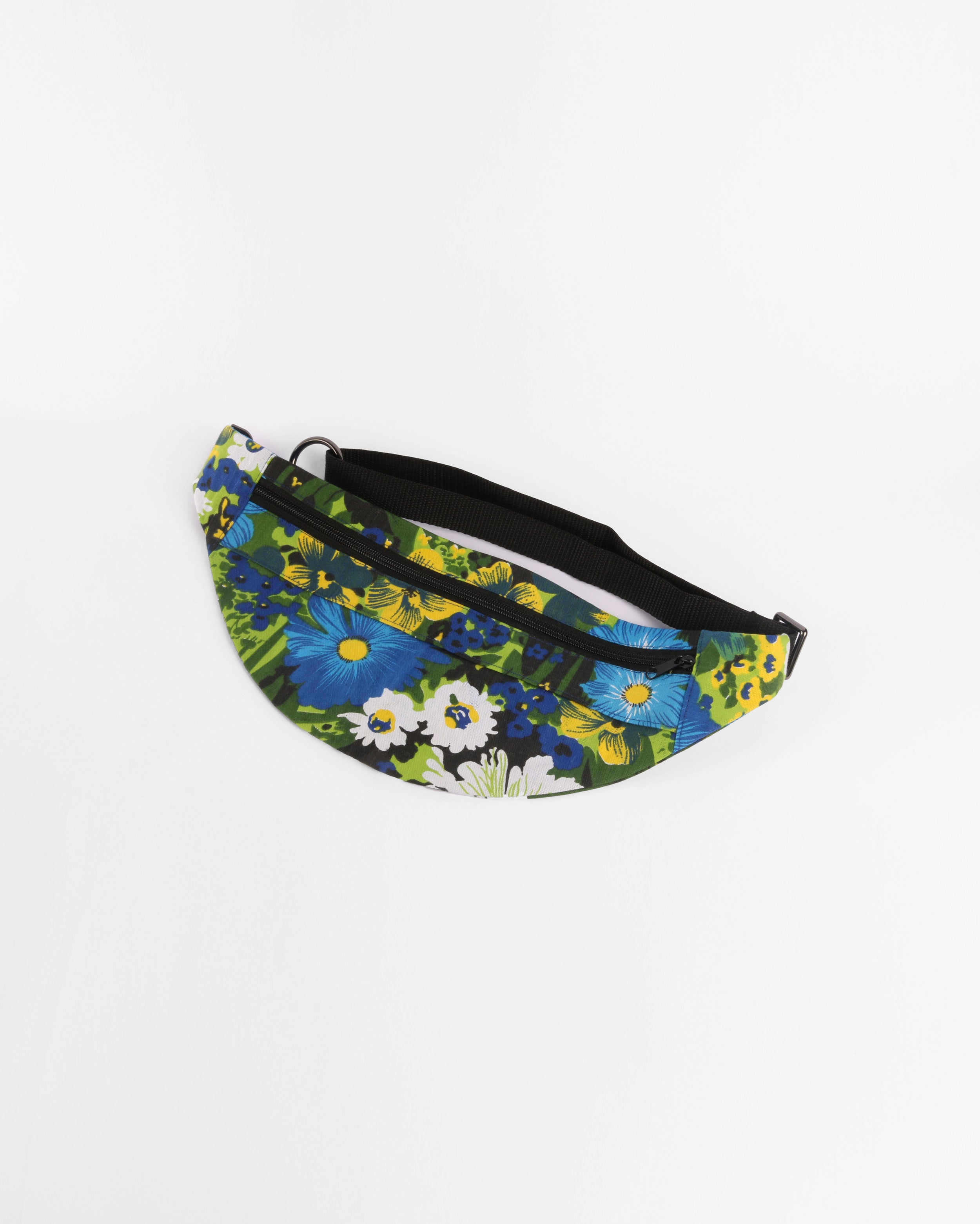 A fanny bag crafted from vibrant floral fabric, designed to sit seamlessly at the waist or crossbody. Features a sleek front zip pocket for easy access and secure storage, finished with durable metal hardware and an adjustable strap (min 85 cm – max 115 cm) for a customizable fit.