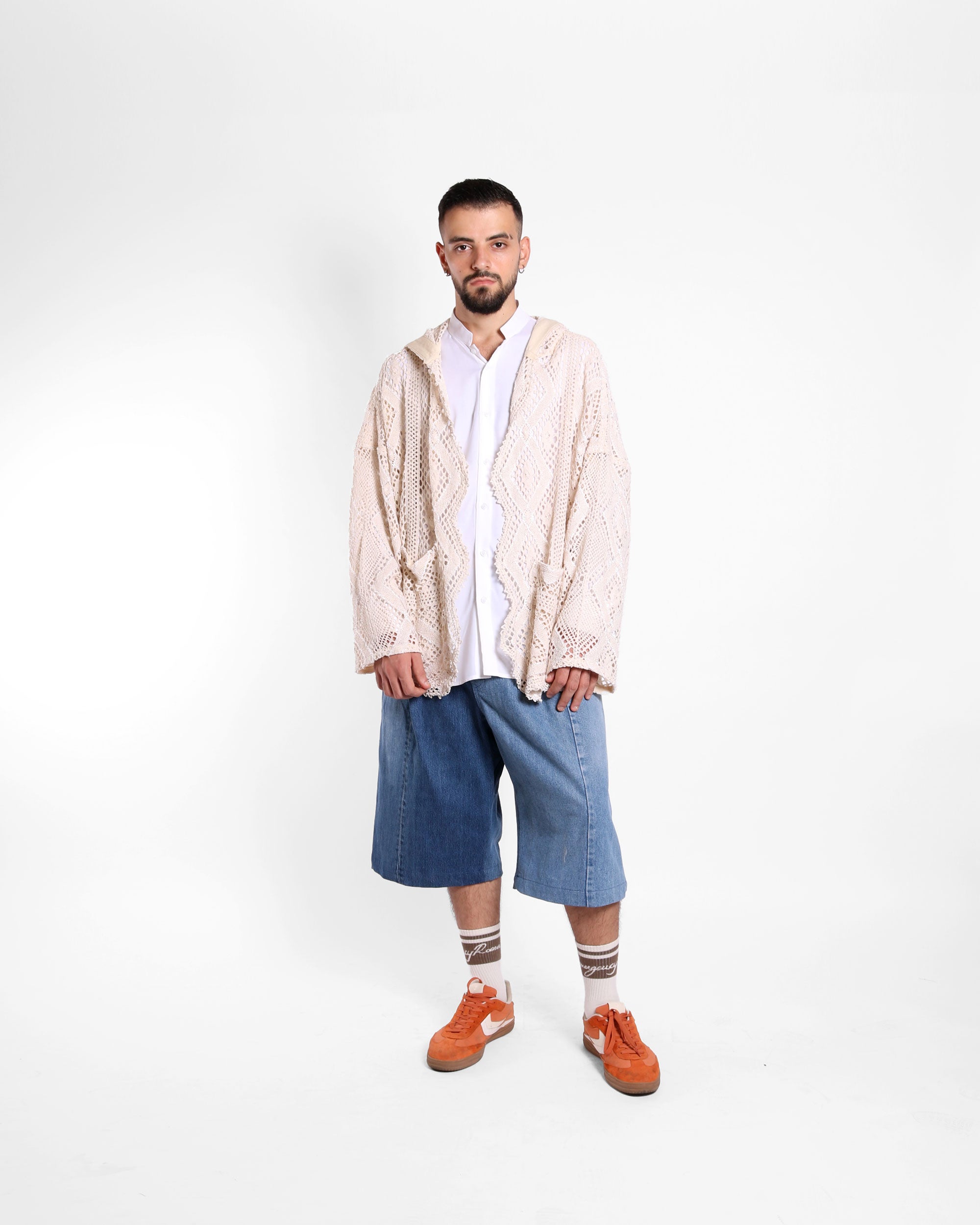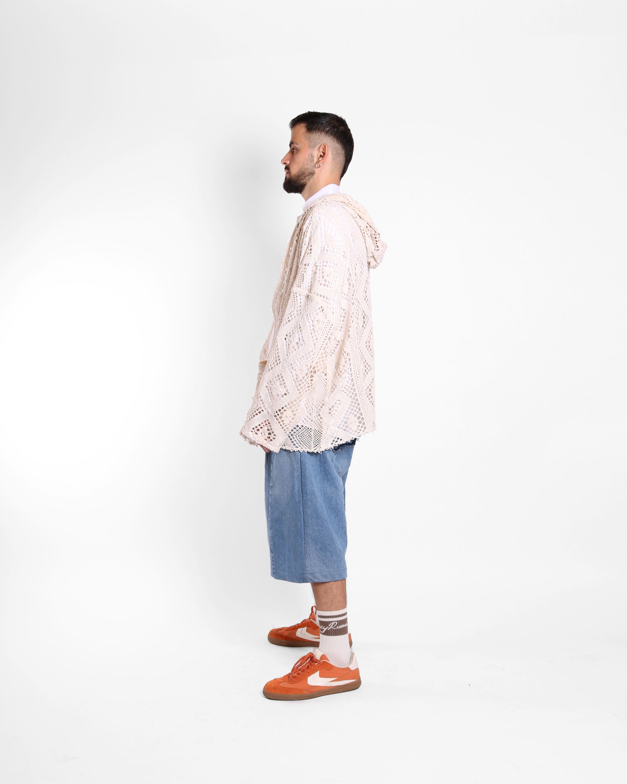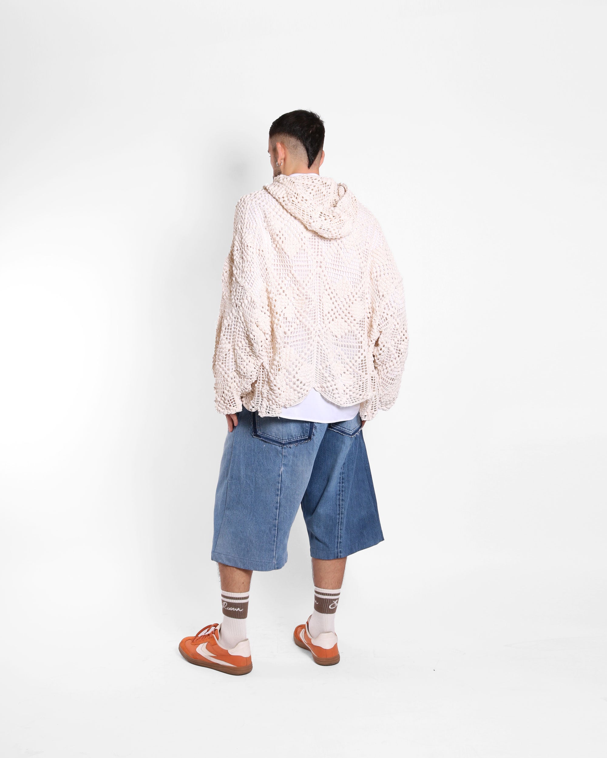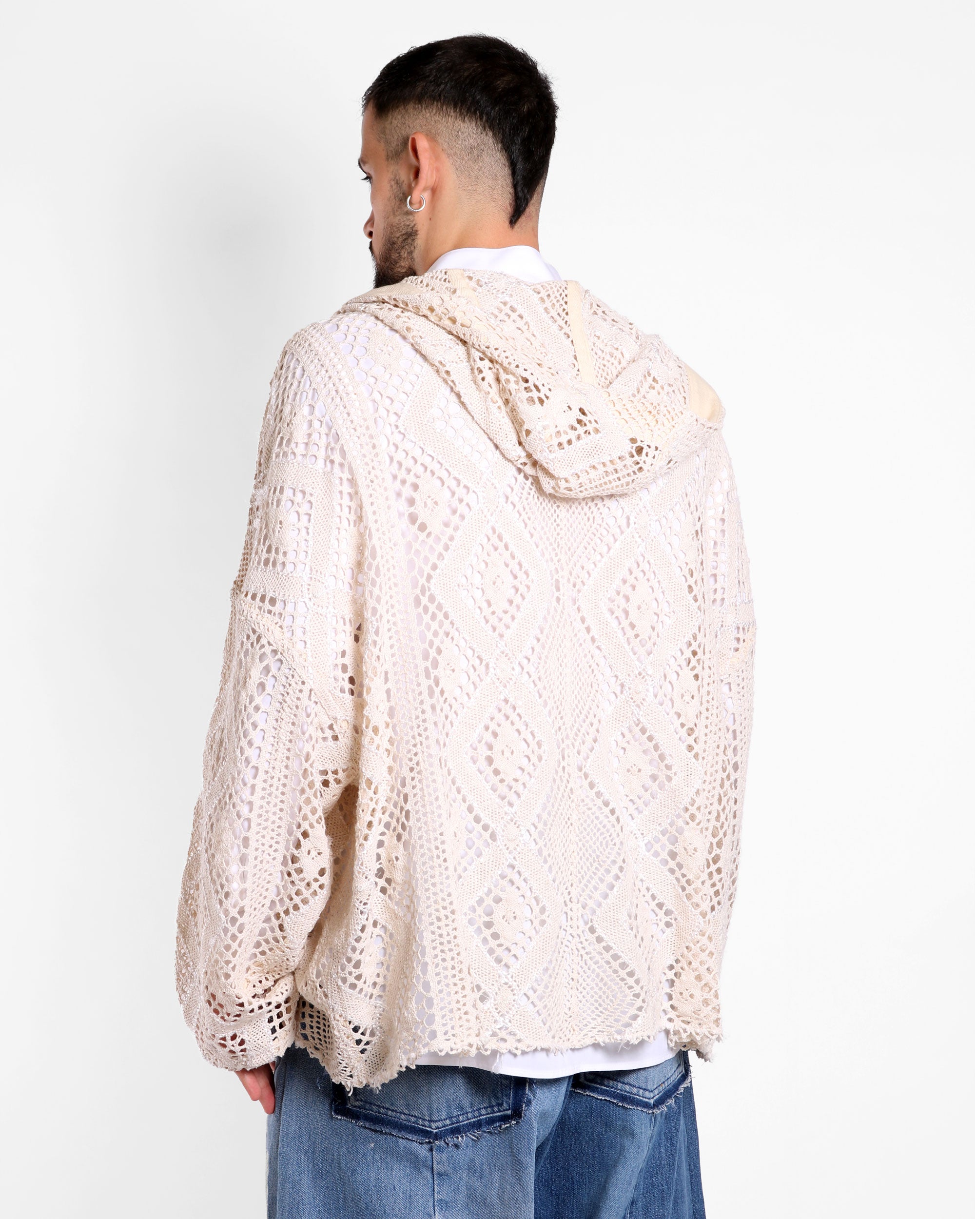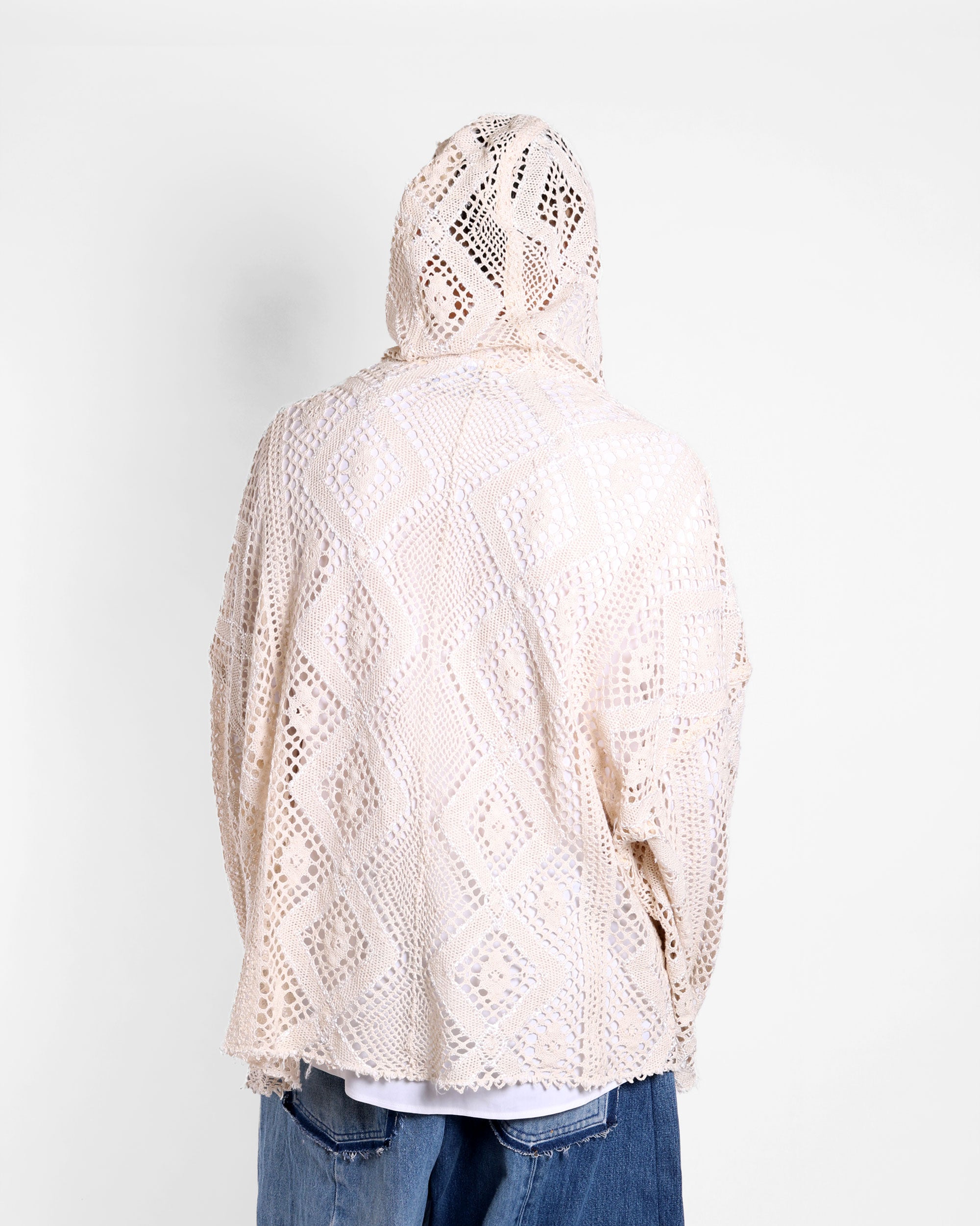 A hooded cardigan crafted from up-cycled crochet throws, transformed into a relaxed layer that blurs the line between home and street.