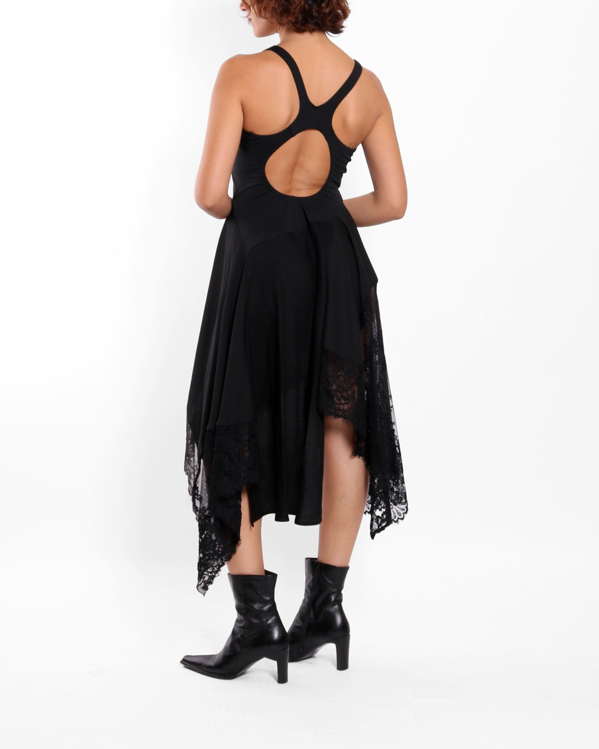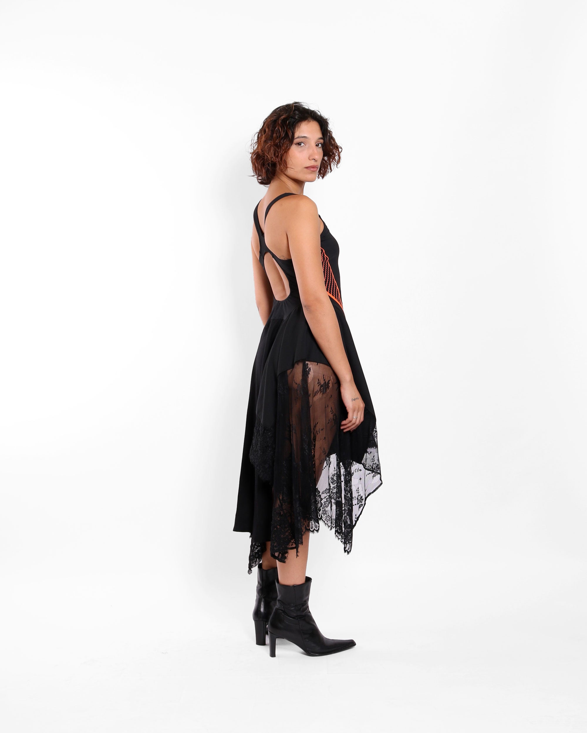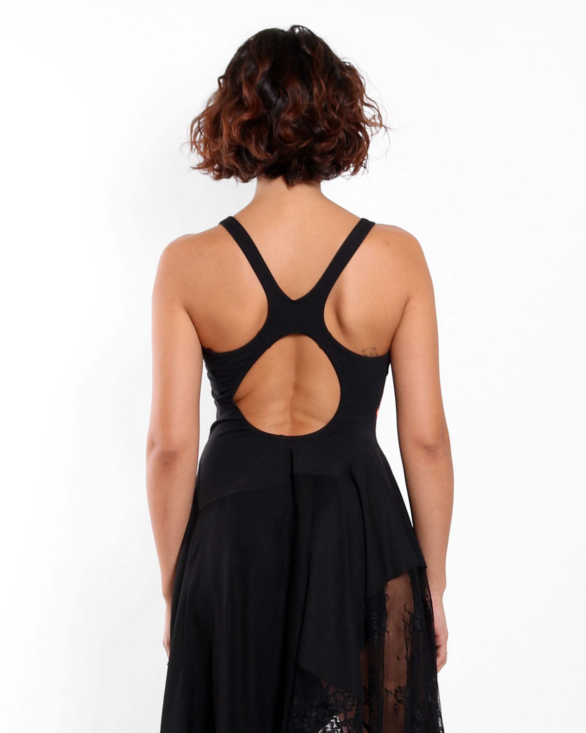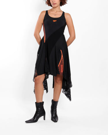 A reconstructed dress crafted from an up-cycled Speedo one-piece swimsuit, combined with leftover black fabric to create a bold, sculptural silhouette. Its body hugging upper panel contrasts with the fluid lower section, blending sportswear with elegance. An unexpected mix of textures turns this piece into a statement on transformation — athletic, sleek, and unmistakably unique.