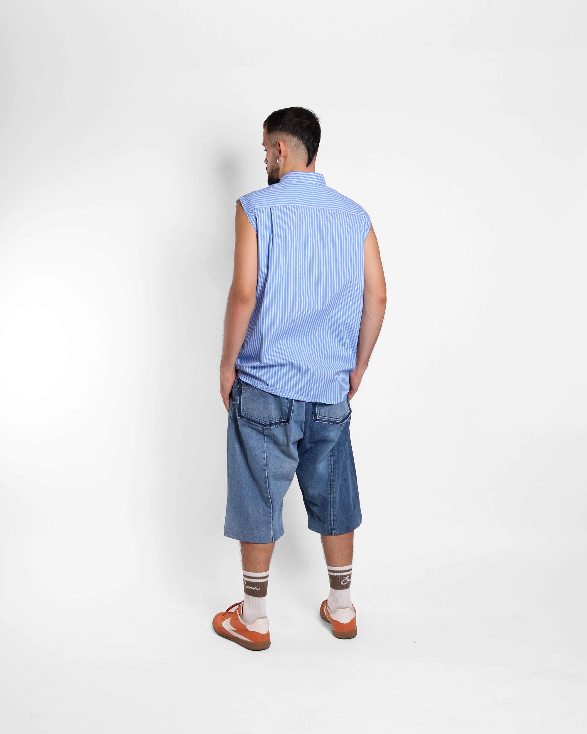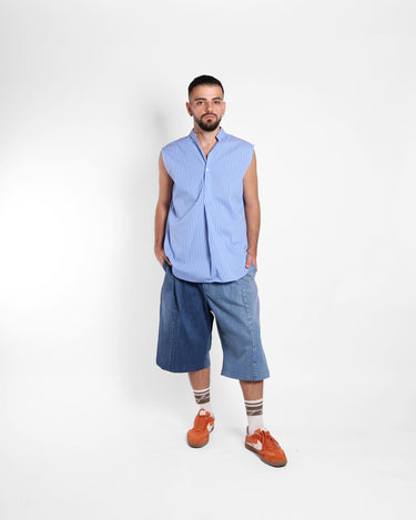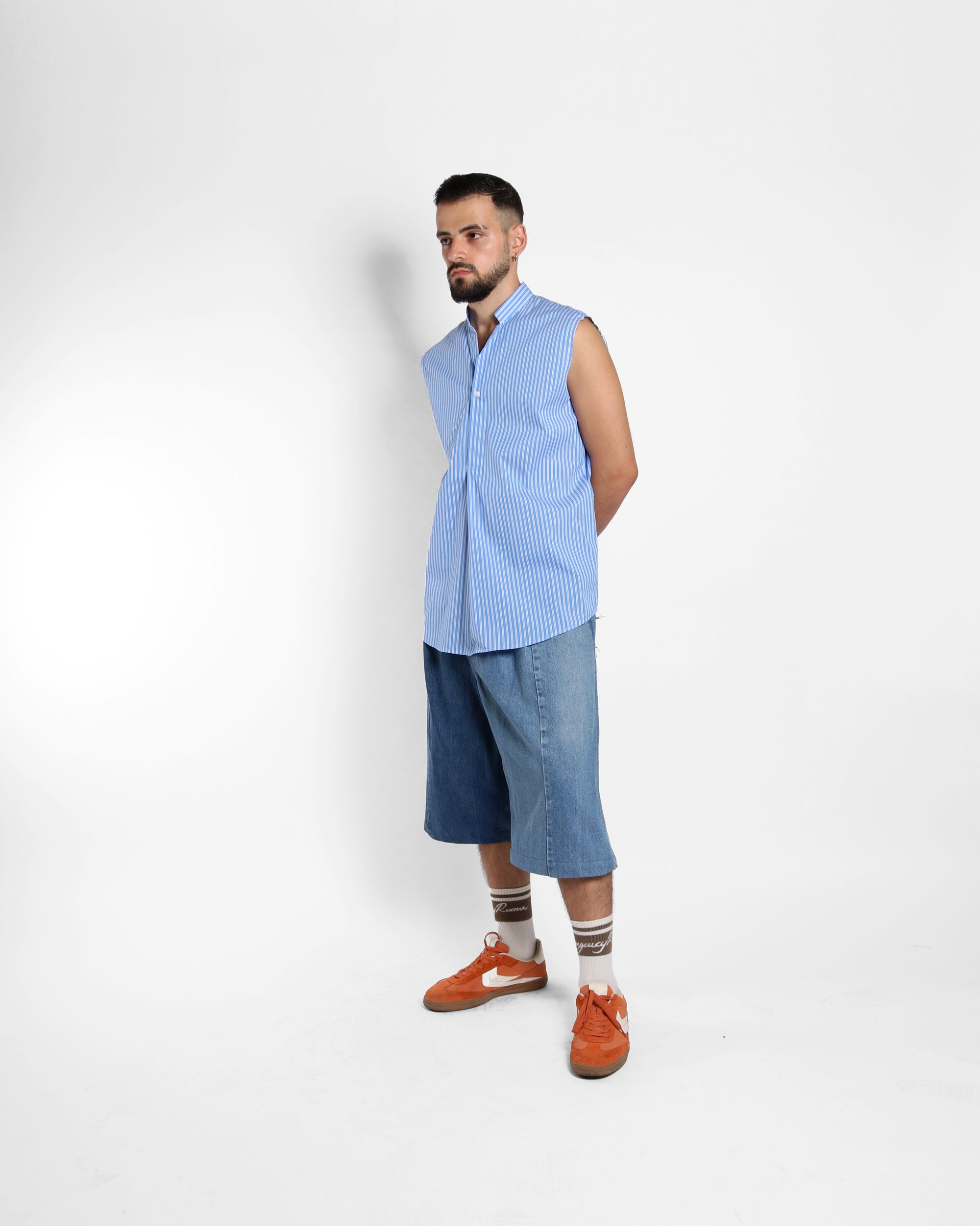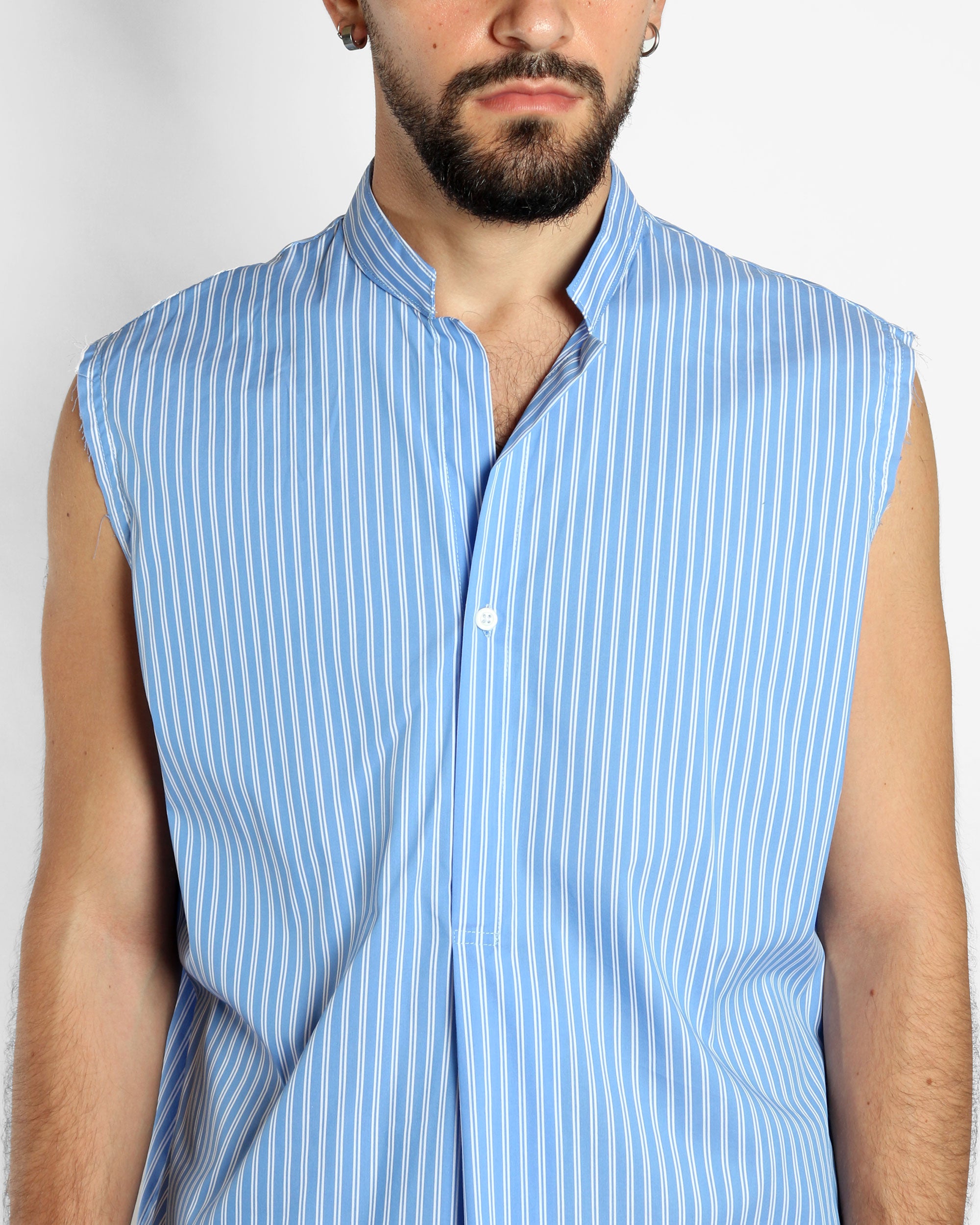 A sleeveless tunic deadstock striped poplin. It falls gently over the body with an easy silhouette and a clean mandarin collar, ideal for warmer days or layering with structure.
